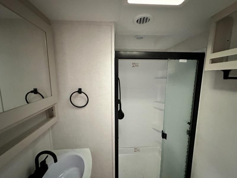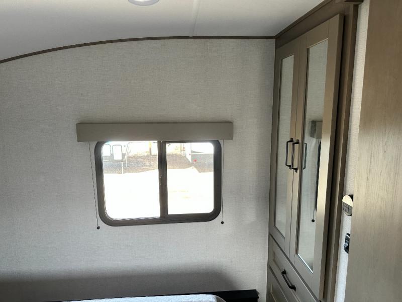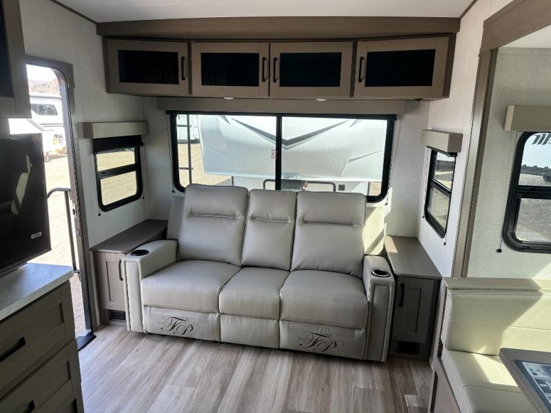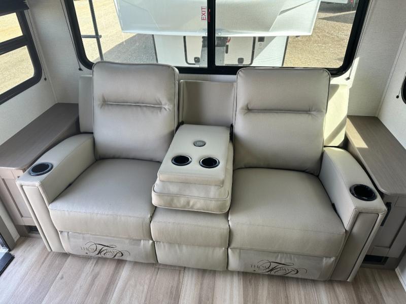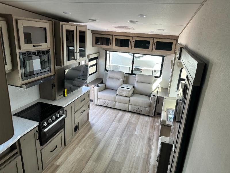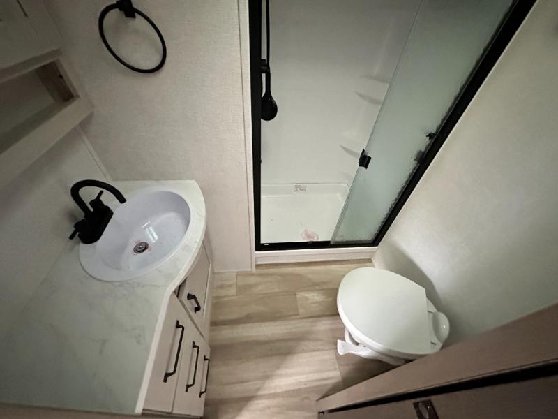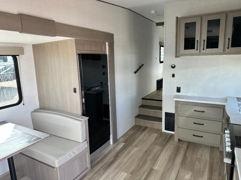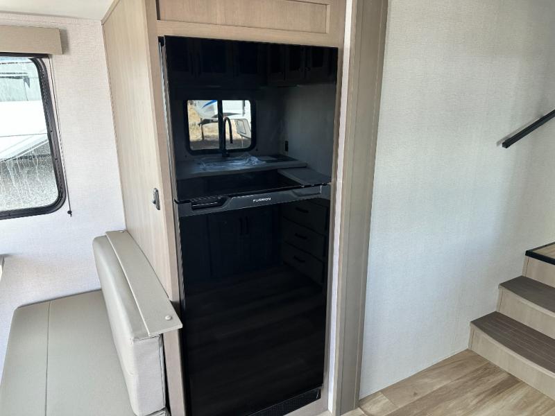 This is the perfect couple's trailer with a space for an overnight guest or two little ones on the booth dinette. You can switch out this dinette for an optional swivel dinette as well, and the standard theater seating can be replaced by an optional trundle bed if you need more sleeping space. A 40" HDTV will keep you entertained when the weather isn't cooperating, and you can whip up your best meals in the full kitchen. And a 19' power awning will provide shade if you choose to take your plate outdoors! The spacious full bath will let you clean up each day, and you'll feel right at home in the front private bedroom with a queen bed!