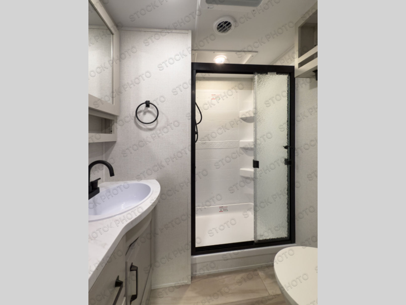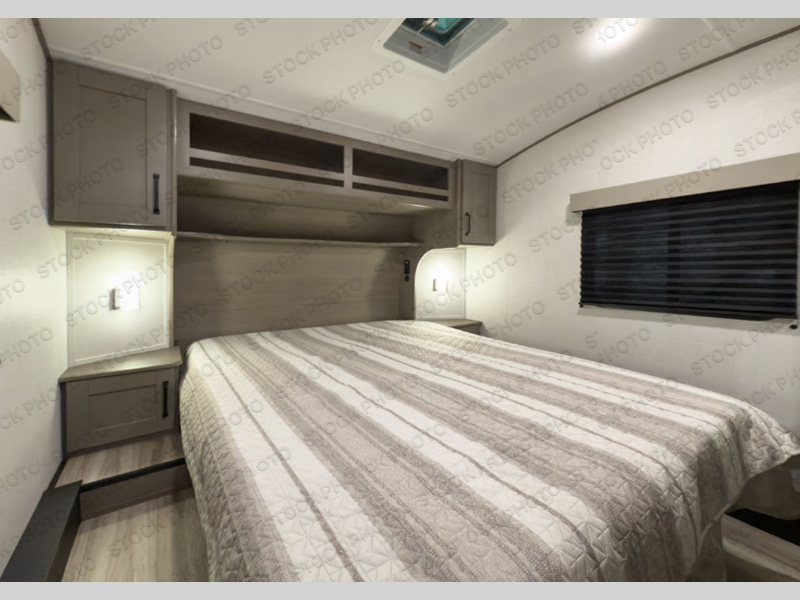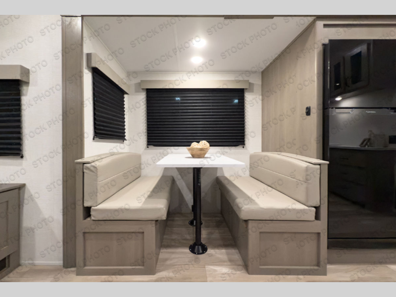 This is the perfect couple's trailer with a space for an overnight guest or two little ones on the booth dinette. You can switch out this dinette for an optional swivel dinette as well, and the standard theater seating can be replaced by an optional trundle bed if you need more sleeping space. A 40" HDTV will keep you entertained when the weather isn't cooperating, and you can whip up your best meals in the full kitchen. And a 19' power awning will provide shade if you choose to take your plate outdoors! The spacious full bath will let you clean up each day, and you'll feel right at home in the front private bedroom with a queen bed!