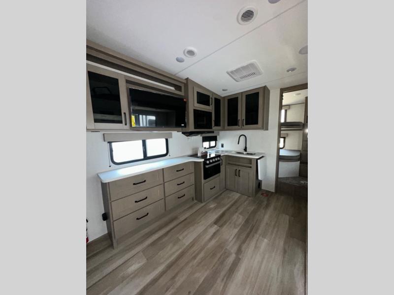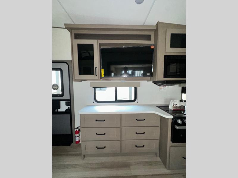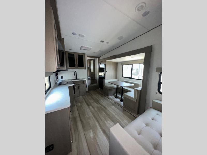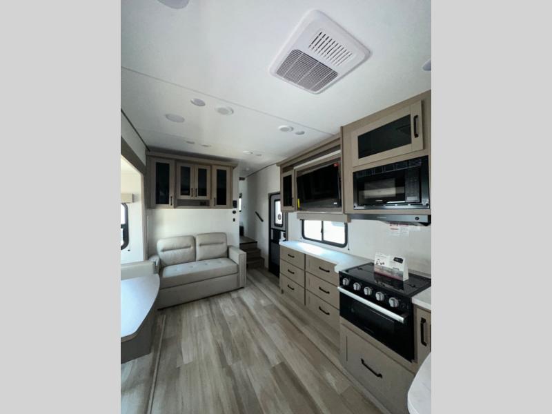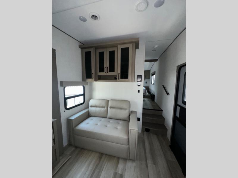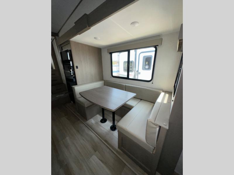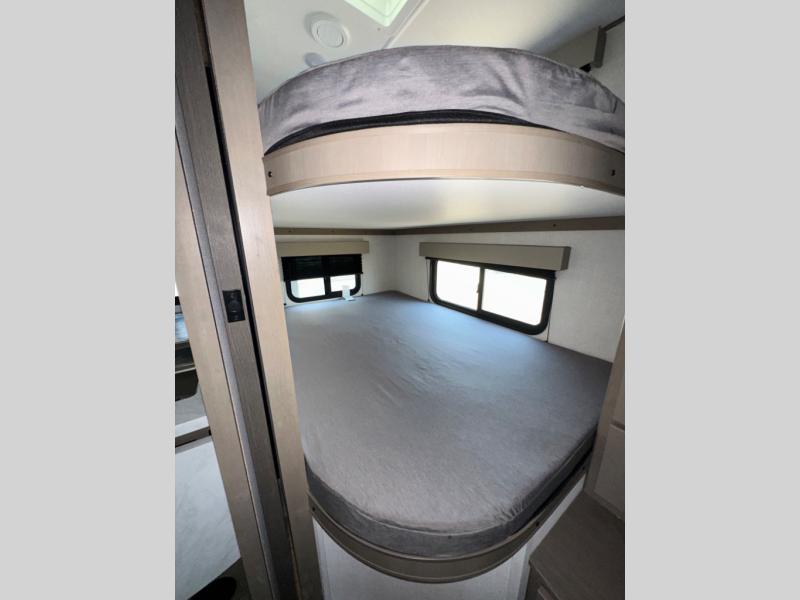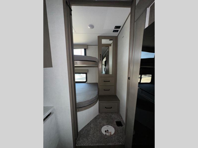 Camping with friends and family just got a whole lot easier in this fifth wheel with double-size bunks and a front private bedroom. Your guests will also have a wardrobe to keep their things tidy, and the bedroom closet will be perfect for your things. If you have other guests stay over, they can sleep on the U-shaped dinette within the slide out or the tri-fold sofa, and there is a 40" high-definition LED TV here to keep everyone entertained on rainy days. Everyone can take turns cleaning up in the full bath that includes a residential walk-in shower, a power vent fan, plus a large vanity top with a deep sink. And you will feel right at home in the front private bedroom with its queen bed, overhead cabinets, and TV prep if you'd like to add a television!