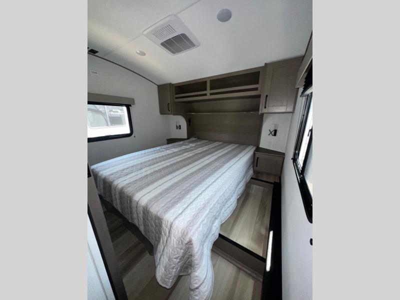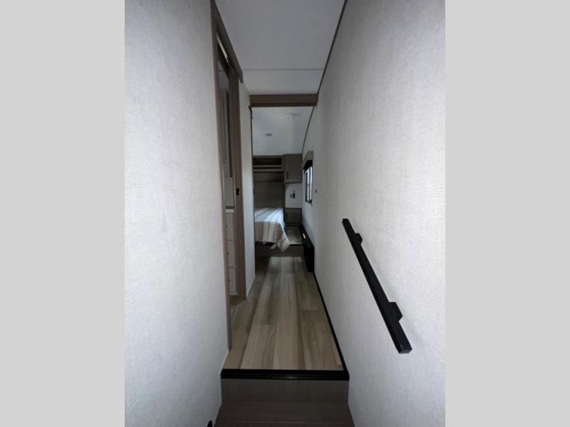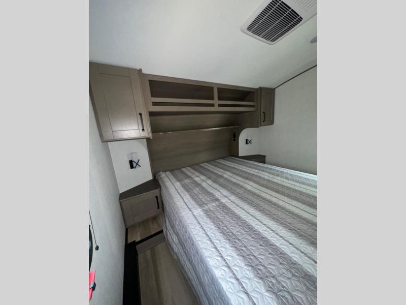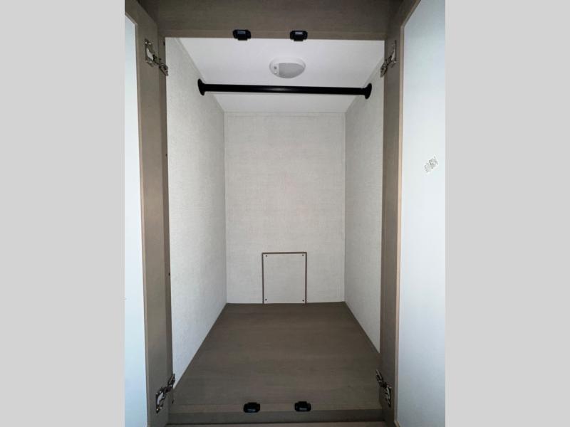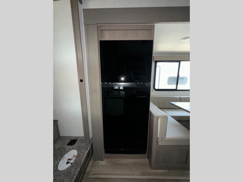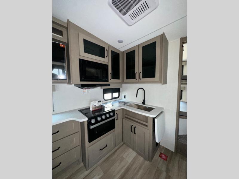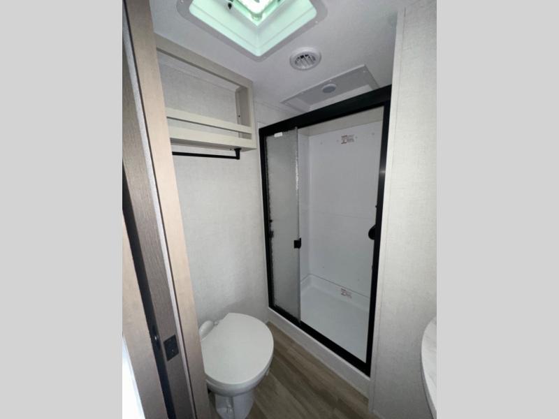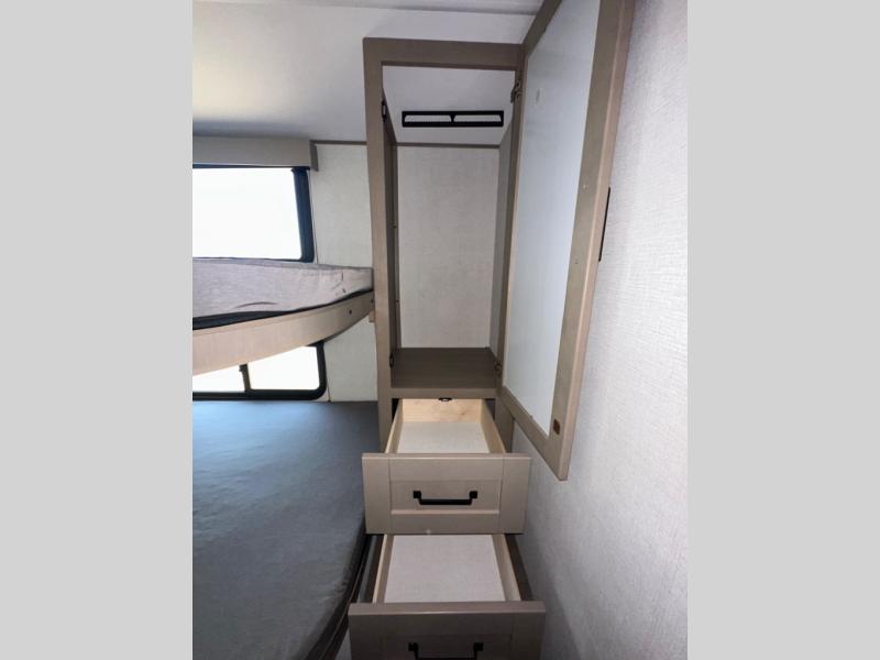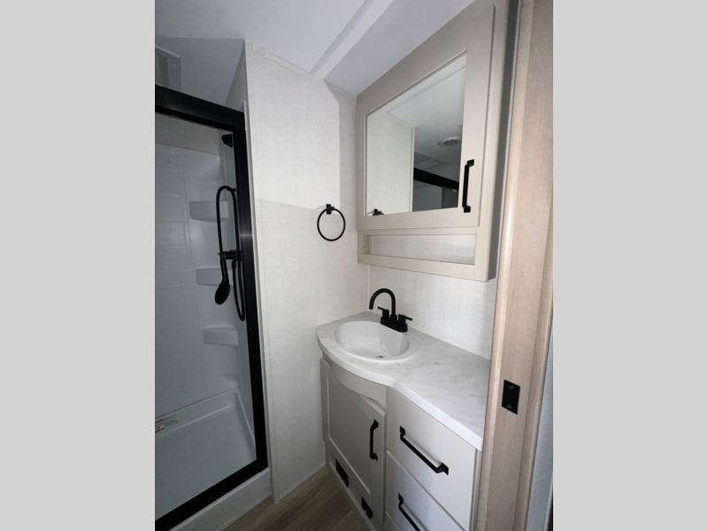 Camping with friends and family just got a whole lot easier in this fifth wheel with double-size bunks and a front private bedroom. Your guests will also have a wardrobe to keep their things tidy, and the bedroom closet will be perfect for your things. If you have other guests stay over, they can sleep on the U-shaped dinette within the slide out or the tri-fold sofa, and there is a 40" high-definition LED TV here to keep everyone entertained on rainy days. Everyone can take turns cleaning up in the full bath that includes a residential walk-in shower, a power vent fan, plus a large vanity top with a deep sink. And you will feel right at home in the front private bedroom with its queen bed, overhead cabinets, and TV prep if you'd like to add a television!