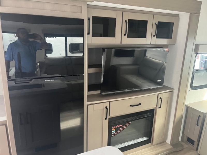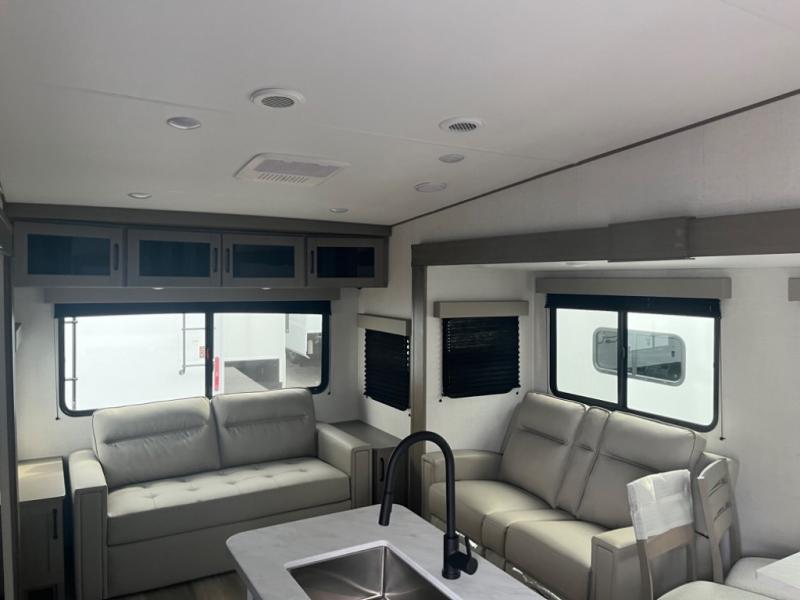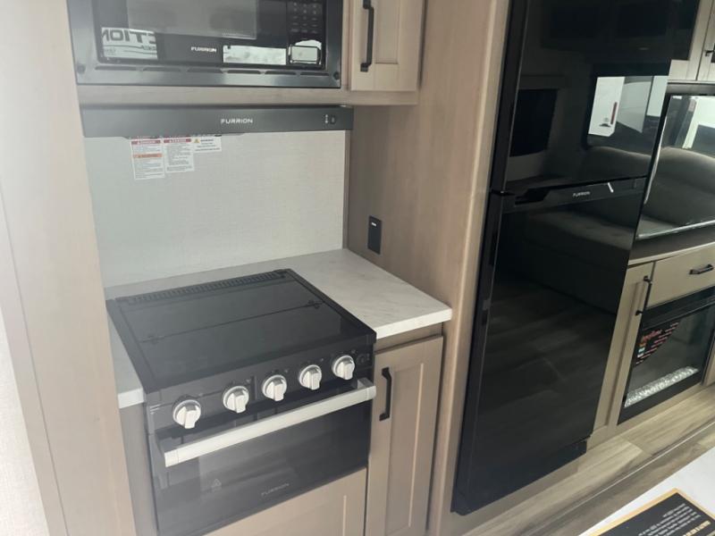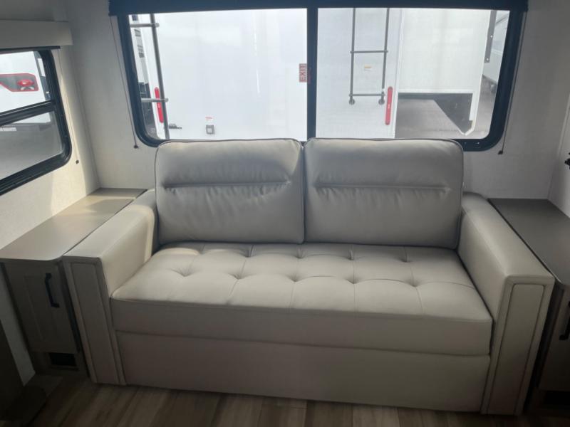 You'll love the amount of space you have in this fifth wheel thanks to the dual opposing slides in the rear living area/kitchen. Your friends and family can relax on the tri-fold sofa or theater seating across from the high-definition 40" LED TV. There is also a booth dinette or you can choose the optional swivel dinette if you prefer that seating. The chef of your group will appreciate having a kitchen island that will provide more counter space, plus there is a hutch with overhead cabinets for nice dishes. A full bath onboard lets you clean up each day and the front private bedroom includes a queen bed just like at home. You'll also love spending time outdoors under the electric awning, and there is an unobstructed pass-thru storage for fishing poles, hiking gear, and camp chairs!