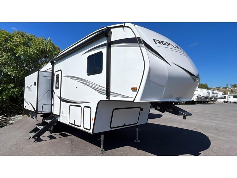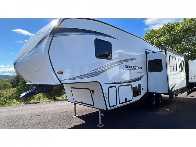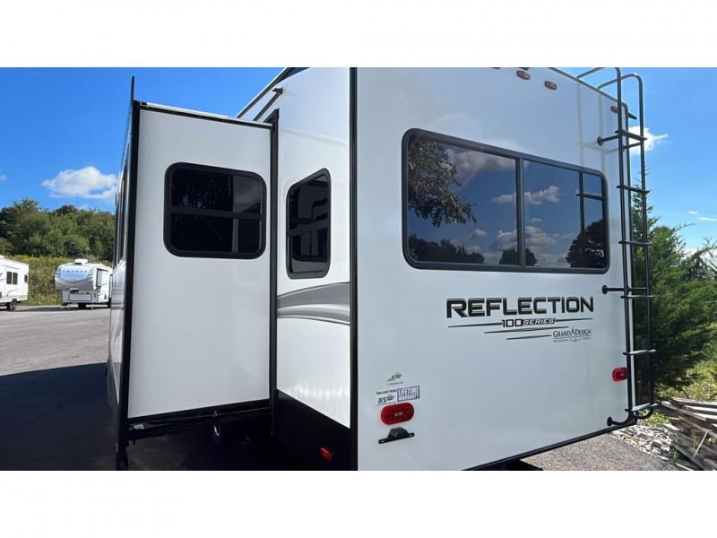 Each Reflection 100 Series fifth wheel by Grand Design is affordable and packed with luxury for unforgettable camping memories! The MorRyde CRE3000 suspension system and Goodyear Endurance tires will provide smooth towing from home to campground. And the solar package with a 180W solar panel, 60 Amp charge controller and 12V refrigerator will allow you to camp for longer periods of time and in more locations! A heated and enclosed underbelly with circulating heat is included in the Arctic 4-Seasons Protection Package, along with a double insulated roof and front cap, and thermofoil insulation under the holding tanks so you can camp all year long if you choose. You will appreciate having an on-demand water heater for hot showers after exploring, and the universal all-in-one docking station will let you monitor your RVs tanks levels and functions with ease. These models also include many luxurious interior features, such as premium Congoleum flooring, pleated shades, residential cabinetry, and matte black fixtures and hardware. Don't let the Reflection 100 Series fifth wheels pass you by!