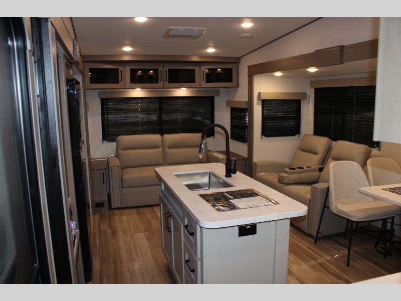 You'll love the amount of space you have in this fifth wheel thanks to the dual opposing slides in the rear living area/kitchen. Your friends and family can relax on the tri-fold sofa or theater seating across from the high-definition 40" LED TV. There is also a booth dinette or you can choose the optional swivel dinette if you prefer that seating. The chef of your group will appreciate having a kitchen island that will provide more counter space, plus there is a hutch with overhead cabinets for nice dishes. A full bath onboard lets you clean up each day and the front private bedroom includes a queen bed just like at home. You'll also love spending time outdoors under the electric awning, and there is an unobstructed pass-thru storage for fishing poles, hiking gear, and camp chairs!