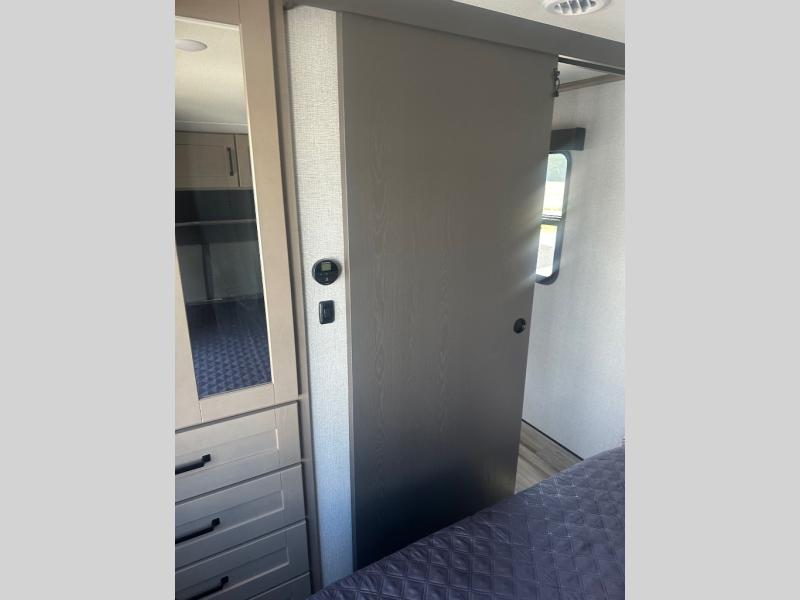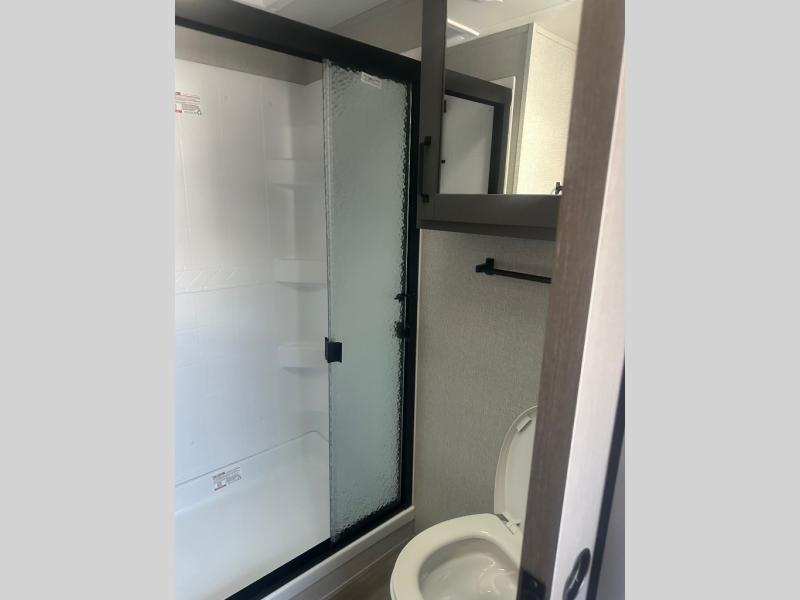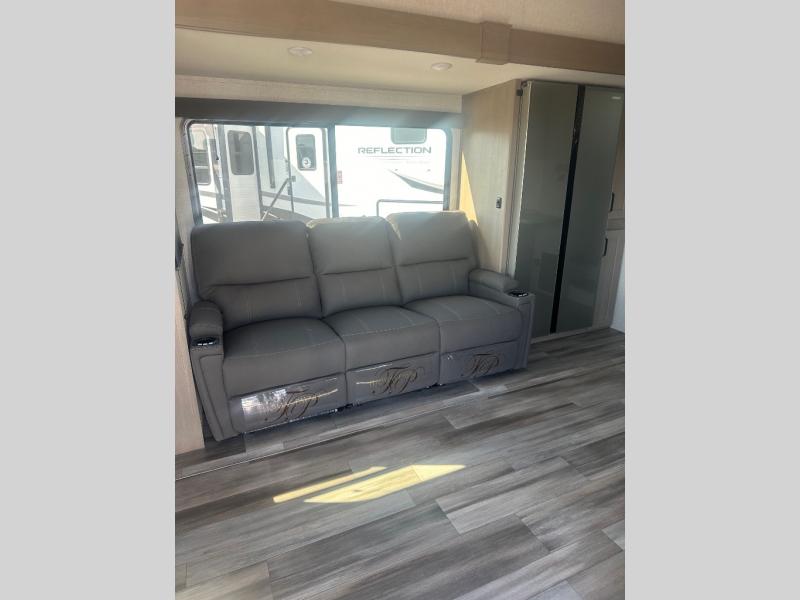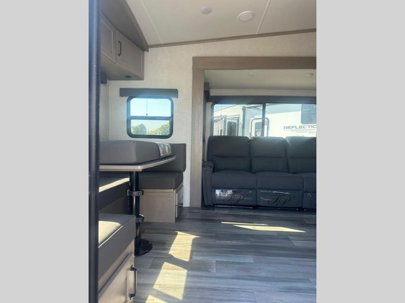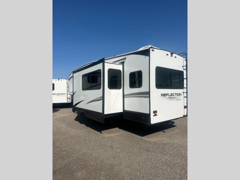 Feel right at home in this Reflection 150 Series with a private bedroom that includes a walk-around queen bed with storage on each side, windows, and a space savings sliding door. The full bathroom offers a walk-in shower, storage for your linens and a sliding door for easy access. When you get hungry, the cook will have an L-shaped kitchen area to make meals, plus full amenities including a 30" microwave, a flip-up counter extension, a pantry for your dry goods and a 16 cu. ft. refrigerator to store lots of food and cold beverages. You can dine at the rear U-shaped dinette lounge and enjoy the view out of all the windows or outside under the 18' electric awning. And the 78" theatre seating will be a nice place to relax and watch the 40" LED HDTV.