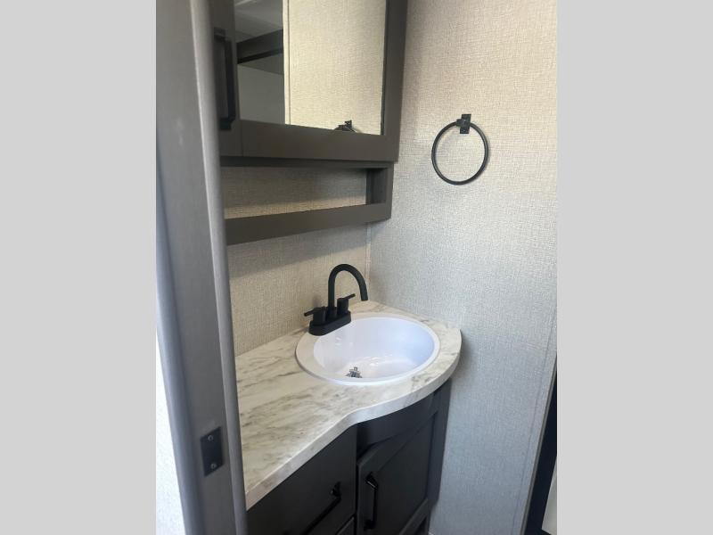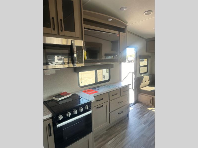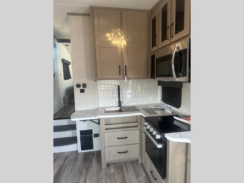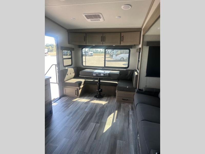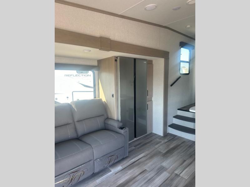 With any Reflection 150 Series fifth wheel by Grand Design, there is more available payload capacity and a broader range of half-ton trucks capable of towing this fifth wheel, and no slider hitch is needed thanks to the 90-degree turning radius which makes them short bed friendly and easier to tow. The mandatory Ultimate Power package provides a "One-Touch" automatic leveling system and a detachable power cord with LED light for easy setup, plus motion sensor pass-through lighting and entry lighting, and the Tire Linc TPMS will help you stay safe on the road. The interior offers residential luxury from the cabinetry and premium congoleum flooring, plus the booth dinette to the residential-style window treatment. Make your refined decision today!