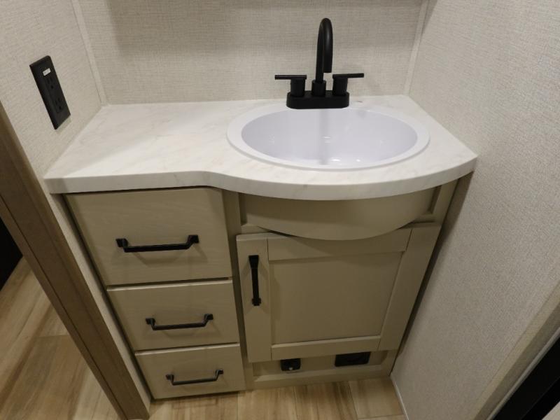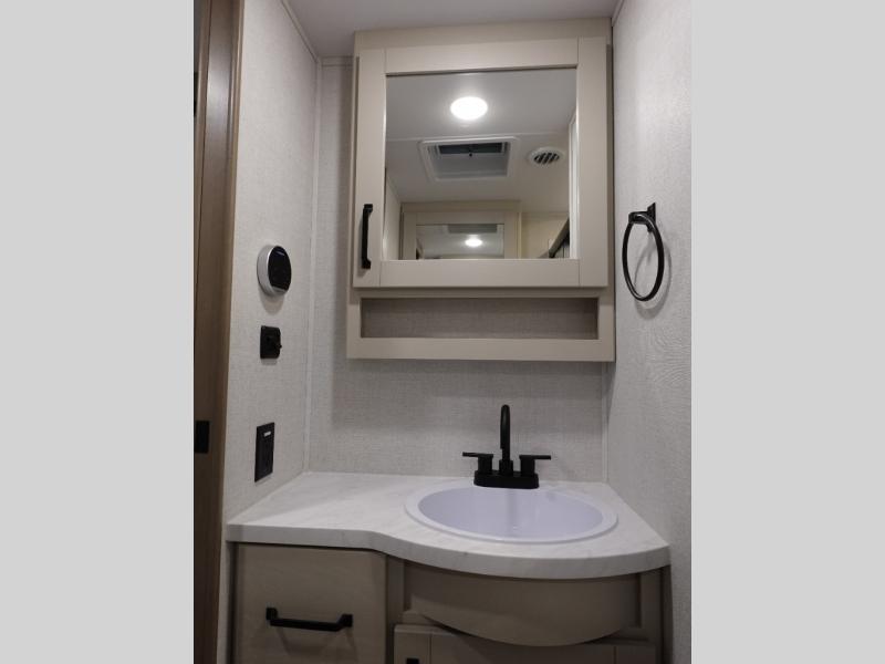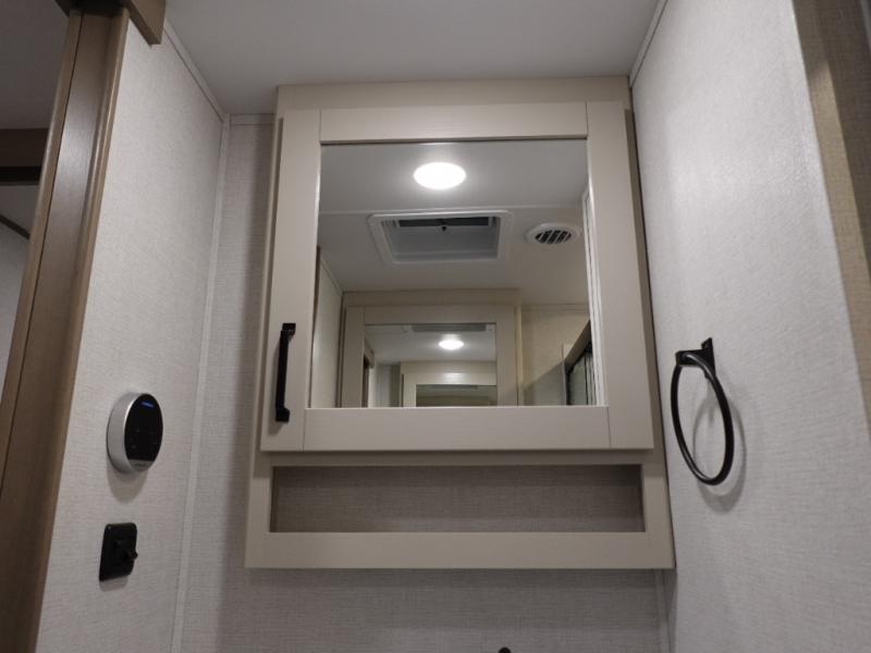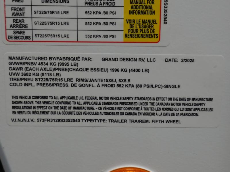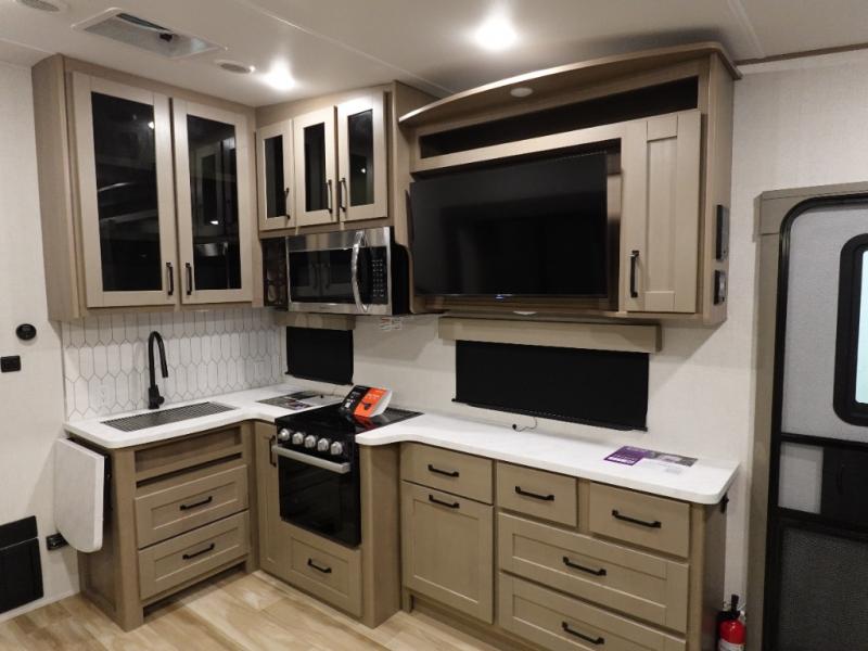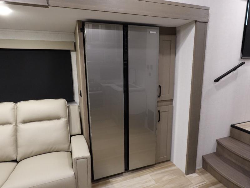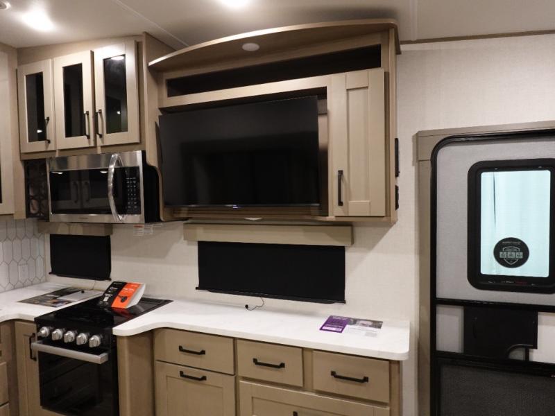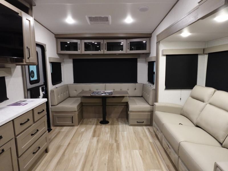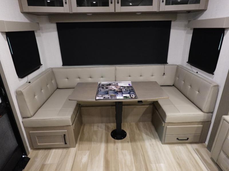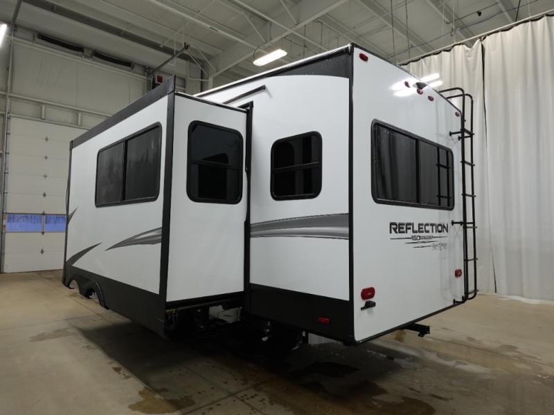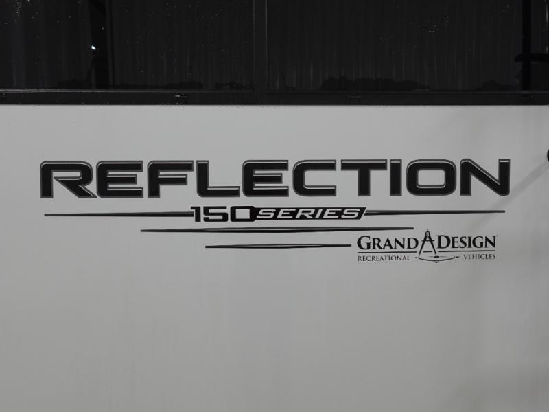 With any Reflection 150 Series fifth wheel by Grand Design, there is more available payload capacity and a broader range of half-ton trucks capable of towing this fifth wheel, and no slider hitch is needed thanks to the 90-degree turning radius which makes them short bed friendly and easier to tow. The mandatory Ultimate Power package provides a "One-Touch" automatic leveling system and a detachable power cord with LED light for easy setup, plus motion sensor pass-through lighting and entry lighting, and the Tire Linc TPMS will help you stay safe on the road. The interior offers residential luxury from the cabinetry and premium Congoleum flooring, to the booth dinette and residential-style window treatment. Make your refined decision today!