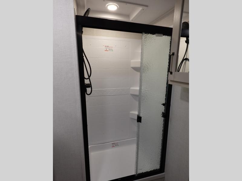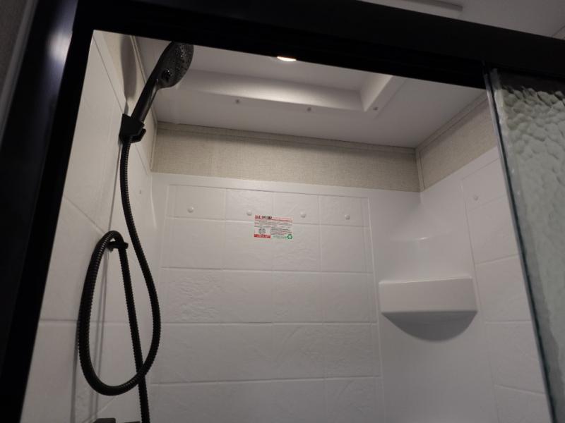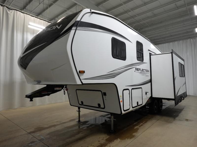 Feel right at home in this Reflection 150 Series with a private bedroom that includes a walk-around queen bed with storage on each side, windows, and a space savings sliding door. The full bathroom offers a walk-in shower, storage for your linens and a sliding door for easy access. When you get hungry, the cook will have an L-shaped kitchen area to make meals, plus full amenities including a 30" microwave, a flip-up counter extension, a pantry for your dry goods and a 16 cu. ft. refrigerator to store lots of food and cold beverages. You can dine at the rear U-shaped dinette lounge and enjoy the view out of all the windows or outside under the 18' electric awning. And the 78" theatre seating will be a nice place to relax and watch the 40" LED HDTV.