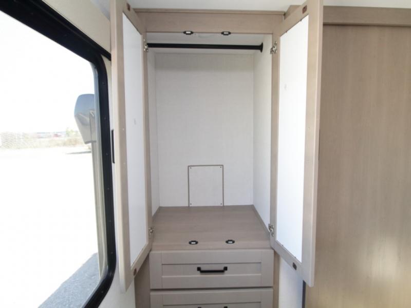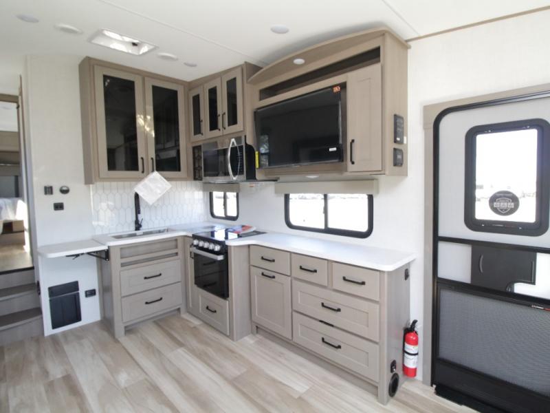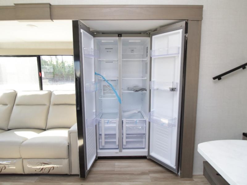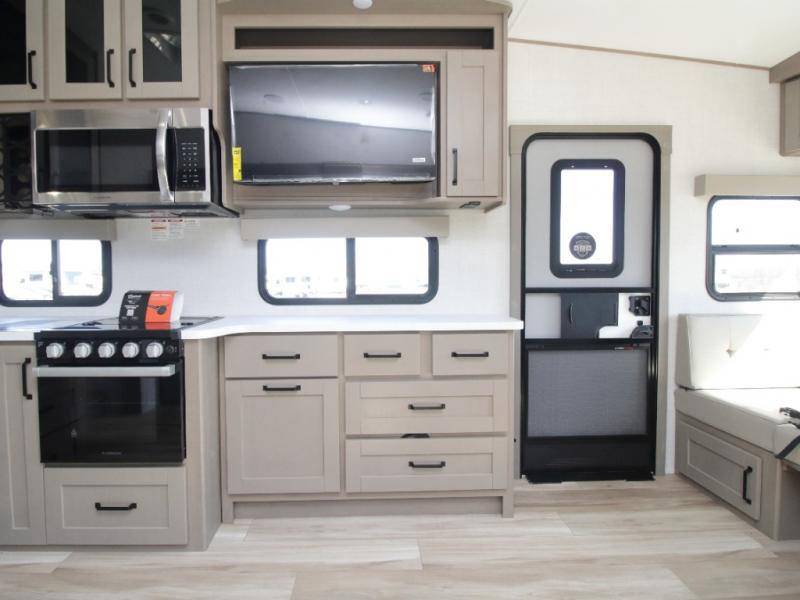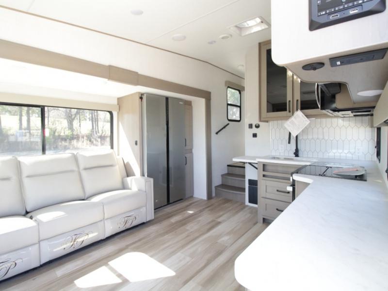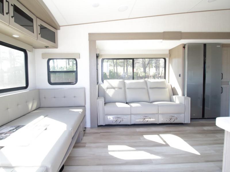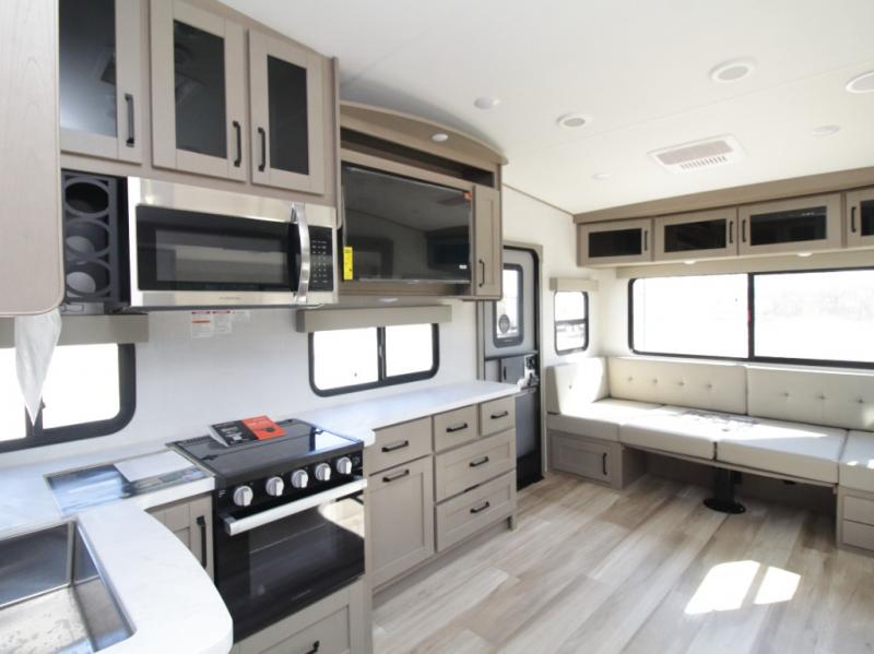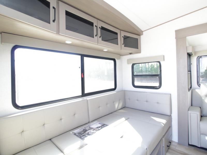 The L-shaped kitchen is designed for efficiency, featuring a 30-inch microwave, flip-up countertop extension, large pantry, and a 16 cu. ft. refrigerator to keep all your essentials fresh. The rear U-shaped lounge dinette offers a cozy space to enjoy meals while taking in scenic views from the surrounding windows.