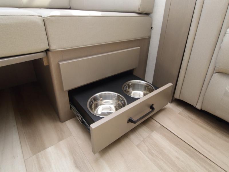 Inside, premium materials such as high-end cabinetry, Congoleum flooring, and residential-style window treatments create a warm and inviting atmosphere.