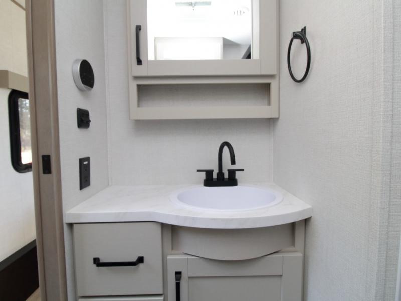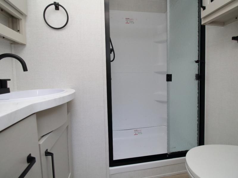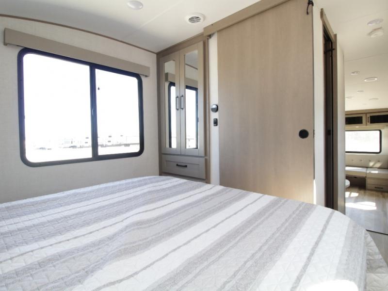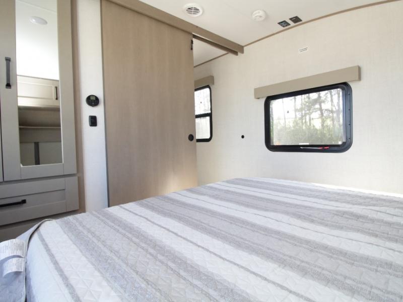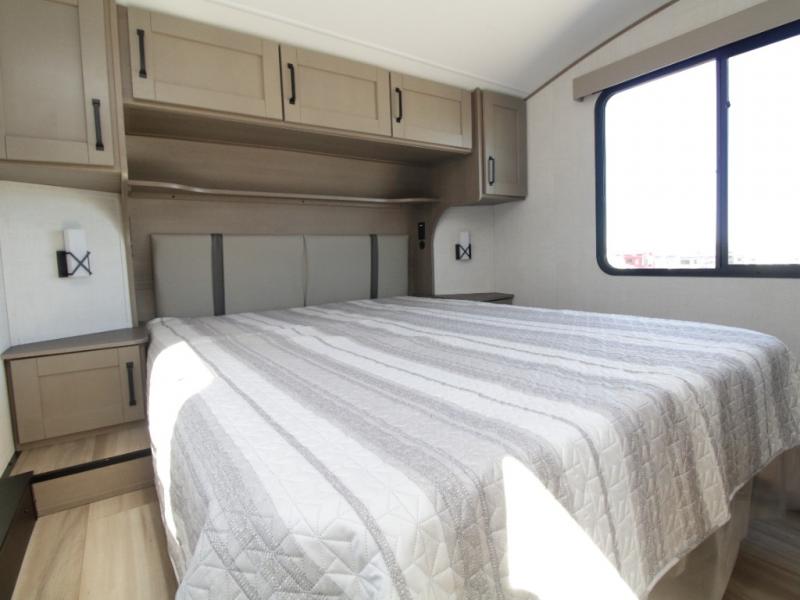 The Grand Design Reflection 150 Series 260RD combines residential luxury with easy towing, making it perfect for weekend getaways or extended travel. The private front bedroom features a walk-around queen bed, overhead storage, and a space-saving sliding door for added privacy.