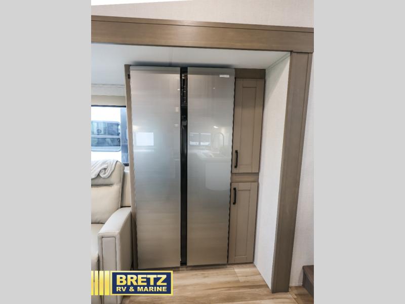 With any Reflection 150 Series fifth wheel by Grand Design, there is more available payload capacity and a broader range of half-ton trucks capable of towing this fifth wheel, and no slider hitch is needed thanks to the 90-degree turning radius which makes them short bed friendly and easier to tow. The mandatory Ultimate Power package provides a "One-Touch" automatic leveling system and a detachable power cord with LED light for easy setup, plus motion sensor pass-through lighting and entry lighting, and the Tire Linc TPMS will help you stay safe on the road. The interior offers residential luxury from the cabinetry and premium Congoleum flooring, to the booth dinette and residential-style window treatment. Make your refined decision today!