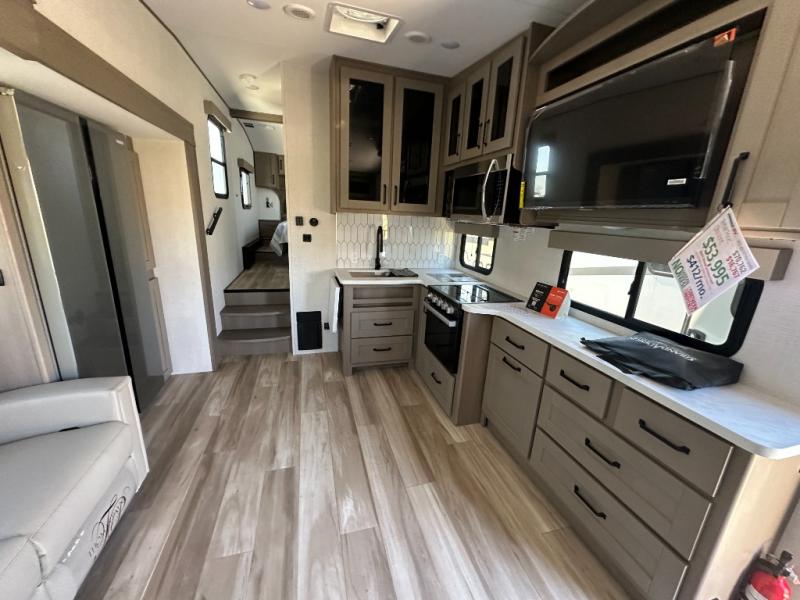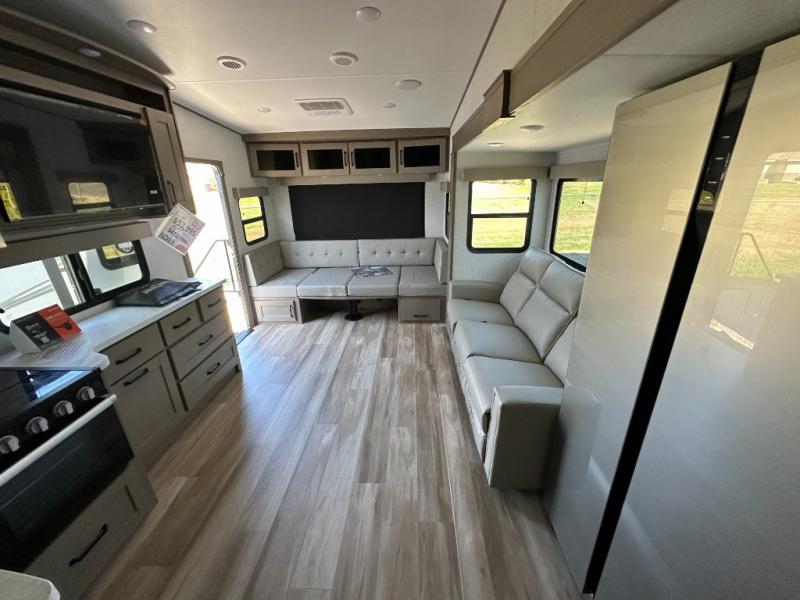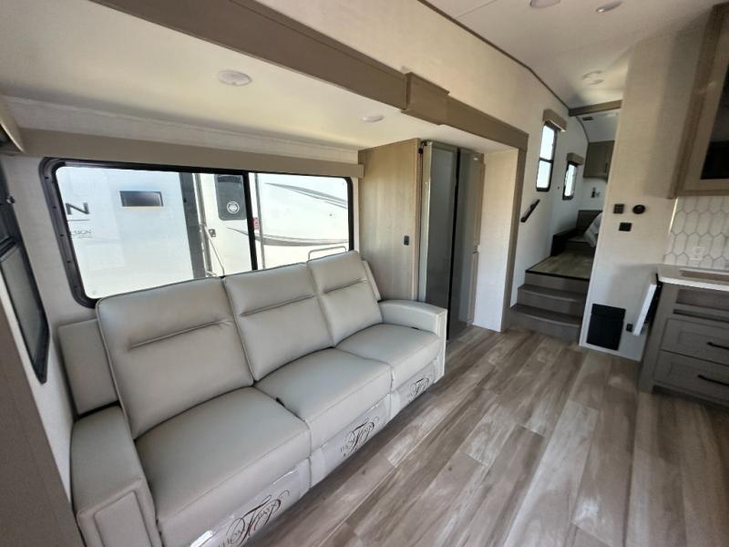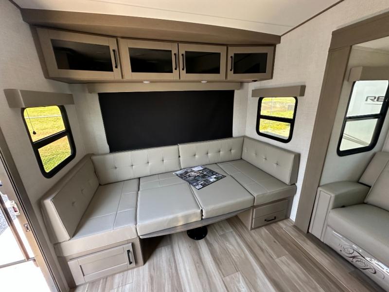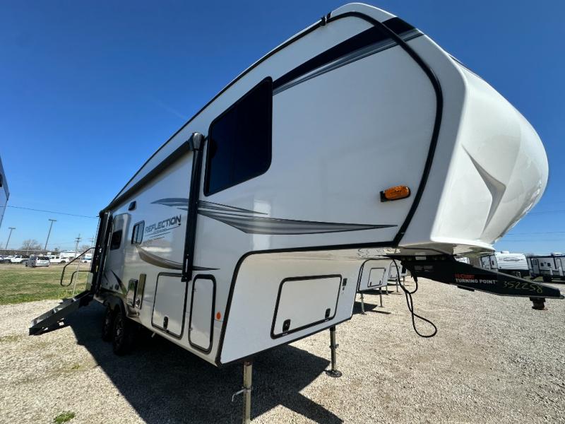 With any Reflection 150 Series fifth wheel by Grand Design, there is more available payload capacity and a broader range of half-ton trucks capable of towing this fifth wheel, and no slider hitch is needed thanks to the 90-degree turning radius which makes them short bed friendly and easier to tow. The mandatory Ultimate Power package provides a "One-Touch" automatic leveling system and a detachable power cord with LED light for easy setup, plus motion sensor pass-through lighting and entry lighting, and the Tire Linc TPMS will help you stay safe on the road. The interior offers residential luxury from the cabinetry and premium Congoleum flooring, to the booth dinette and residential-style window treatment. Make your refined decision today!