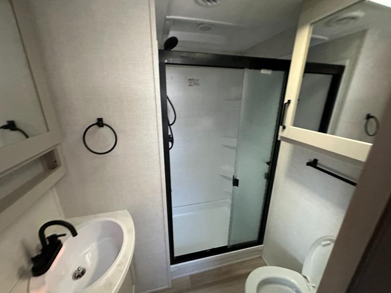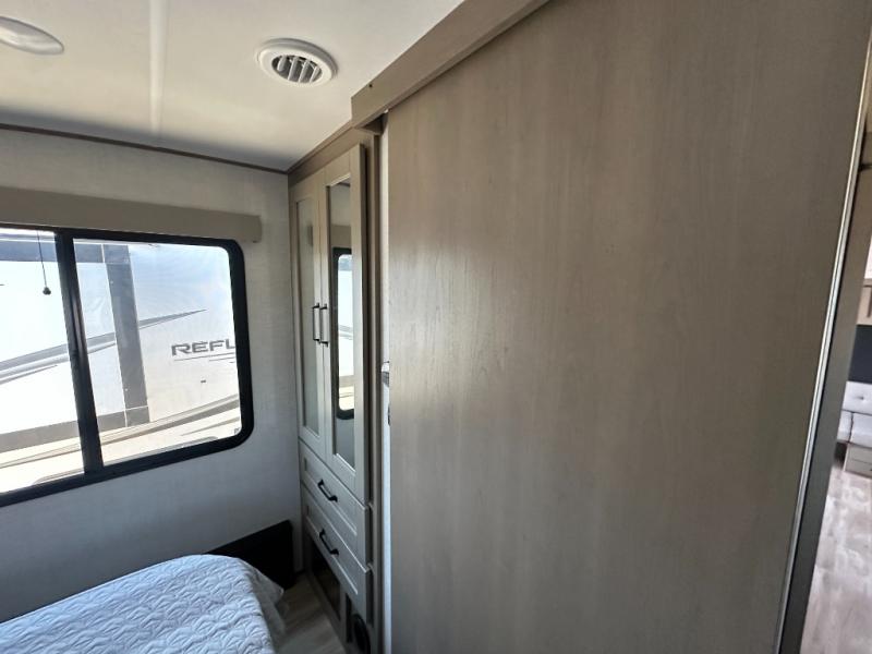 Feel right at home in this Reflection 150 Series with a private bedroom that includes a walk-around queen bed with storage on each side, windows, and a space savings sliding door. The full bathroom offers a walk-in shower, storage for your linens and a sliding door for easy access. When you get hungry, the cook will have an L-shaped kitchen area to make meals, plus full amenities including a 30" microwave, a flip-up counter extension, a pantry for your dry goods and a 16 cu. ft. refrigerator to store lots of food and cold beverages. You can dine at the rear U-shaped dinette lounge and enjoy the view out of all the windows or outside under the 18' electric awning. And the 78" theatre seating will be a nice place to relax and watch the 40" LED HDTV.