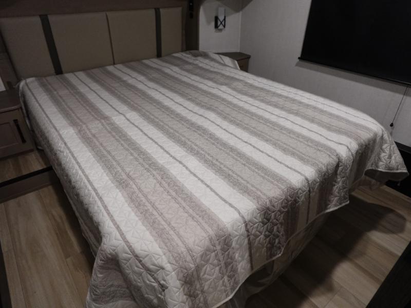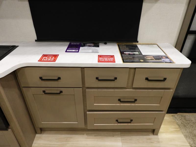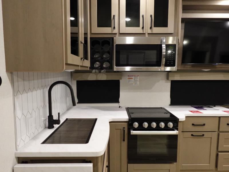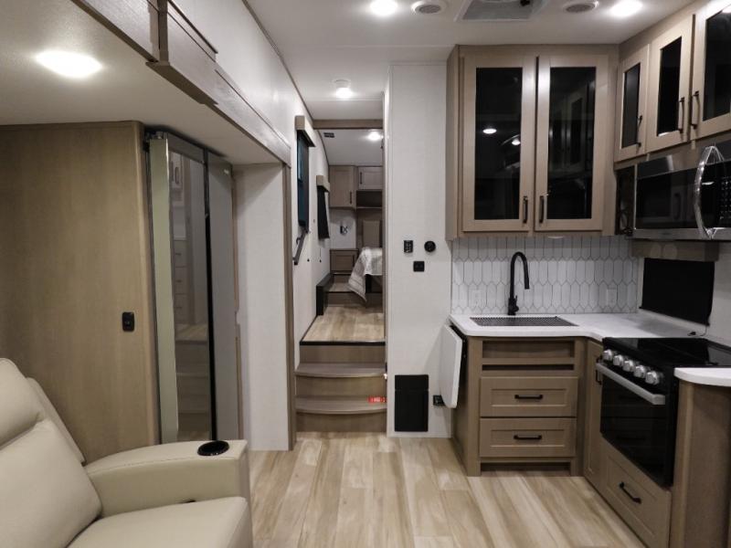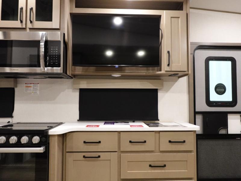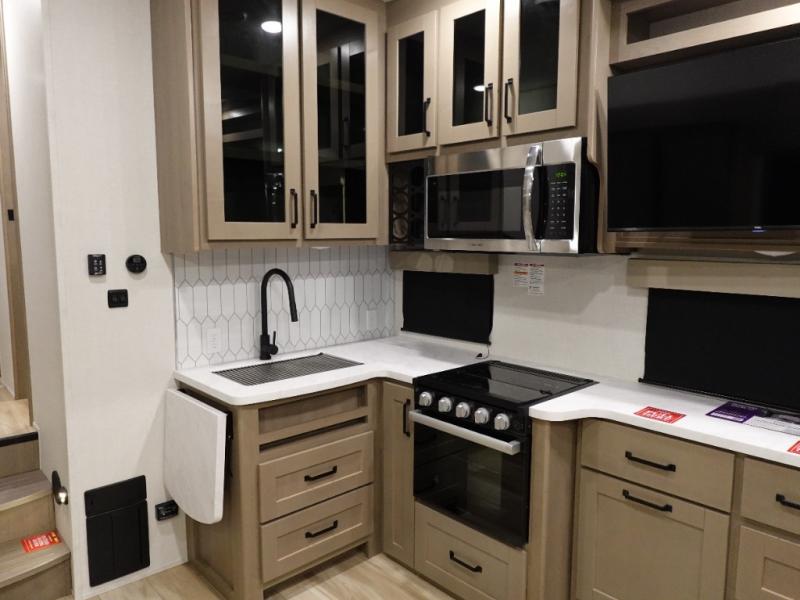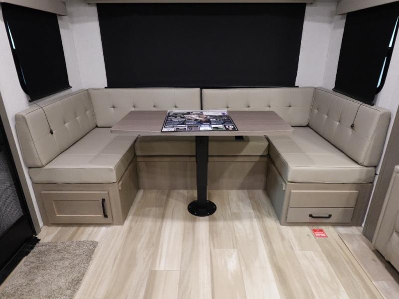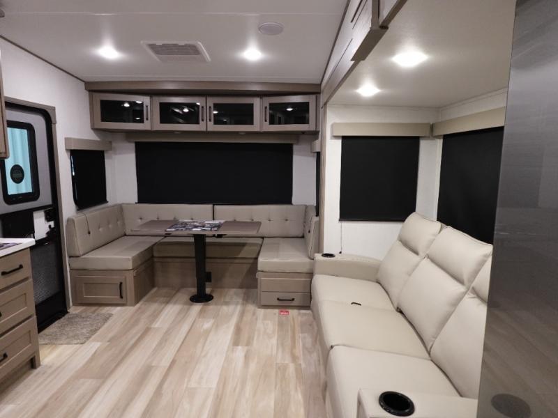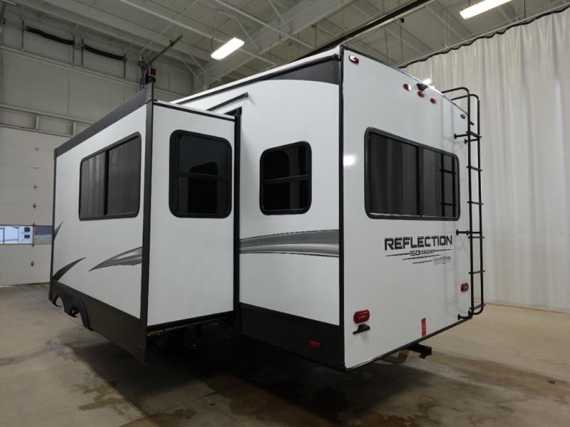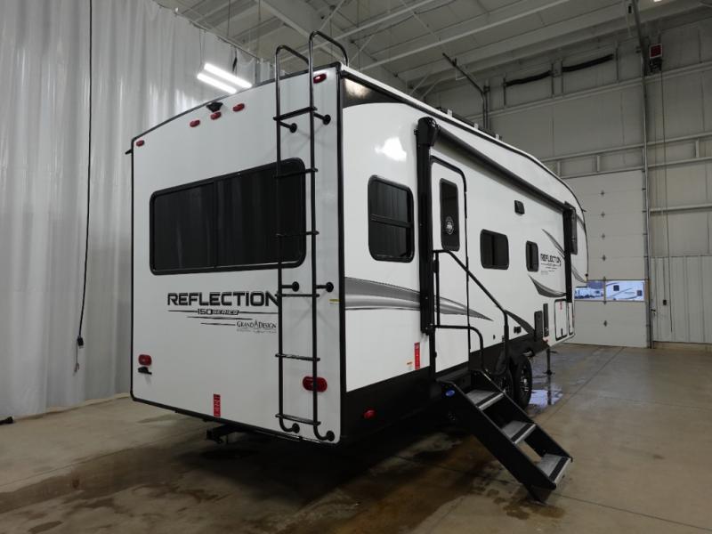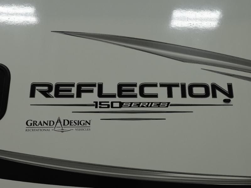 With any Reflection 150 Series fifth wheel by Grand Design, there is more available payload capacity and a broader range of half-ton trucks capable of towing this fifth wheel, and no slider hitch is needed thanks to the 90-degree turning radius which makes them short bed friendly and easier to tow. The mandatory Ultimate Power package provides a "One-Touch" automatic leveling system and a detachable power cord with LED light for easy setup, plus motion sensor pass-through lighting and entry lighting, and the Tire Linc TPMS will help you stay safe on the road. The interior offers residential luxury from the cabinetry and premium Congoleum flooring, to the booth dinette and residential-style window treatment. Make your refined decision today!