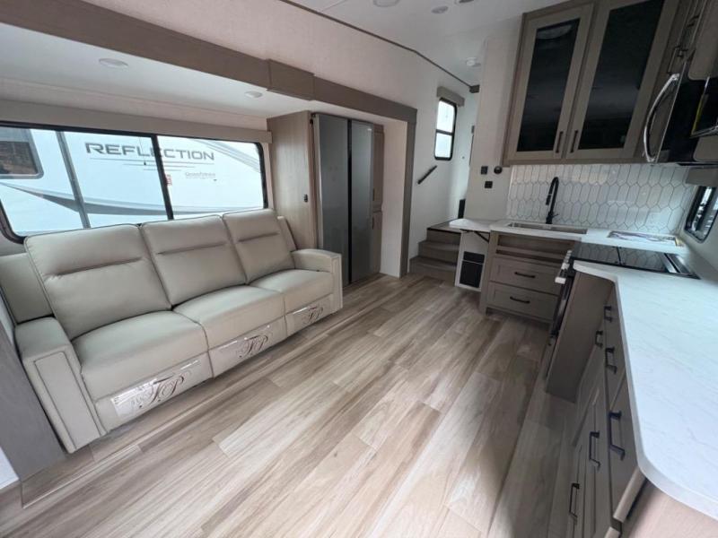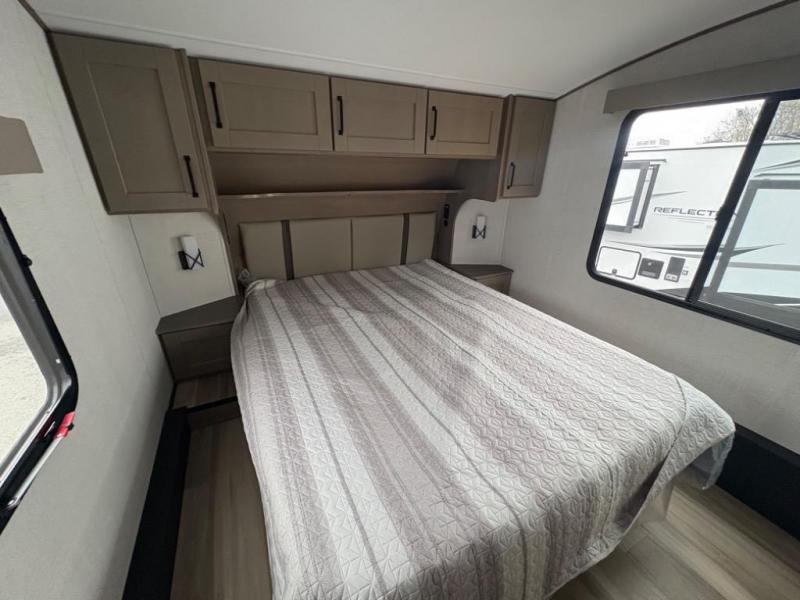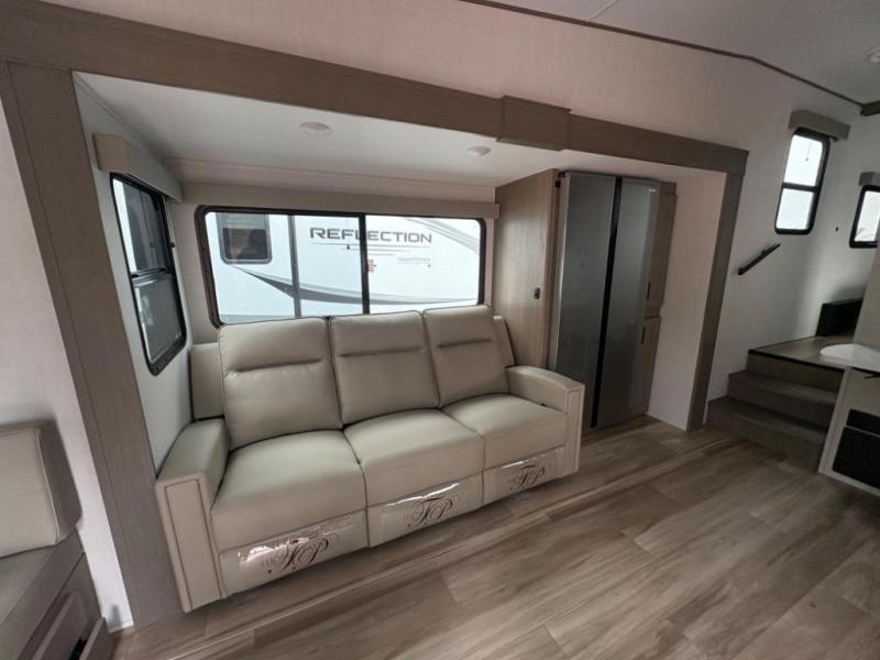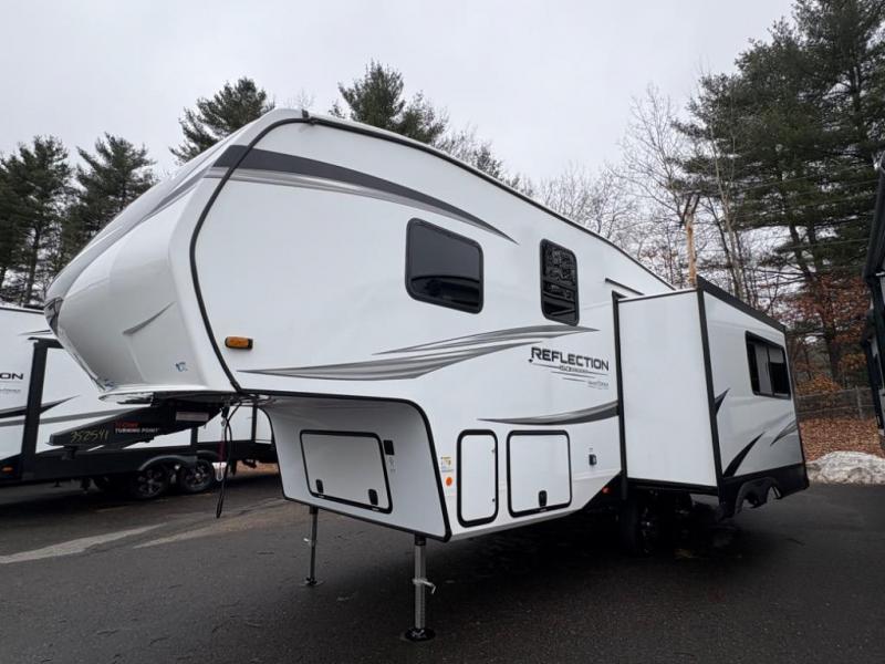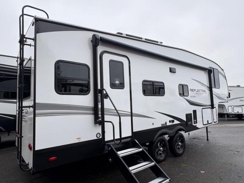 At under 30 feet long, this Reflection 150 is towable by many modern half-ton trucks yet offers the feel and features of a full-size fifth wheel. From its cozy rear dining lounge to its private front bedroom, every inch is crafted to make travel feel like home.