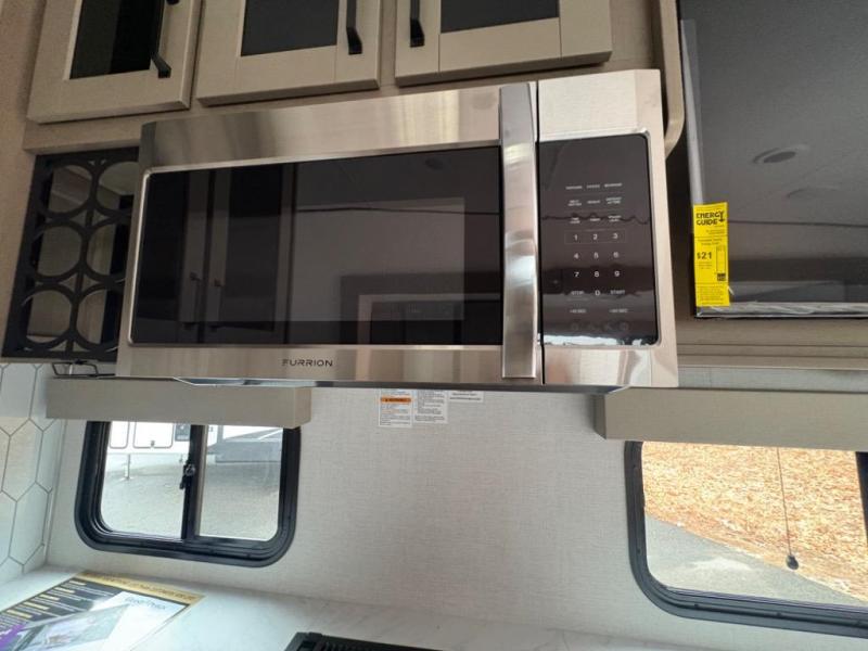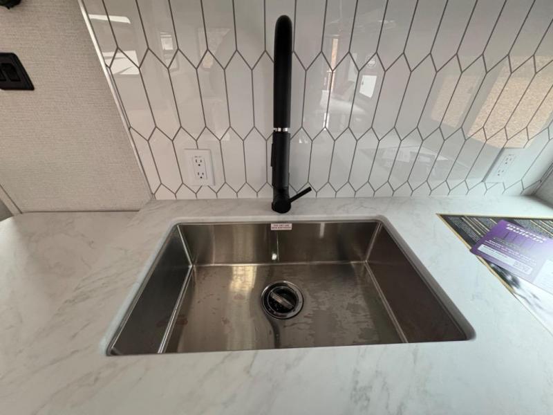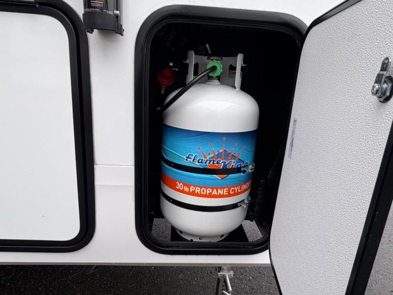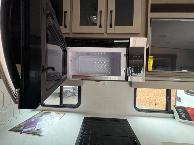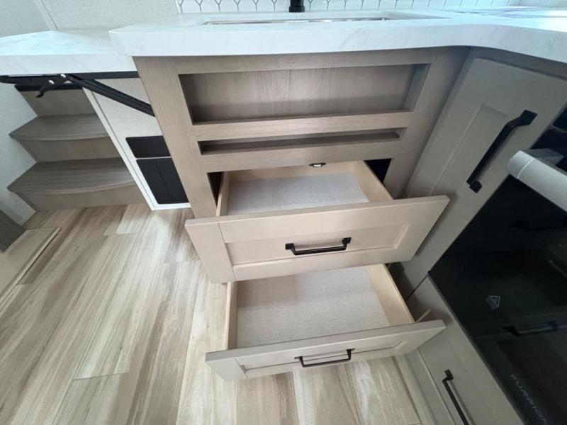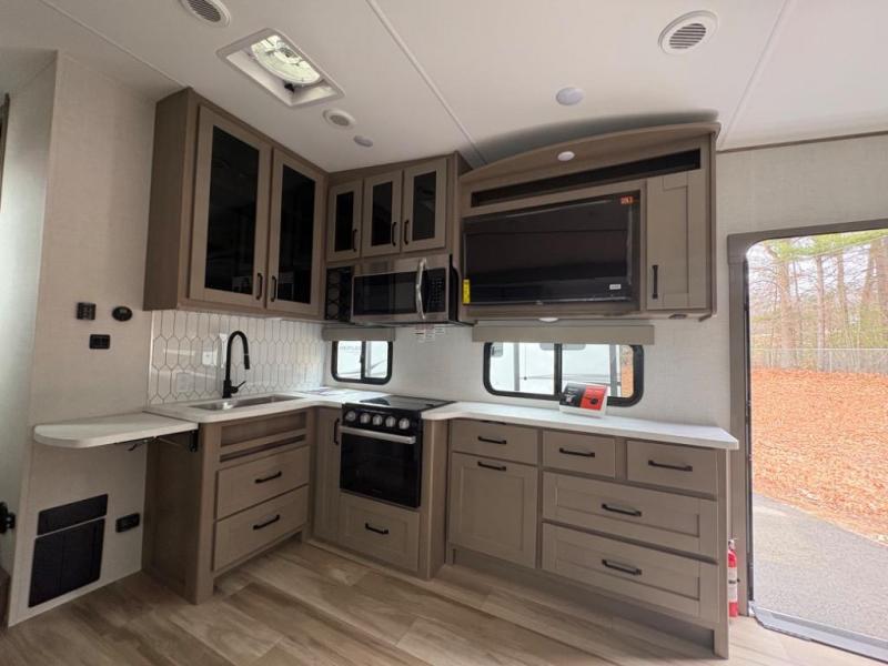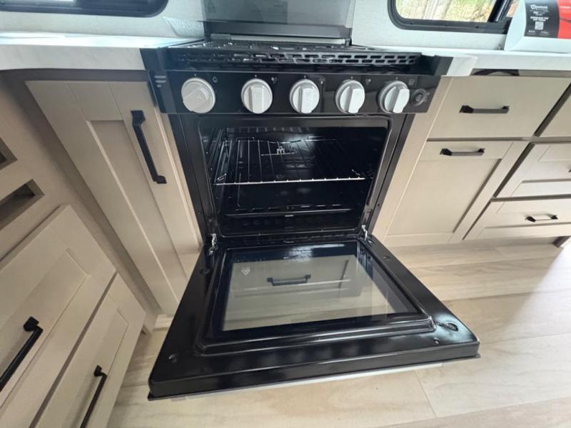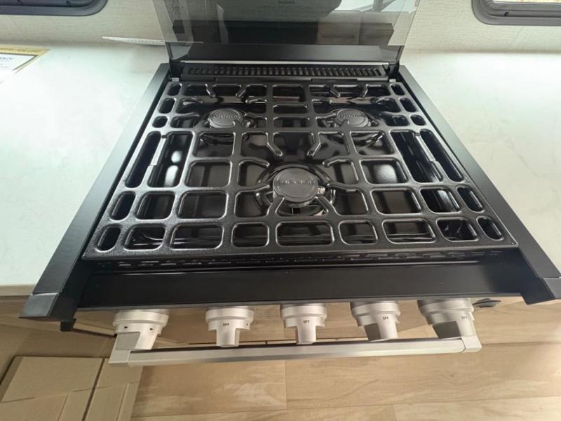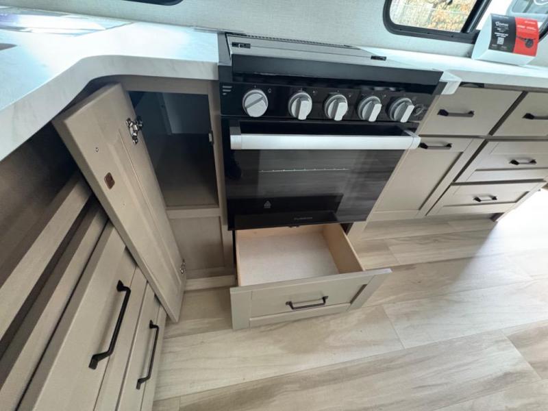 Cook your favorites in a fully equipped kitchen with a 16 cu. ft. refrigerator, three-burner range and oven, microwave, and generous counter space with a flip-up extension. Designed for easy prep and cleanup, it’s ready for everything from morning coffee to campfire feasts.