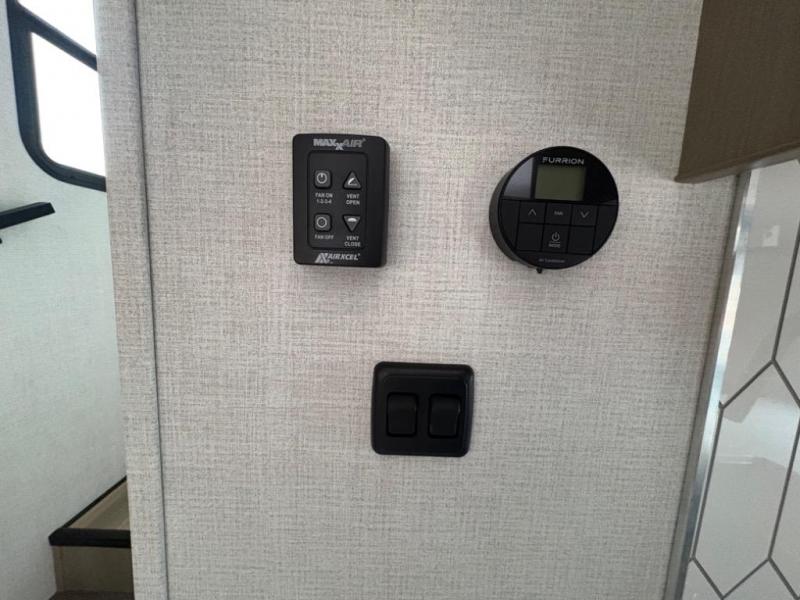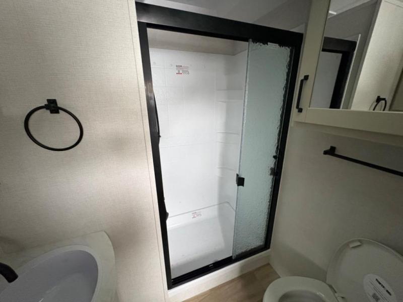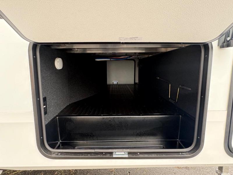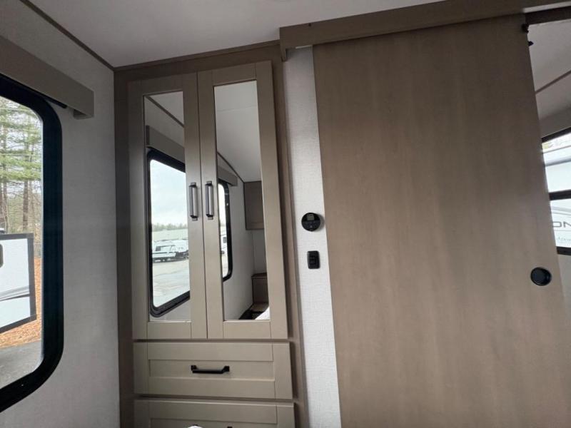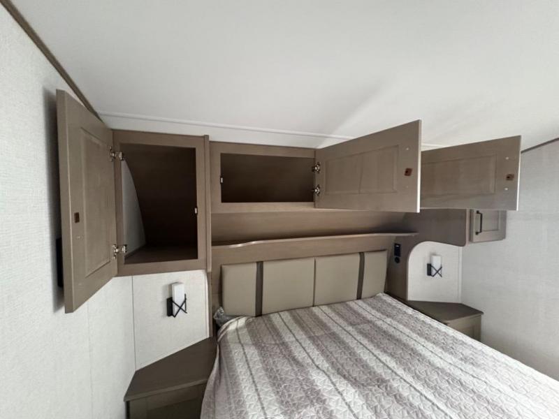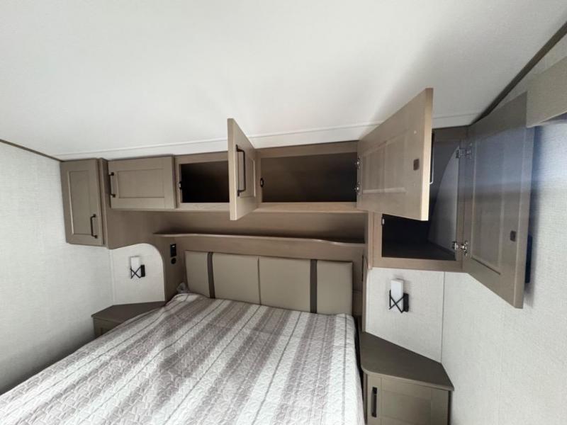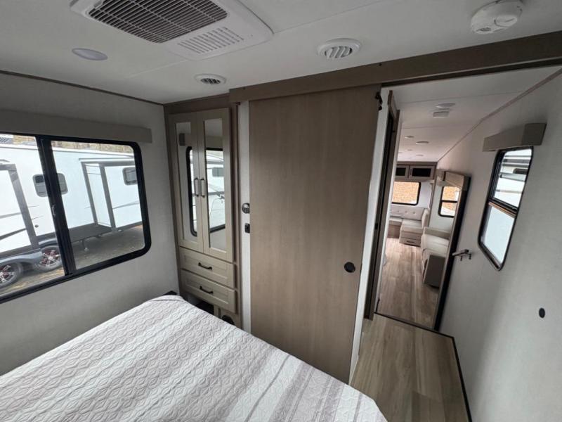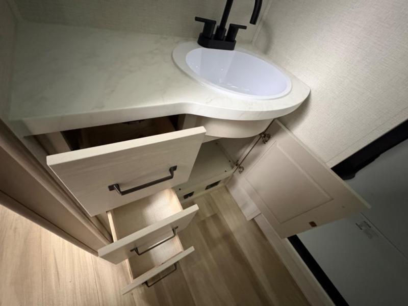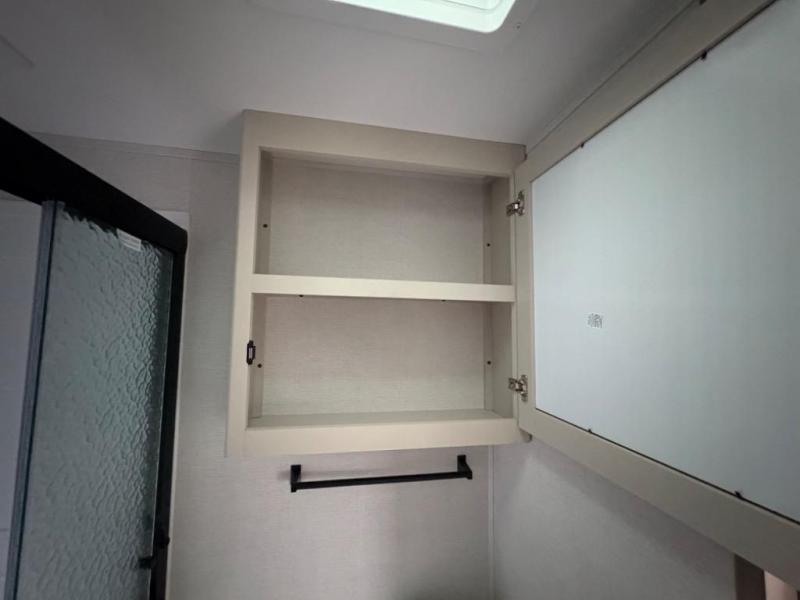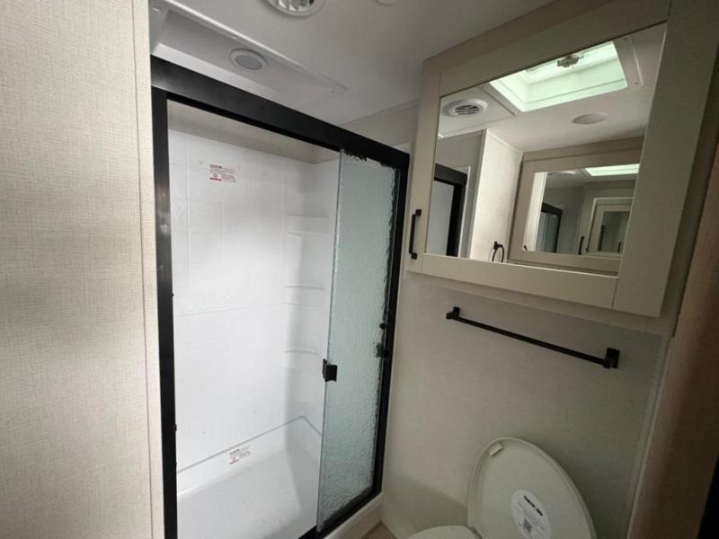 Unwind in the front queen bedroom with a walk-around bed and plenty of storage. The large bathroom features a 30” x 36” walk-in shower, skylight, and full vanity — giving you all the comforts of home wherever you travel.