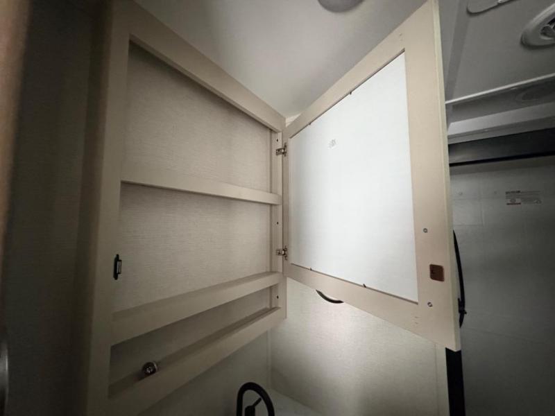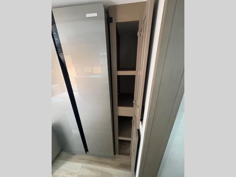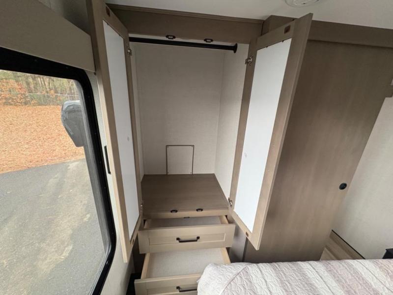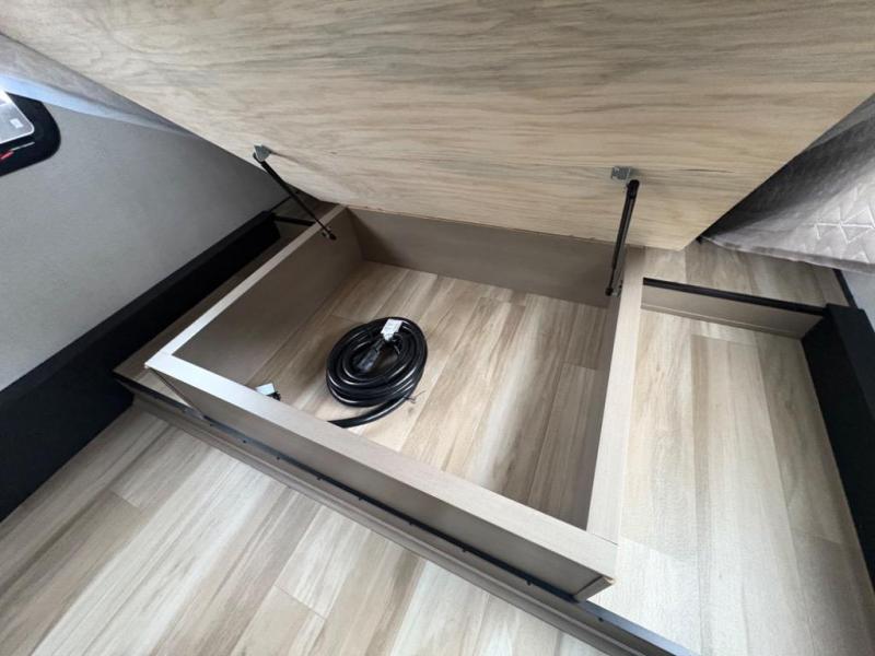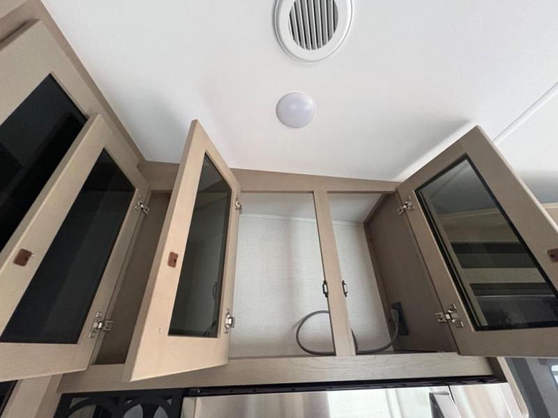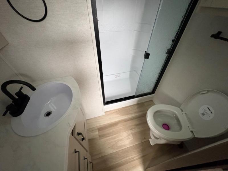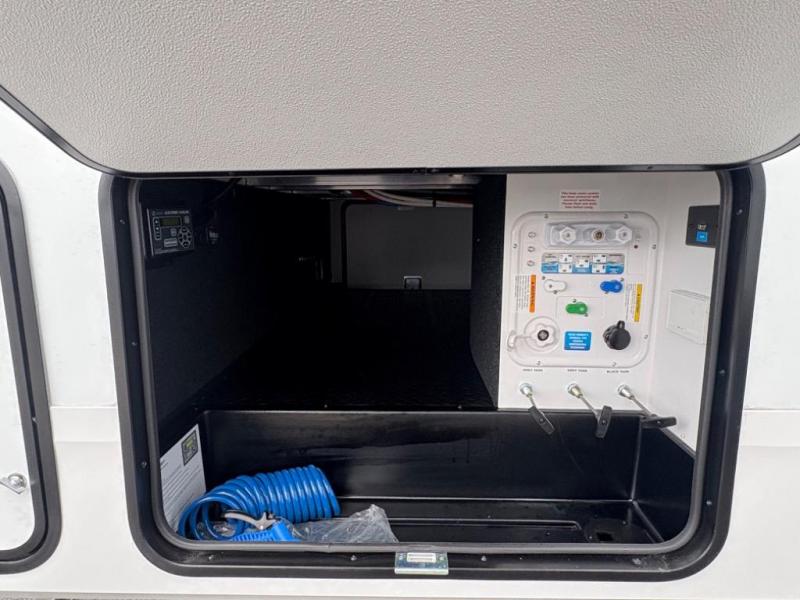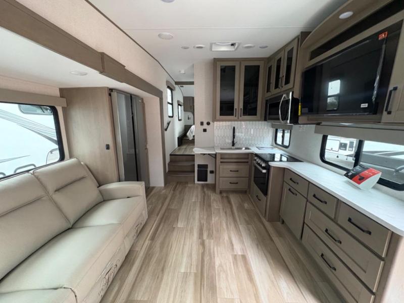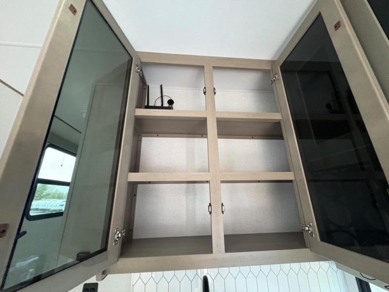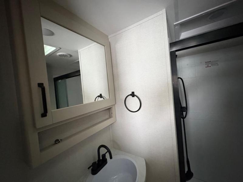Unwind in the front queen bedroom with a walk-around bed and plenty of storage. The large bathroom features a 30” x 36” walk-in shower, skylight, and full vanity — giving you all the comforts of home wherever you travel.