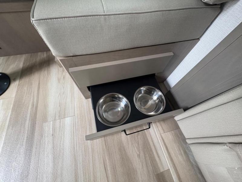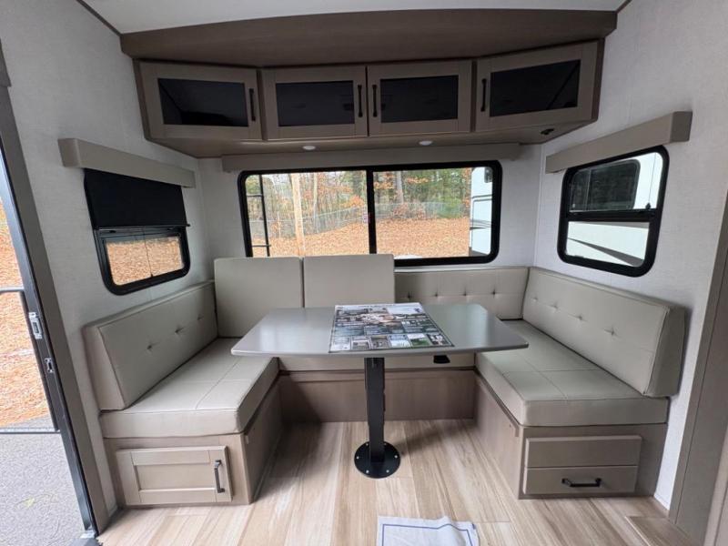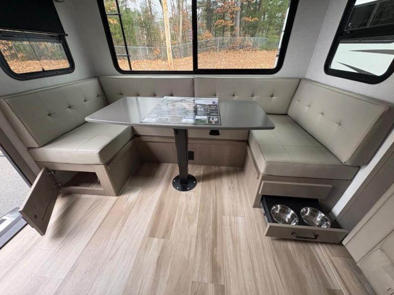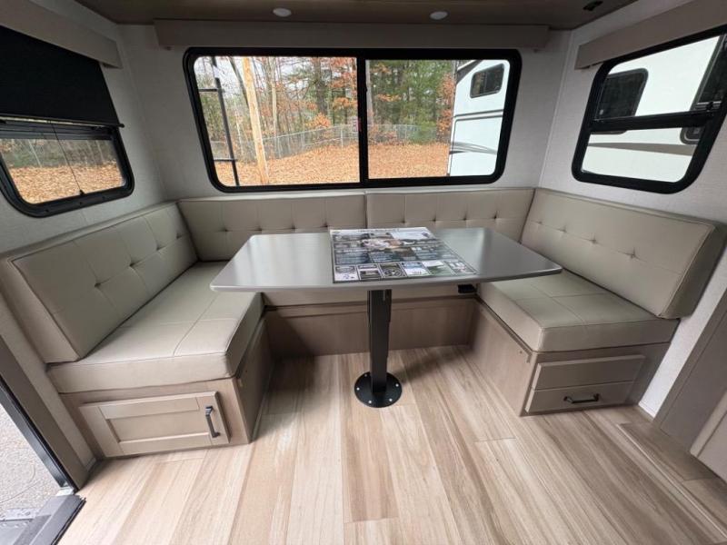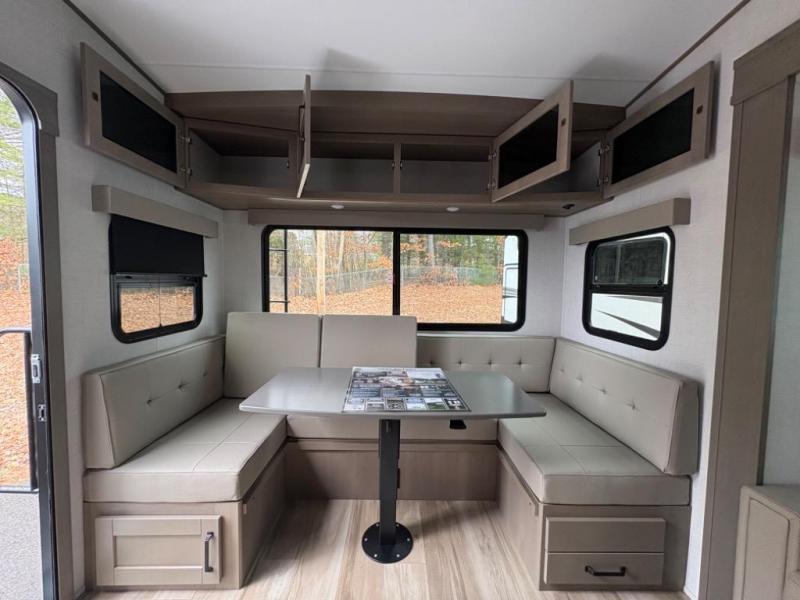 The rear U-shaped dinette wraps around panoramic windows, offering unbeatable campsite views and space to dine, work, or relax. It’s the perfect blend of function and charm.