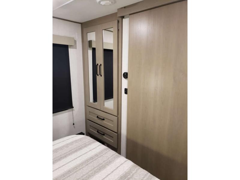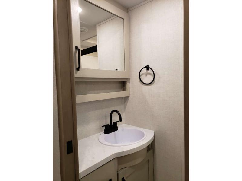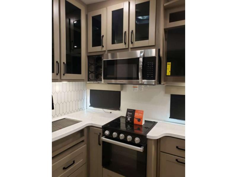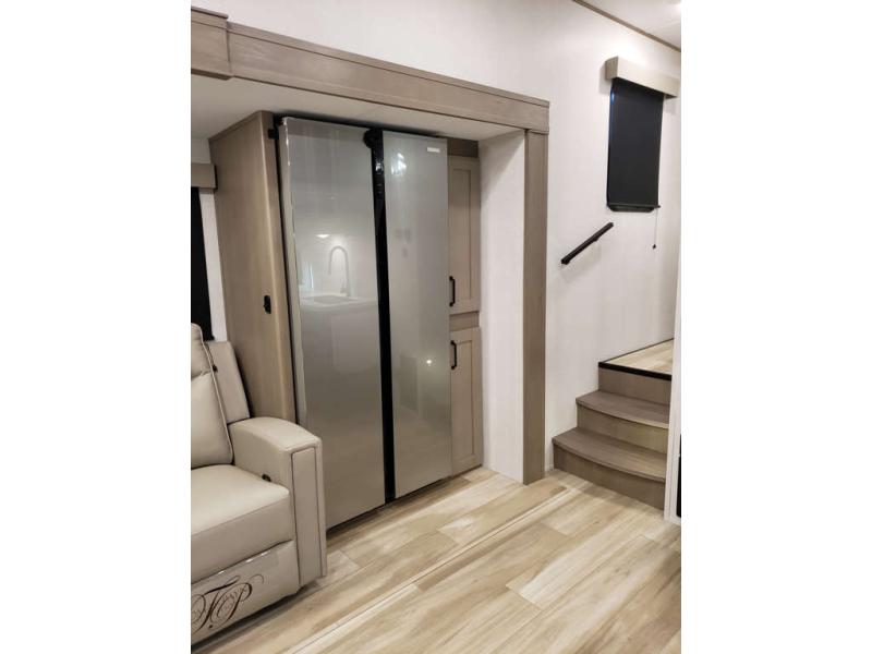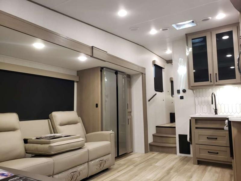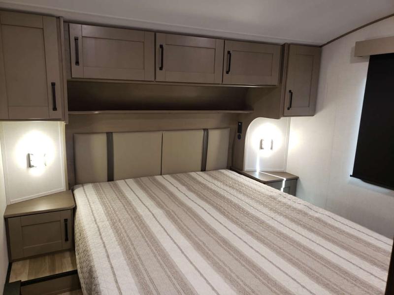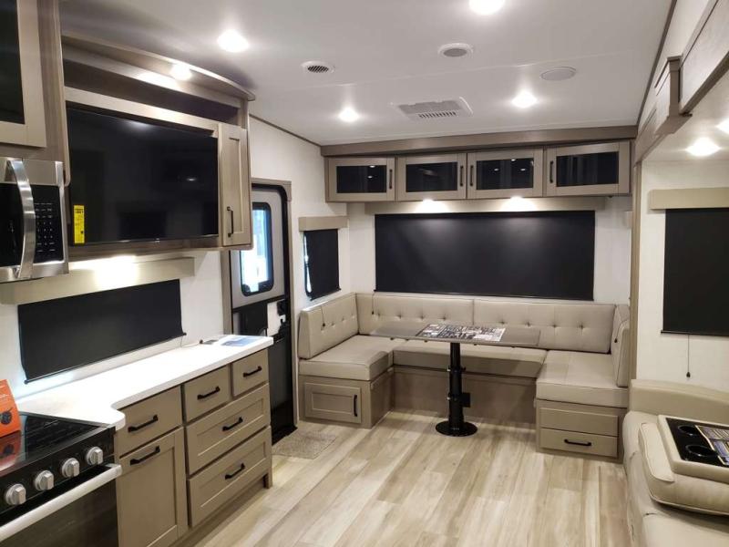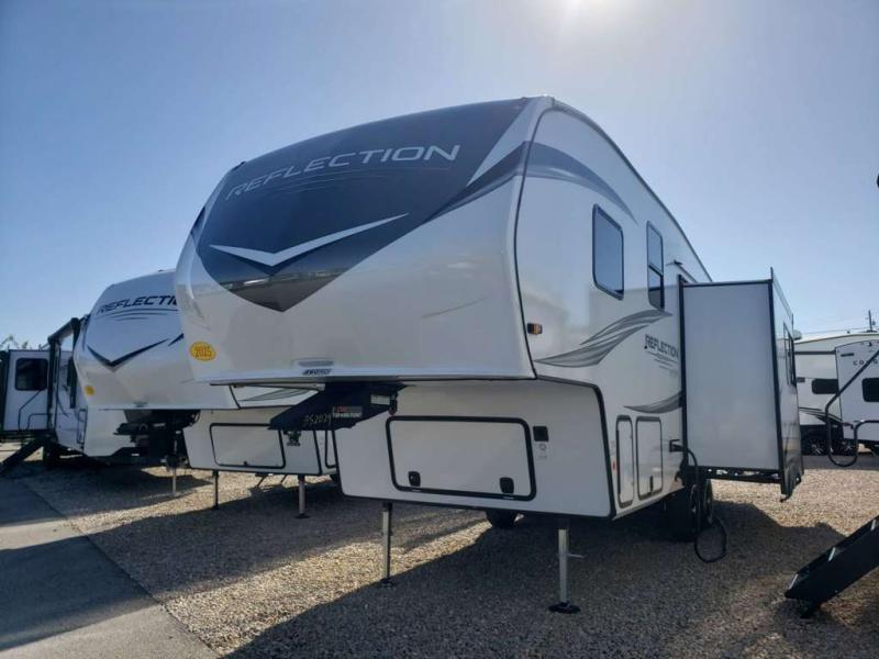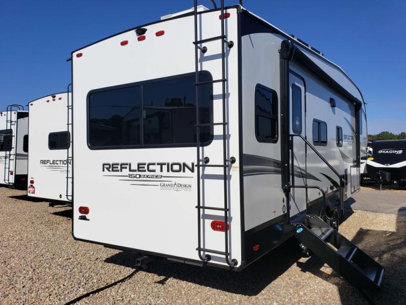 With any Reflection 150 Series fifth wheel by Grand Design, there is more available payload capacity and a broader range of half-ton trucks capable of towing this fifth wheel, and no slider hitch is needed thanks to the 90-degree turning radius which makes them short bed friendly and easier to tow. The mandatory Ultimate Power package provides a "One-Touch" automatic leveling system and a detachable power cord with LED light for easy setup, plus motion sensor pass-through lighting and entry lighting, and the Tire Linc TPMS will help you stay safe on the road. The interior offers residential luxury from the cabinetry and premium Congoleum flooring, to the booth dinette and residential-style window treatment. Make your refined decision today!