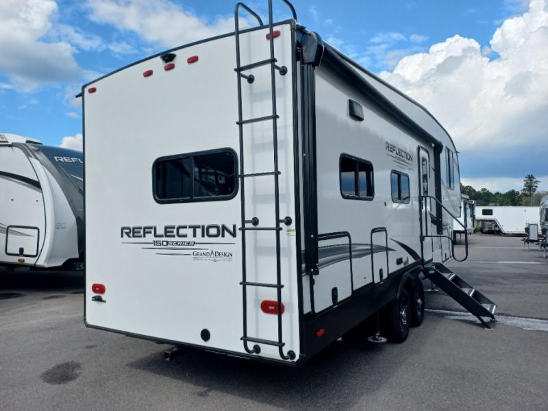 With any Reflection 150 Series fifth wheel by Grand Design, there is more available payload capacity and a broader range of half-ton trucks capable of towing this fifth wheel, and no slider hitch is needed thanks to the 90-degree turning radius which makes them short bed friendly and easier to tow. The mandatory Ultimate Power package provides a "One-Touch" automatic leveling system and a detachable power cord with LED light for easy setup, plus motion sensor pass-through lighting and entry lighting, and the Tire Linc TPMS will help you stay safe on the road. The interior offers residential luxury from the cabinetry and premium Congoleum flooring, to the booth dinette and residential-style window treatment. Make your refined decision today!