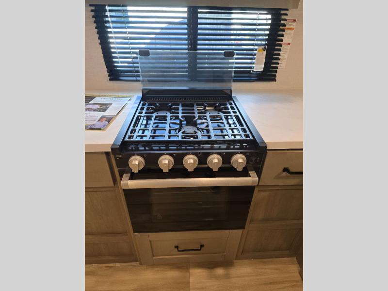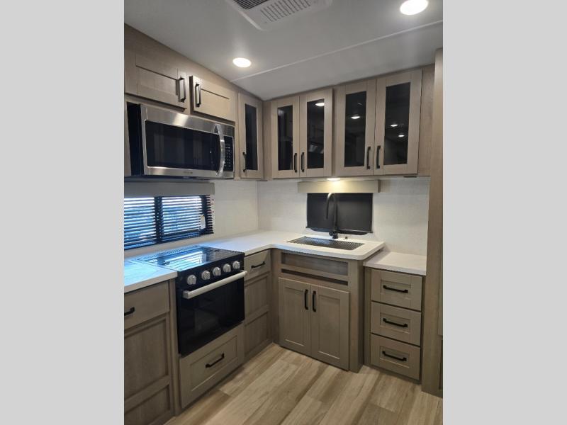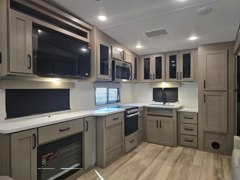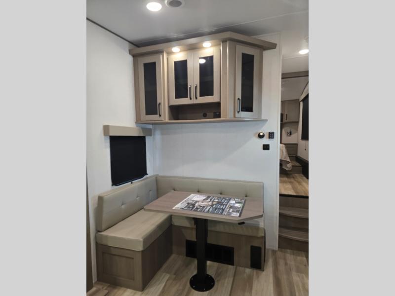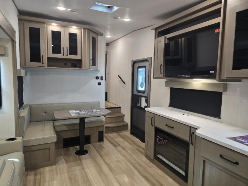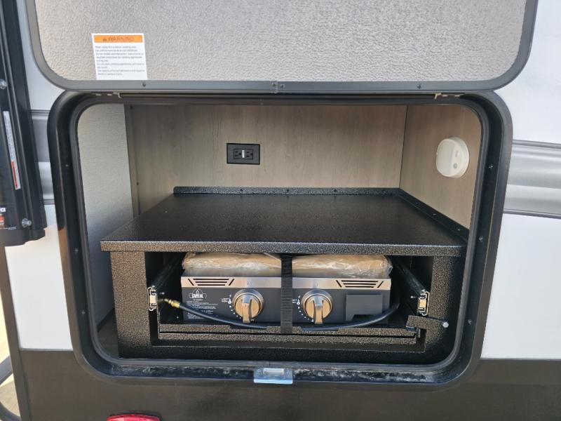 You will love this fifth wheel featuring a single slide for added interior living space and all the comforts and conveniences it provides you while you travel. The slide features a 78" theater seat plus there is a breakfast nook for more seating. Both can easily view the entertainment center with 40" TV. A rear kitchen indoors provides everything you need to create meals like home while on the road, and if you want to spend as much time outside as possible, then the outdoor griddle will certainly accommodate you for meals. Up front, a cozy private bedroom with queen bed, wardrobe, and overhead cabinets. Right next door, you will find a large walk-in shower, as well as a toilet, and a vanity with sink and linen cabinet for your towels and toiletries. You will also love the full unobstructed pass-through compartment for all of your gear, plus so much more!