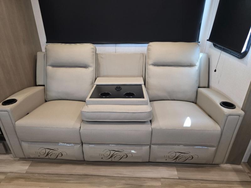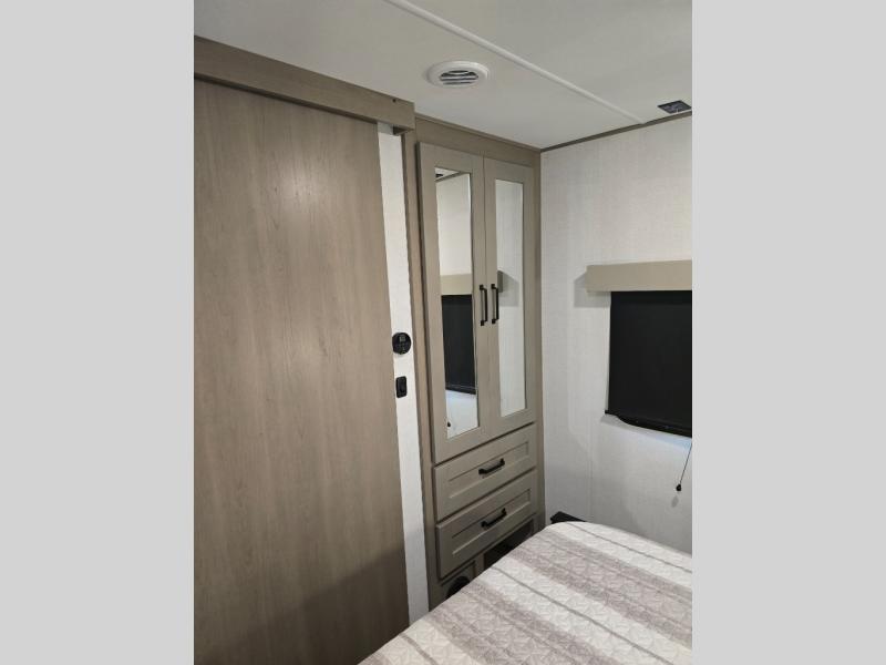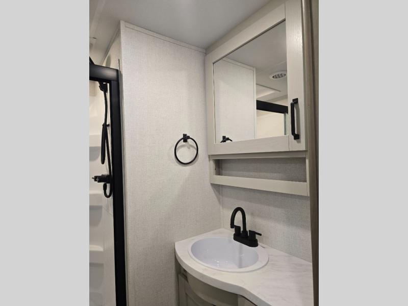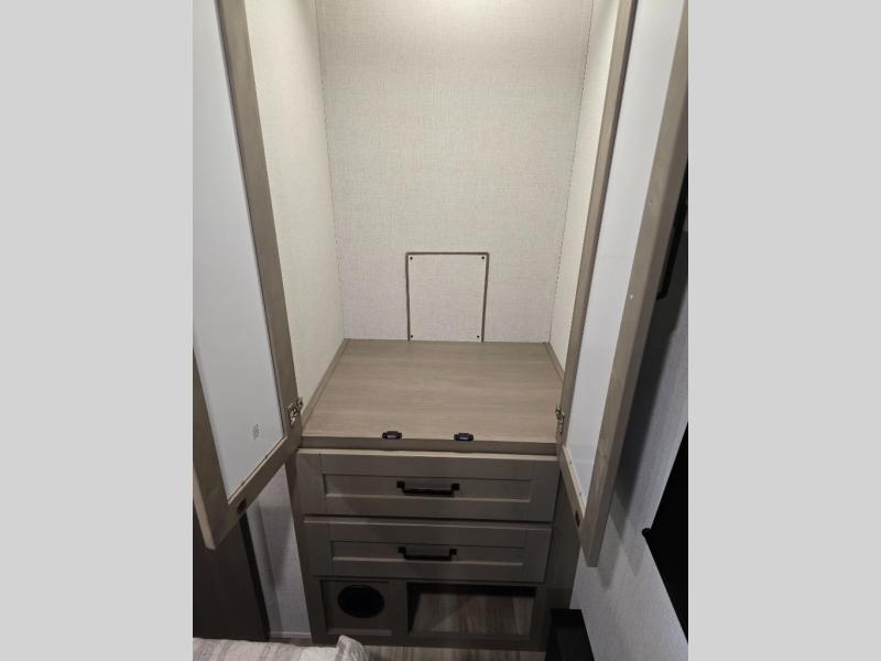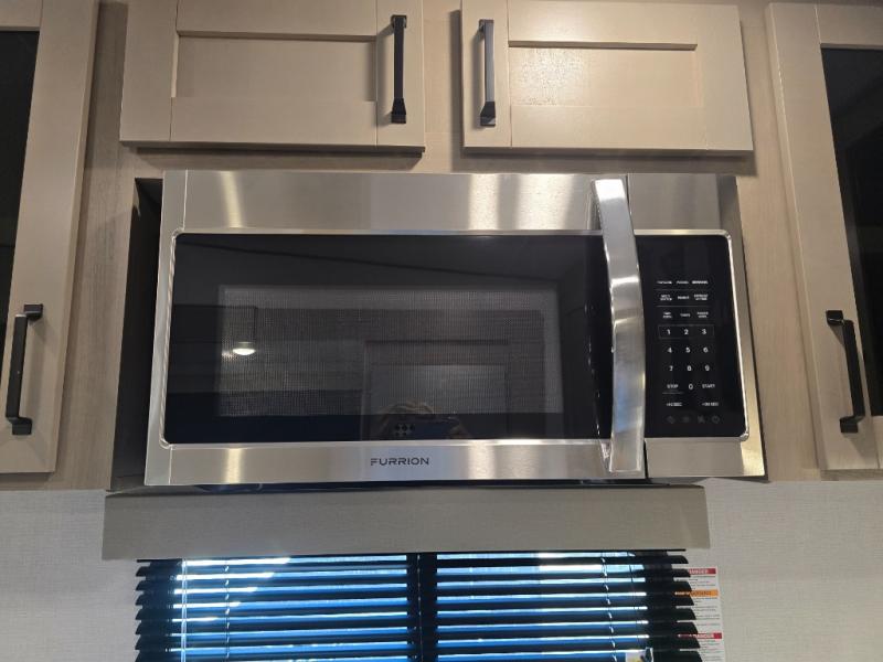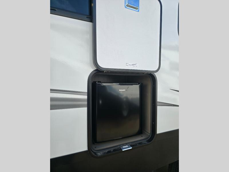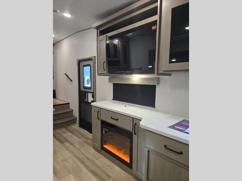 You will love this fifth wheel featuring a single slide for added interior living space and all the comforts and conveniences it provides you while you travel. The slide features a 78" theater seat plus there is a breakfast nook for more seating. Both can easily view the entertainment center with 40" TV. A rear kitchen indoors provides everything you need to create meals like home while on the road, and if you want to spend as much time outside as possible, then the outdoor griddle will certainly accommodate you for meals. Up front, a cozy private bedroom with queen bed, wardrobe, and overhead cabinets. Right next door, you will find a large walk-in shower, as well as a toilet, and a vanity with sink and linen cabinet for your towels and toiletries. You will also love the full unobstructed pass-through compartment for all of your gear, plus so much more!