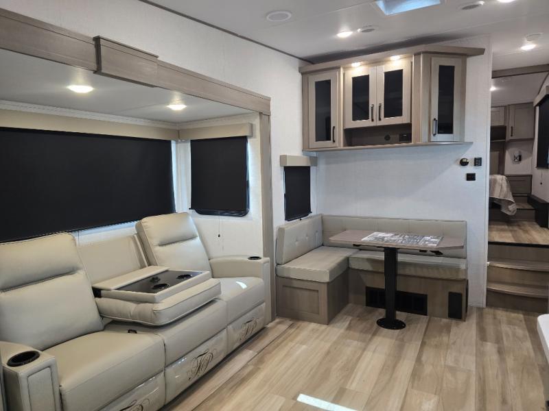 With any Reflection 150 Series fifth wheel by Grand Design, there is more available payload capacity and a broader range of half-ton trucks capable of towing this fifth wheel, and no slider hitch is needed thanks to the 90-degree turning radius which makes them short bed friendly and easier to tow. The mandatory Ultimate Power package provides a "One-Touch" automatic leveling system and a detachable power cord with LED light for easy setup, plus motion sensor pass-through lighting and entry lighting, and the Tire Linc TPMS will help you stay safe on the road. The interior offers residential luxury from the cabinetry and premium Congoleum flooring, to the booth dinette and residential-style window treatment. Make your refined decision today!