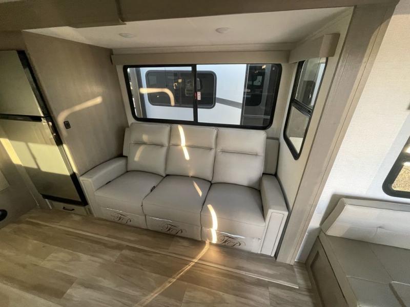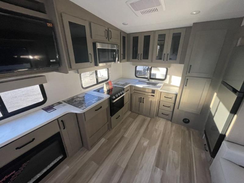 You will love this fifth wheel featuring a single slide for added interior living space and all the comforts and conveniences it provides you while you travel. The slide features a 78" theater seat plus there is a breakfast nook for more seating. Both can easily view the entertainment center with 40" TV. A rear kitchen indoors provides everything you need to create meals like home while on the road, and if you want to spend as much time outside as possible, then the outdoor griddle will certainly accommodate you for meals. Up front, a cozy private bedroom with queen bed, wardrobe, and overhead cabinets. Right next door, you will find a large walk-in shower, as well as a toilet, and a vanity with sink and linen cabinet for your towels and toiletries. You will also love the full unobstructed pass-through compartment for all of your gear, plus so much more!