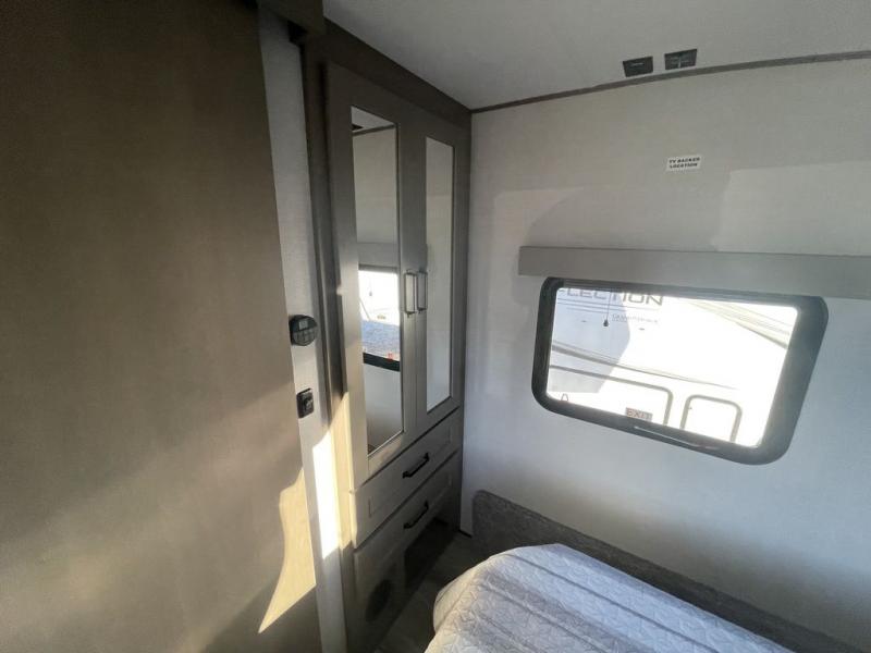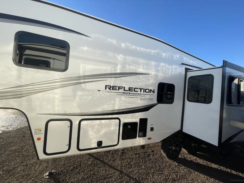 With any Reflection 150 Series fifth wheel by Grand Design, there is more available payload capacity and a broader range of half-ton trucks capable of towing this fifth wheel, and no slider hitch is needed thanks to the 90-degree turning radius which makes them short bed friendly and easier to tow. The mandatory Ultimate Power package provides a "One-Touch" automatic leveling system and a detachable power cord with LED light for easy setup, plus motion sensor pass-through lighting and entry lighting, and the Tire Linc TPMS will help you stay safe on the road. The interior offers residential luxury from the cabinetry and premium Congoleum flooring, to the booth dinette and residential-style window treatment. Make your refined decision today!