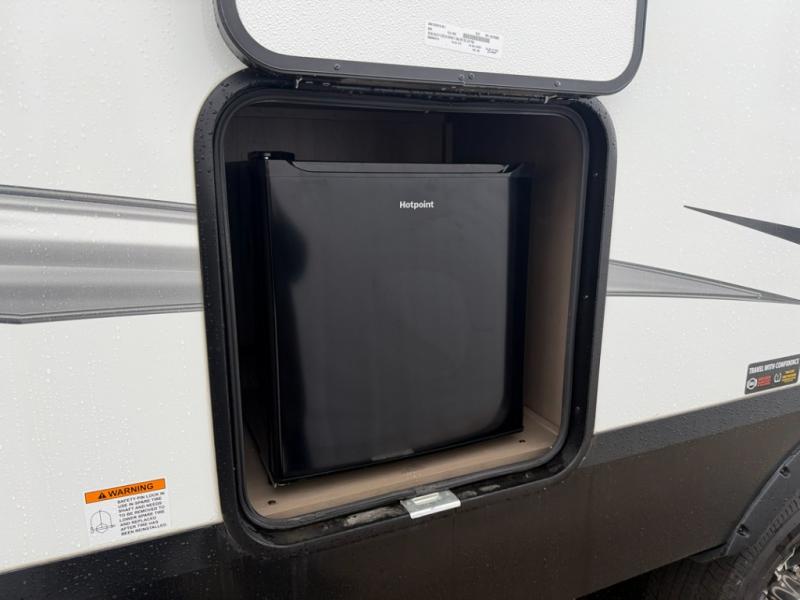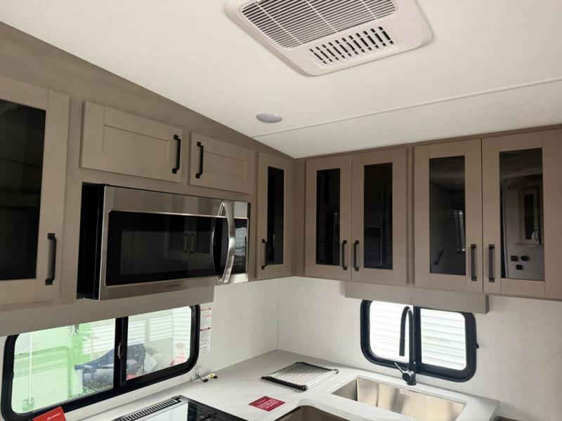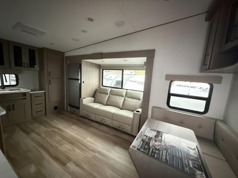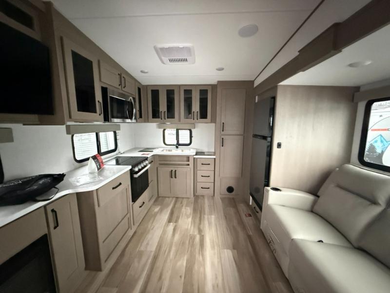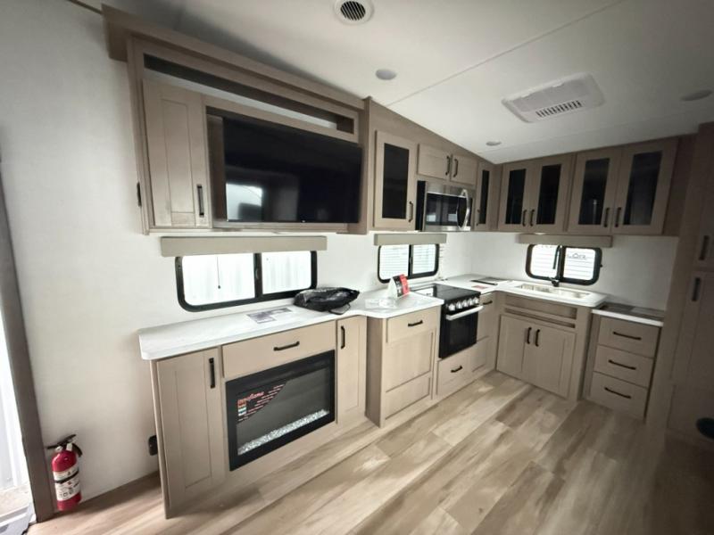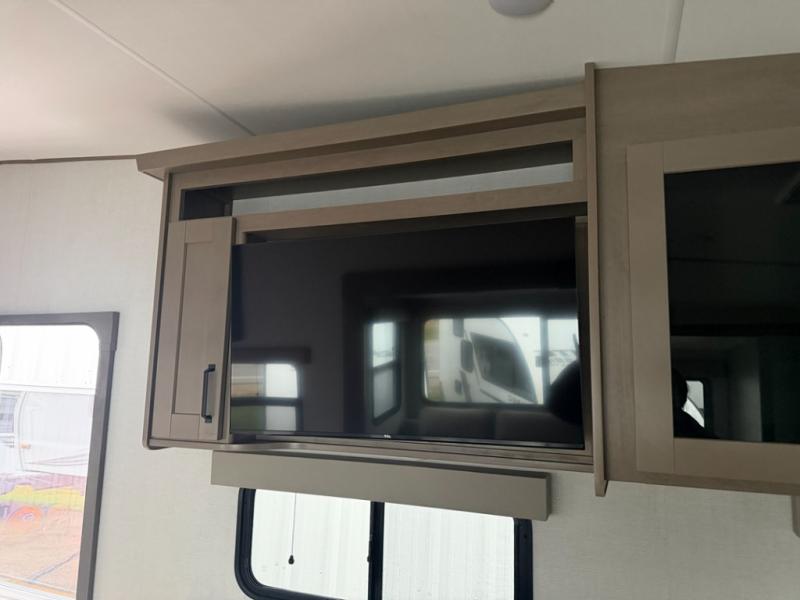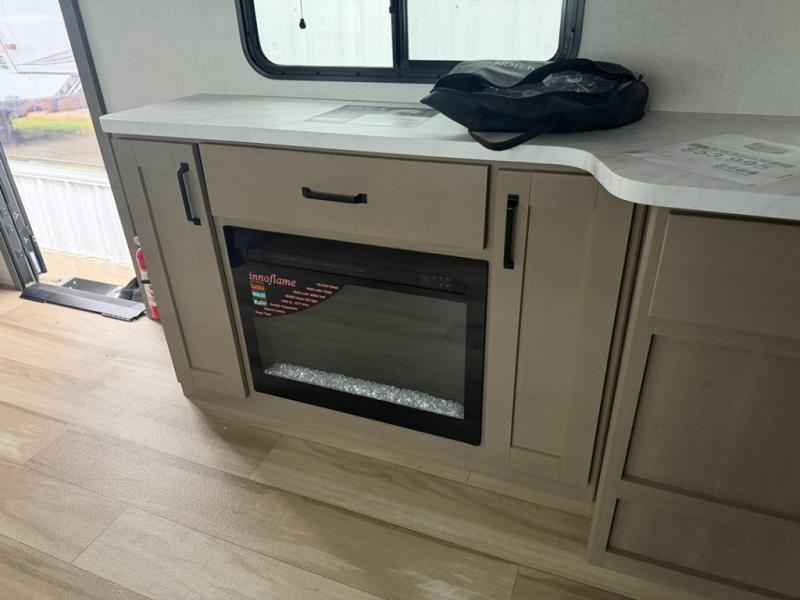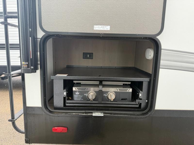 You will love this fifth wheel featuring a single slide for added interior living space and all the comforts and conveniences it provides you while you travel. The slide features a 78" theater seat plus there is a breakfast nook for more seating. Both can easily view the entertainment center with 40" TV. A rear kitchen indoors provides everything you need to create meals like home while on the road, and if you want to spend as much time outside as possible, then the outdoor griddle will certainly accommodate you for meals. Up front, a cozy private bedroom with queen bed, wardrobe, and overhead cabinets. Right next door, you will find a large walk-in shower, as well as a toilet, and a vanity with sink and linen cabinet for your towels and toiletries. You will also love the full unobstructed pass-through compartment for all of your gear, plus so much more!
