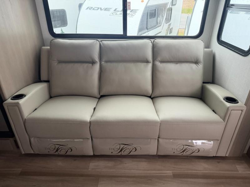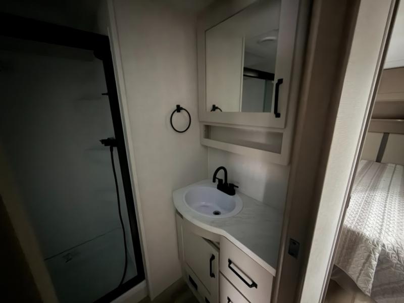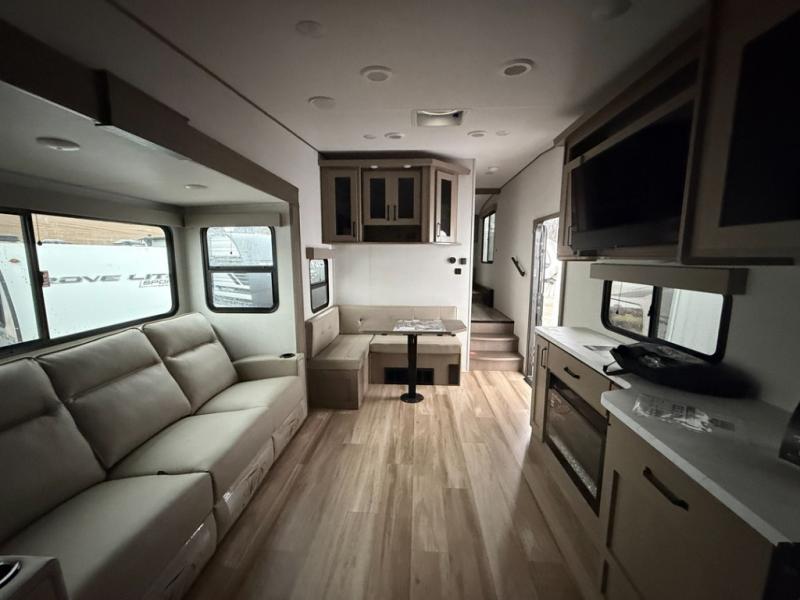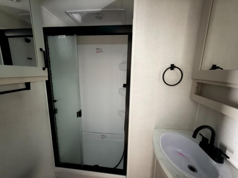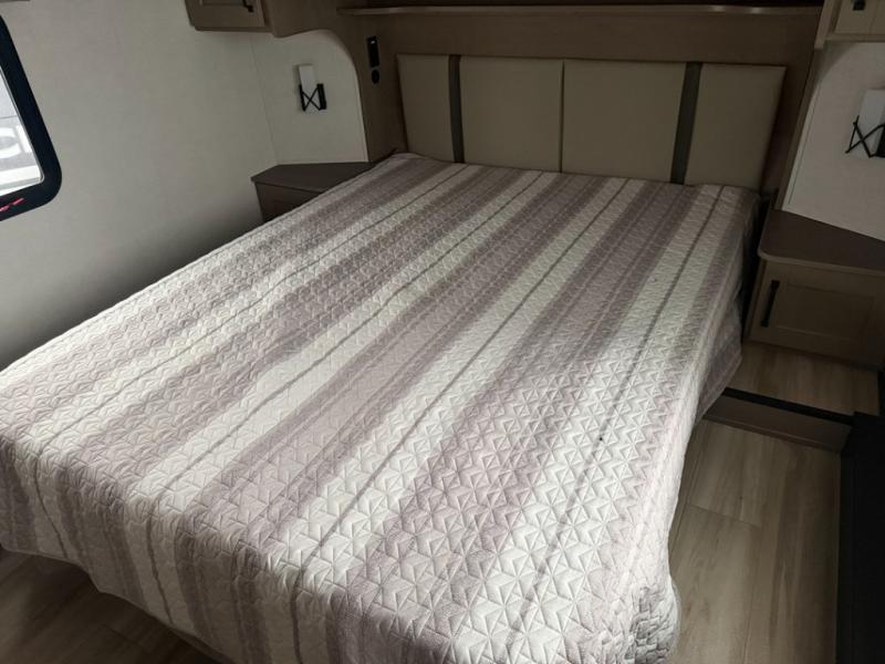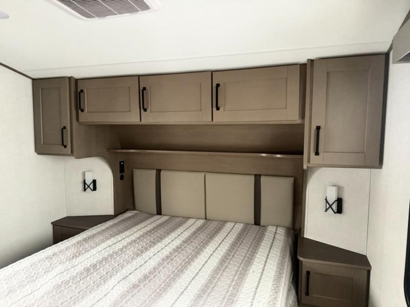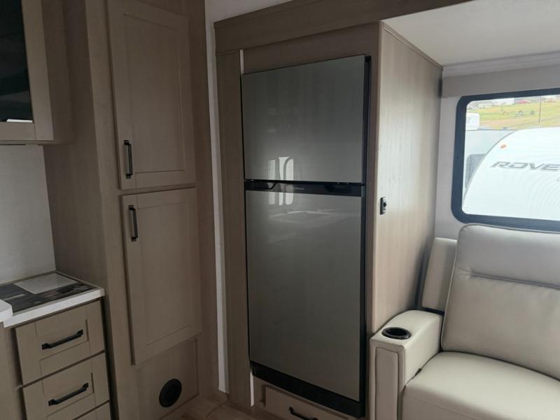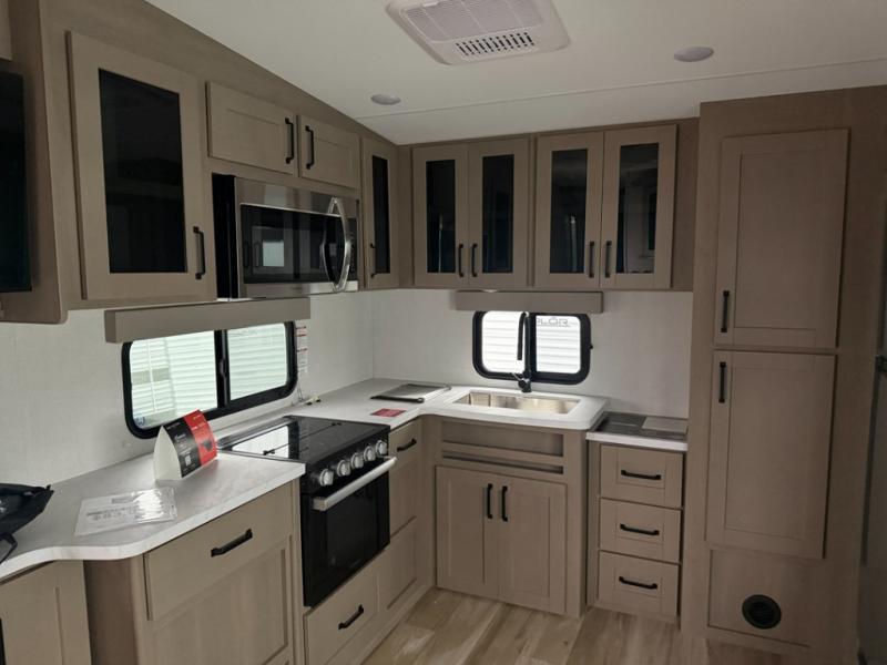 You will love this fifth wheel featuring a single slide for added interior living space and all the comforts and conveniences it provides you while you travel. The slide features a 78" theater seat plus there is a breakfast nook for more seating. Both can easily view the entertainment center with 40" TV. A rear kitchen indoors provides everything you need to create meals like home while on the road, and if you want to spend as much time outside as possible, then the outdoor griddle will certainly accommodate you for meals. Up front, a cozy private bedroom with queen bed, wardrobe, and overhead cabinets. Right next door, you will find a large walk-in shower, as well as a toilet, and a vanity with sink and linen cabinet for your towels and toiletries. You will also love the full unobstructed pass-through compartment for all of your gear, plus so much more!