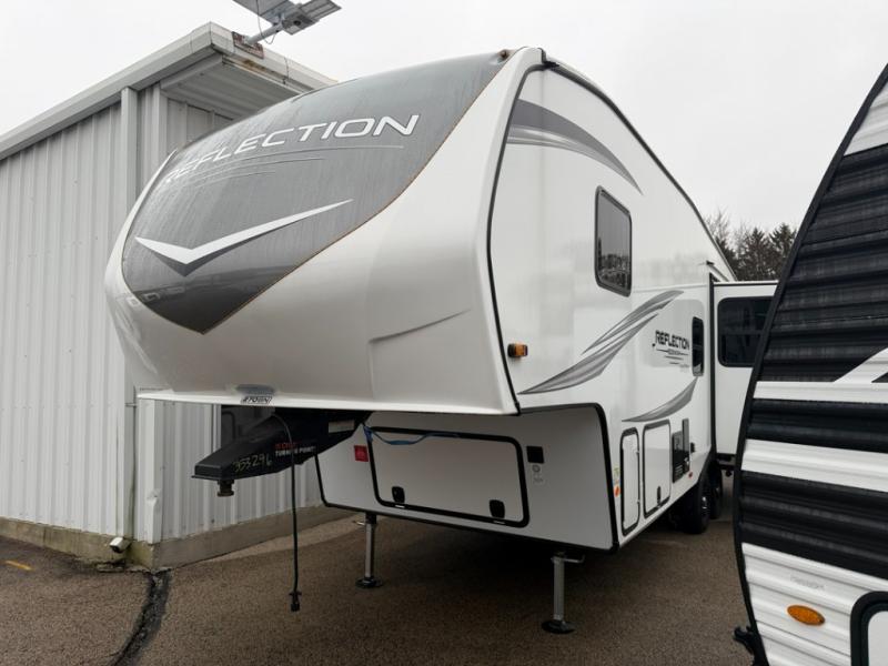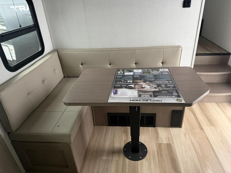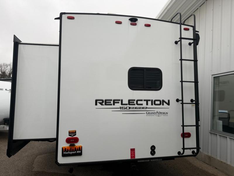 With any Reflection 150 Series fifth wheel by Grand Design, there is more available payload capacity and a broader range of half-ton trucks capable of towing this fifth wheel, and no slider hitch is needed thanks to the 90-degree turning radius which makes them short bed friendly and easier to tow. The mandatory Ultimate Power package provides a "One-Touch" automatic leveling system and a detachable power cord with LED light for easy setup, plus motion sensor pass-through lighting and entry lighting, and the Tire Linc TPMS will help you stay safe on the road. The interior offers residential luxury from the cabinetry and premium Congoleum flooring, to the booth dinette and residential-style window treatment. Make your refined decision today!