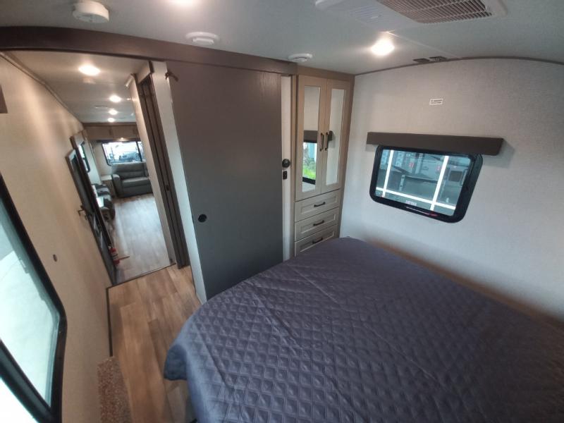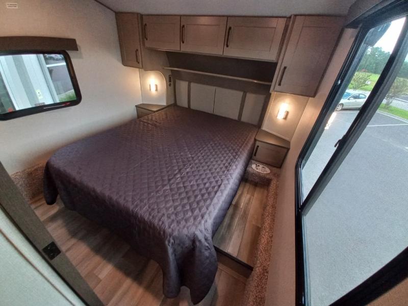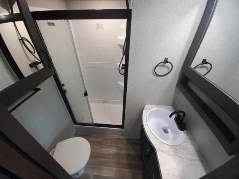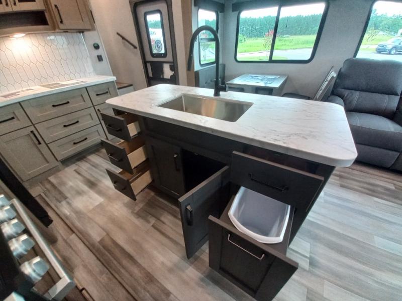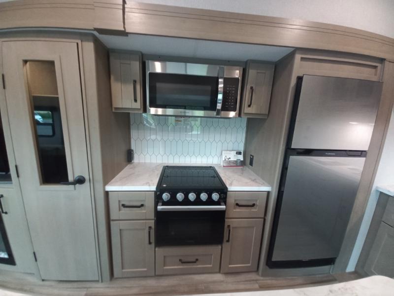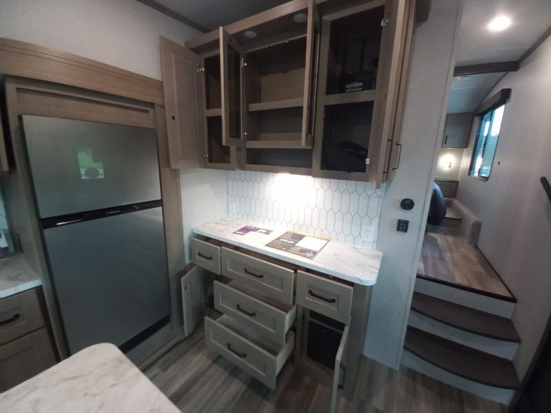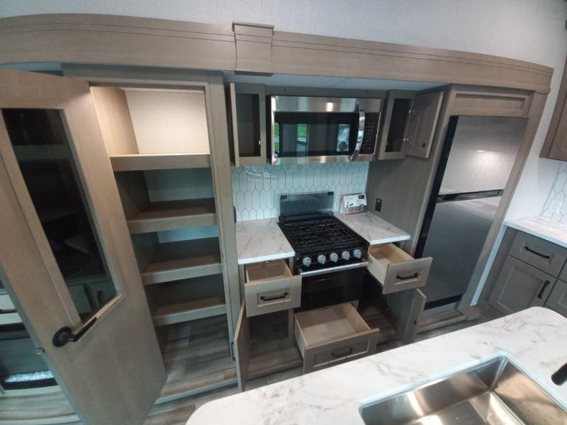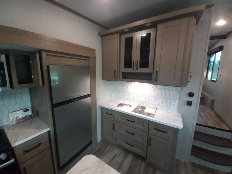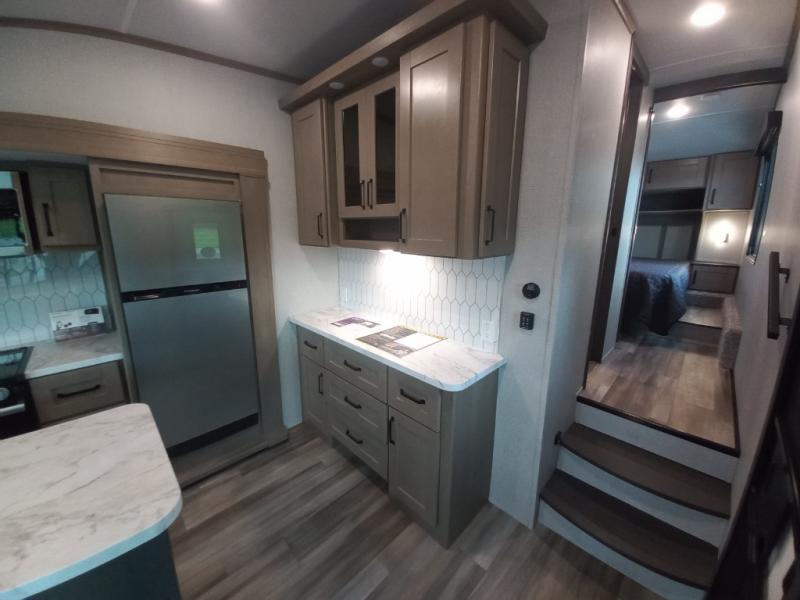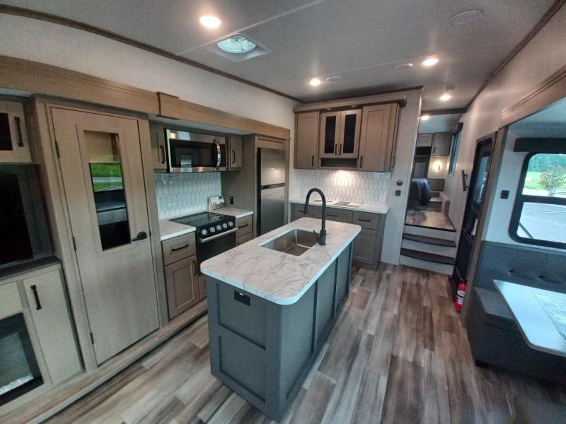 Get ready to enjoy everything the campgrounds and surrounding area has to offer when you are setup to camp in this fifth wheel! The two electric awnings offer protected areas creating outdoor living spaces, just grab your camping chairs from the unobstructed pass-through storage. And the interior offers a spacious living area and kitchen combination with two slide outs. You can sit on the tri-fold sofa or the booth dinette with an option for a swivel dinette. The hutch and kitchen island offer counter space to prepare and serve meals, and there is a large pantry for goodies. The 40" LED HDTV with fireplace below provides entertainment before bedtime or on a rainy day. And the front bedroom offers privacy, a walk-around queen bed, storage, and it is next to the full bathroom which is just a few steps down the hallway.