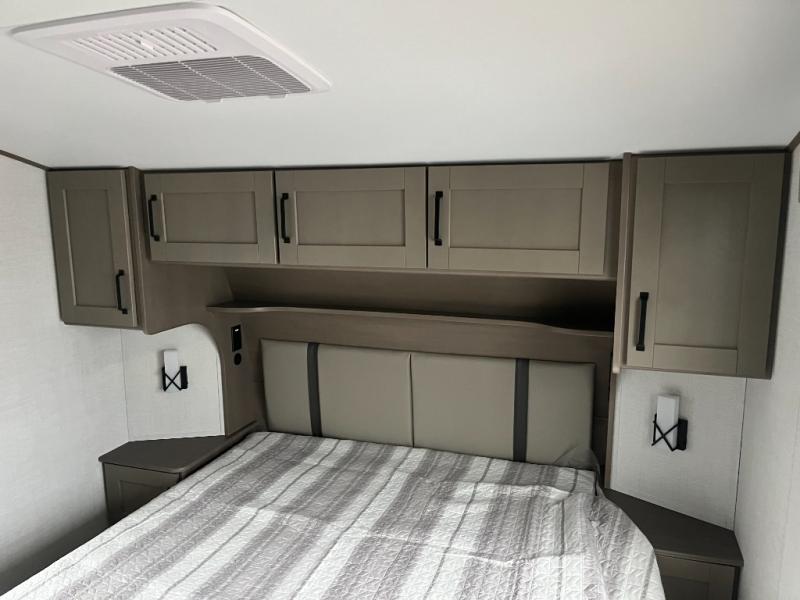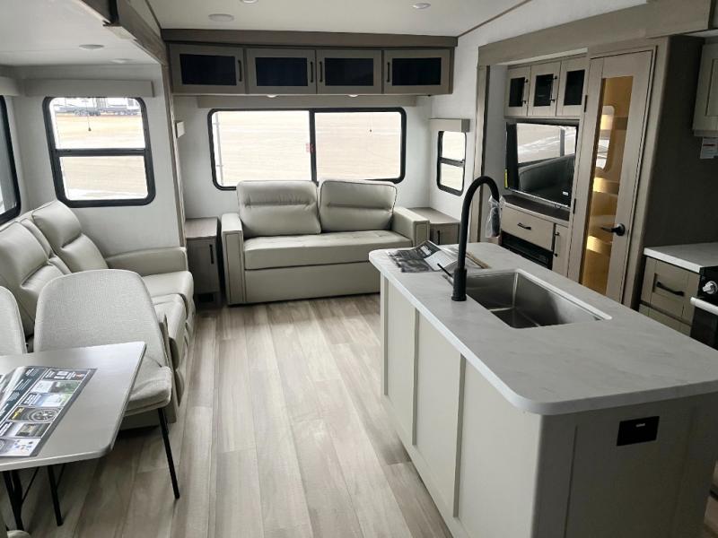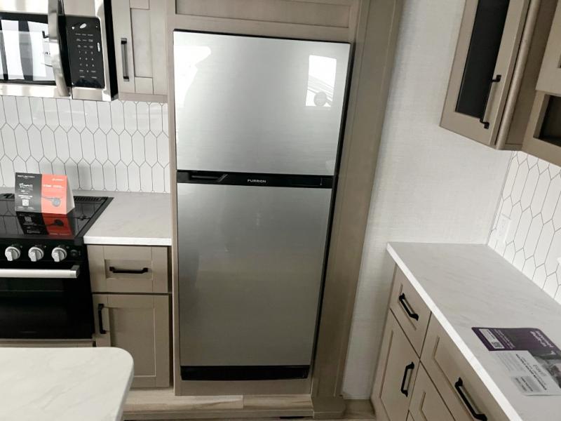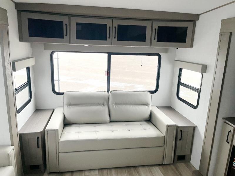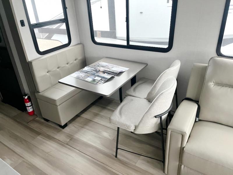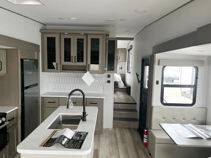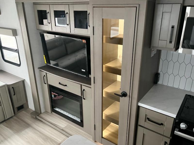 Get ready to enjoy everything the campgrounds and surrounding area has to offer when you are setup to camp in this fifth wheel! The two electric awnings offer protected areas creating outdoor living spaces; just grab your camping chairs from the unobstructed pass-through storage. And the interior offers a spacious living area and kitchen combination with dual opposing slides for maximum space. You can sit on the tri-fold sofa or the booth dinette with an option for a swivel dinette. The hutch and kitchen island offer counter space to prepare and serve meals, and there is a large pantry for goodies. The 40" LED HDTV with a fireplace below provides entertainment before bedtime or on a rainy day. And the front bedroom offers privacy, a walk-around queen bed, and plenty of storage!