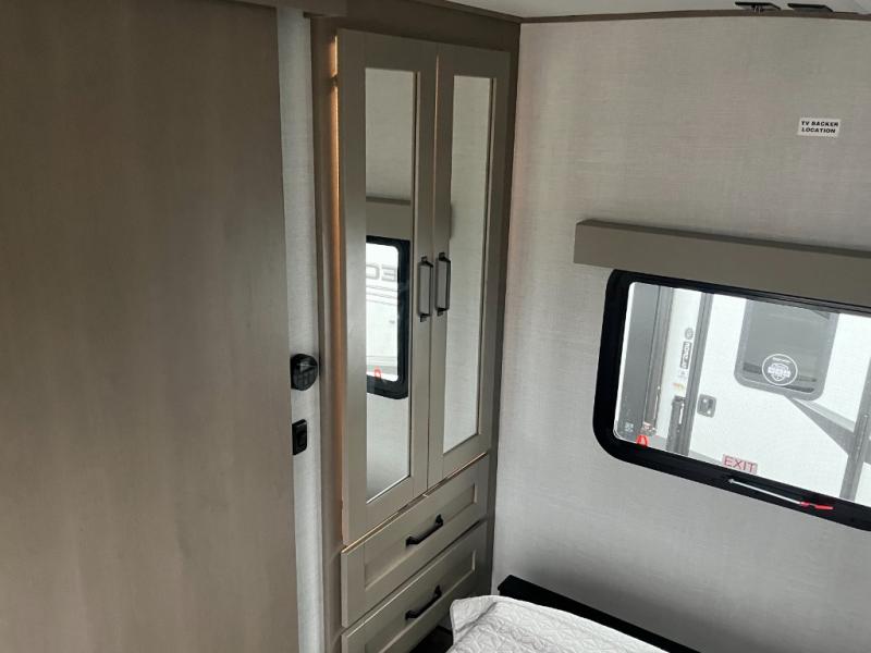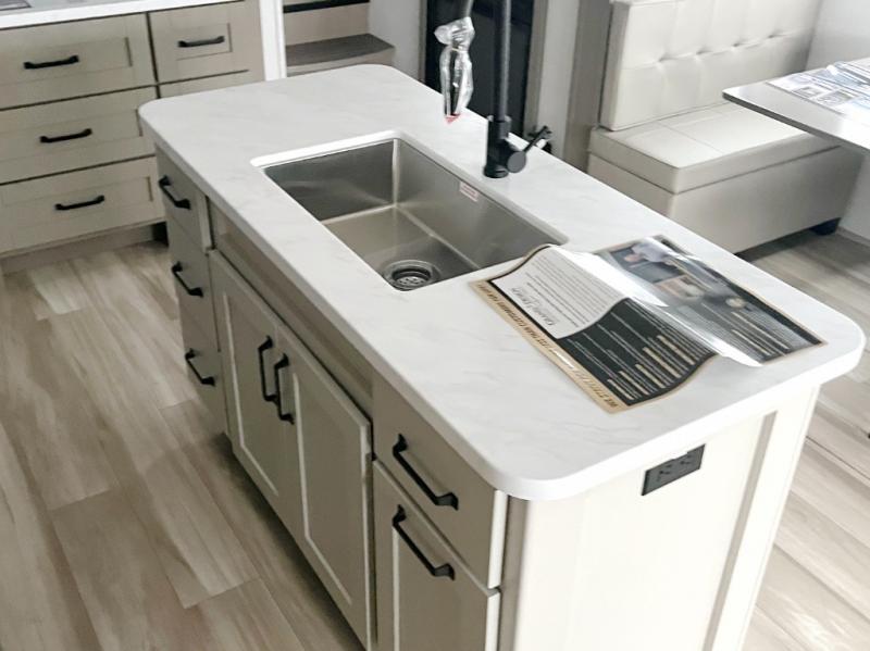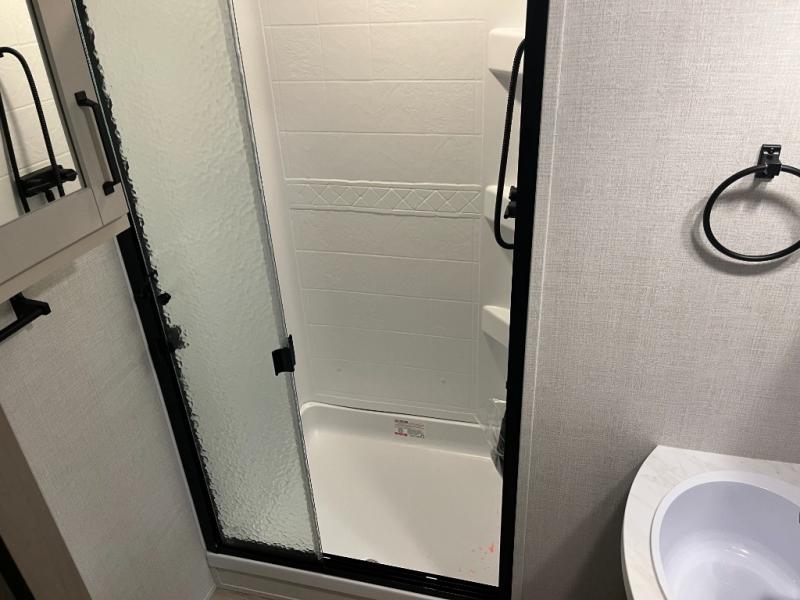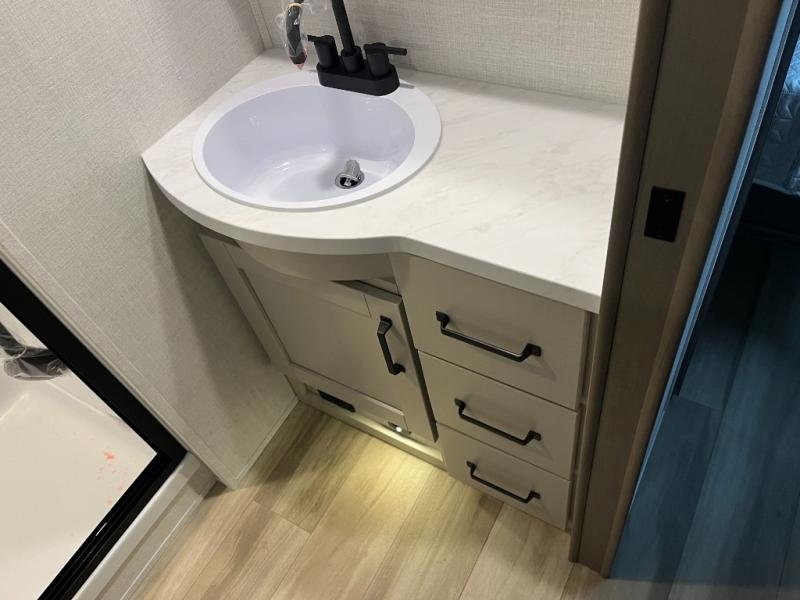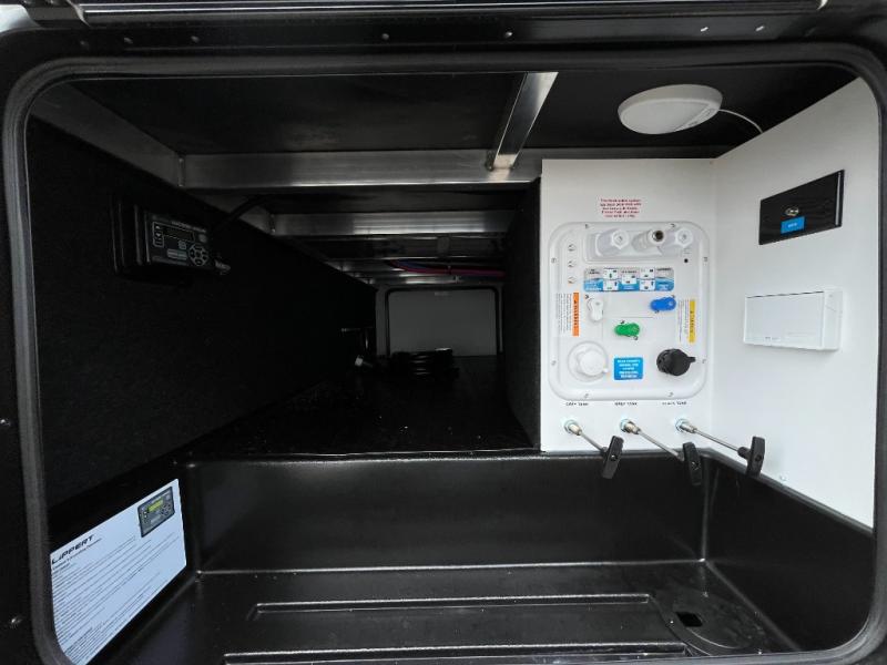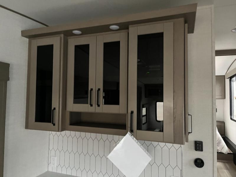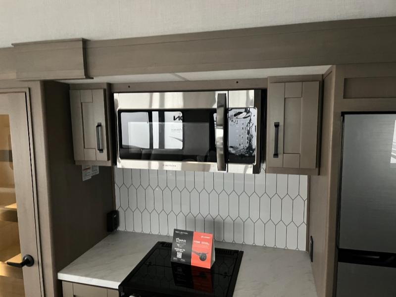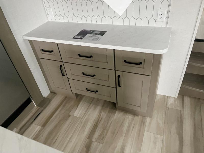 Get ready to enjoy everything the campgrounds and surrounding area has to offer when you are setup to camp in this fifth wheel! The two electric awnings offer protected areas creating outdoor living spaces; just grab your camping chairs from the unobstructed pass-through storage. And the interior offers a spacious living area and kitchen combination with dual opposing slides for maximum space. You can sit on the tri-fold sofa or the booth dinette with an option for a swivel dinette. The hutch and kitchen island offer counter space to prepare and serve meals, and there is a large pantry for goodies. The 40" LED HDTV with a fireplace below provides entertainment before bedtime or on a rainy day. And the front bedroom offers privacy, a walk-around queen bed, and plenty of storage!