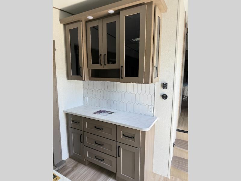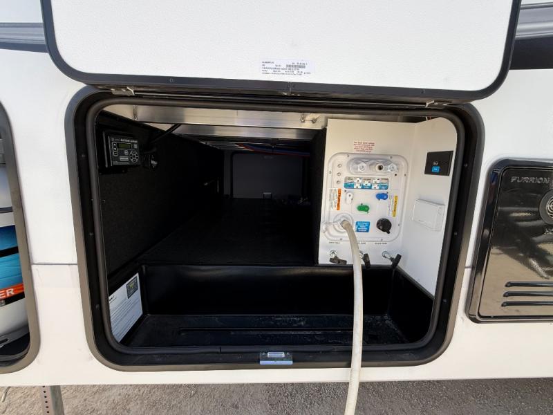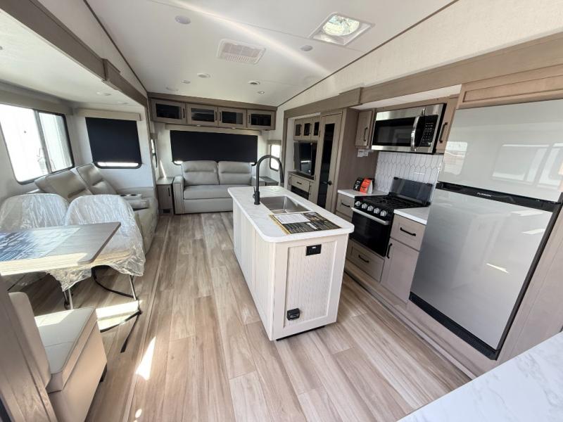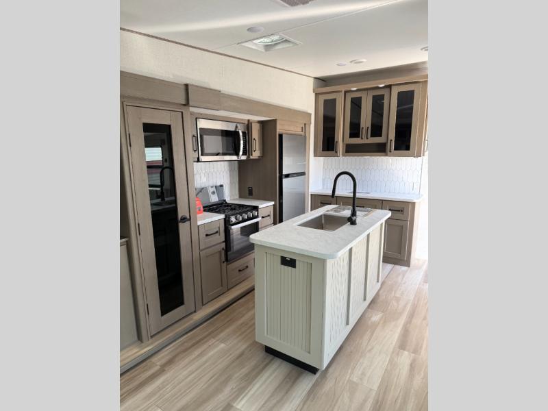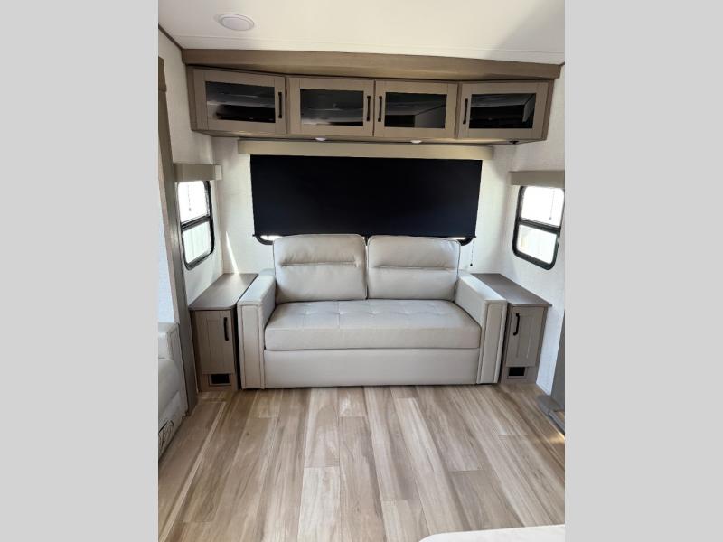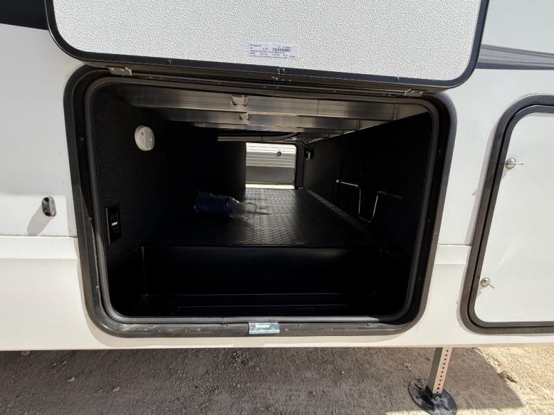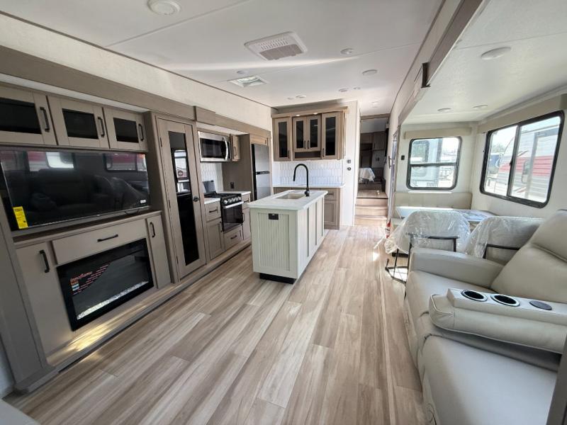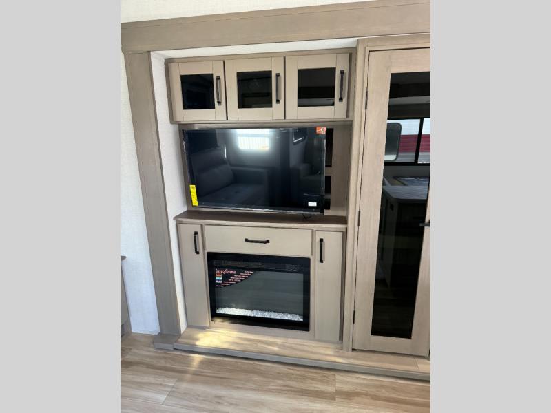 Get ready to enjoy everything the campgrounds and surrounding area has to offer when you are setup to camp in this fifth wheel! The two electric awnings offer protected areas creating outdoor living spaces; just grab your camping chairs from the unobstructed pass-through storage. And the interior offers a spacious living area and kitchen combination with dual opposing slides for maximum space. You can sit on the tri-fold sofa or the booth dinette with an option for a swivel dinette. The hutch and kitchen island offer counter space to prepare and serve meals, and there is a large pantry for goodies. The 40" LED HDTV with a fireplace below provides entertainment before bedtime or on a rainy day. And the front bedroom offers privacy, a walk-around queen bed, and plenty of storage!