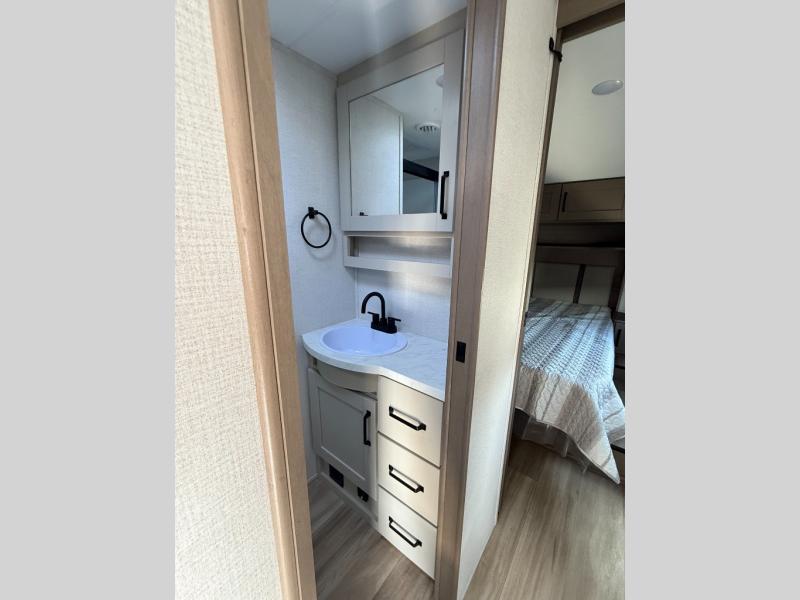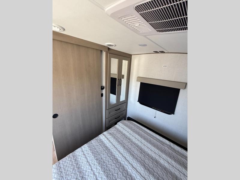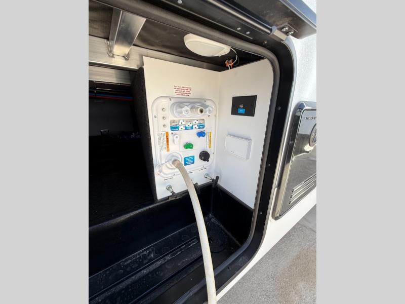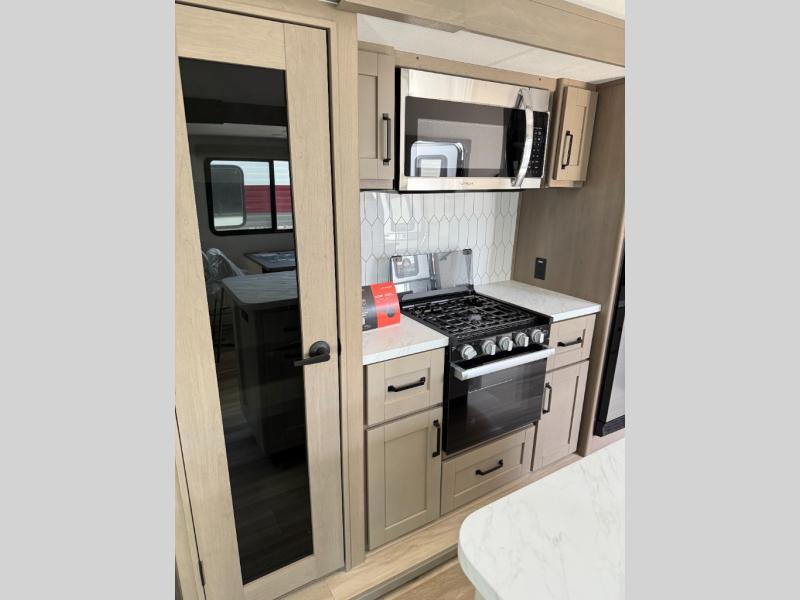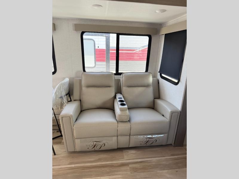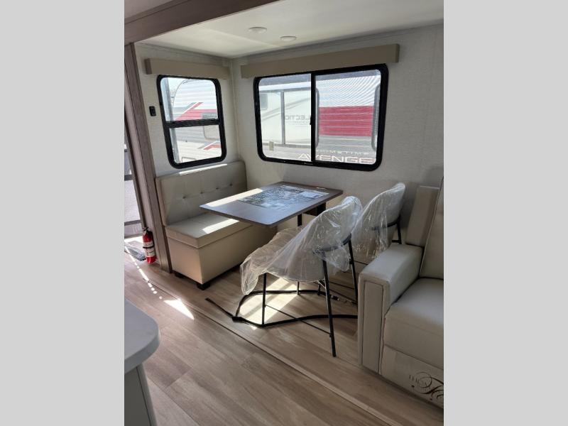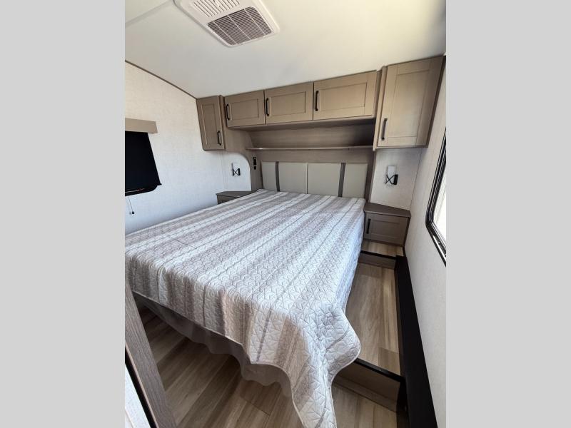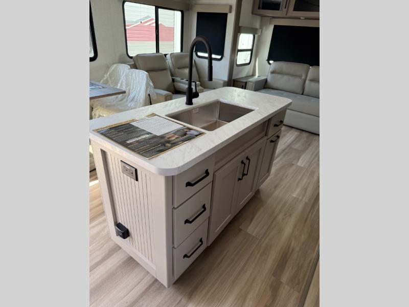 Get ready to enjoy everything the campgrounds and surrounding area has to offer when you are setup to camp in this fifth wheel! The two electric awnings offer protected areas creating outdoor living spaces; just grab your camping chairs from the unobstructed pass-through storage. And the interior offers a spacious living area and kitchen combination with dual opposing slides for maximum space. You can sit on the tri-fold sofa or the booth dinette with an option for a swivel dinette. The hutch and kitchen island offer counter space to prepare and serve meals, and there is a large pantry for goodies. The 40" LED HDTV with a fireplace below provides entertainment before bedtime or on a rainy day. And the front bedroom offers privacy, a walk-around queen bed, and plenty of storage!