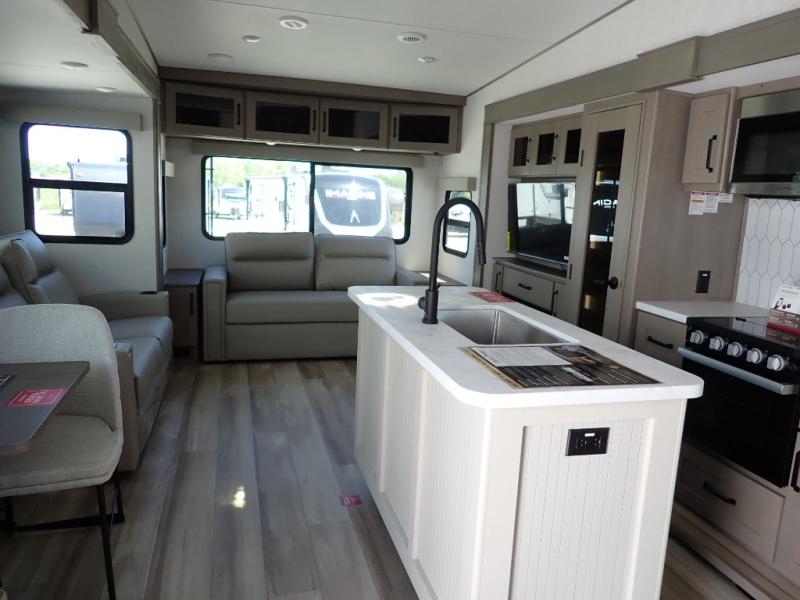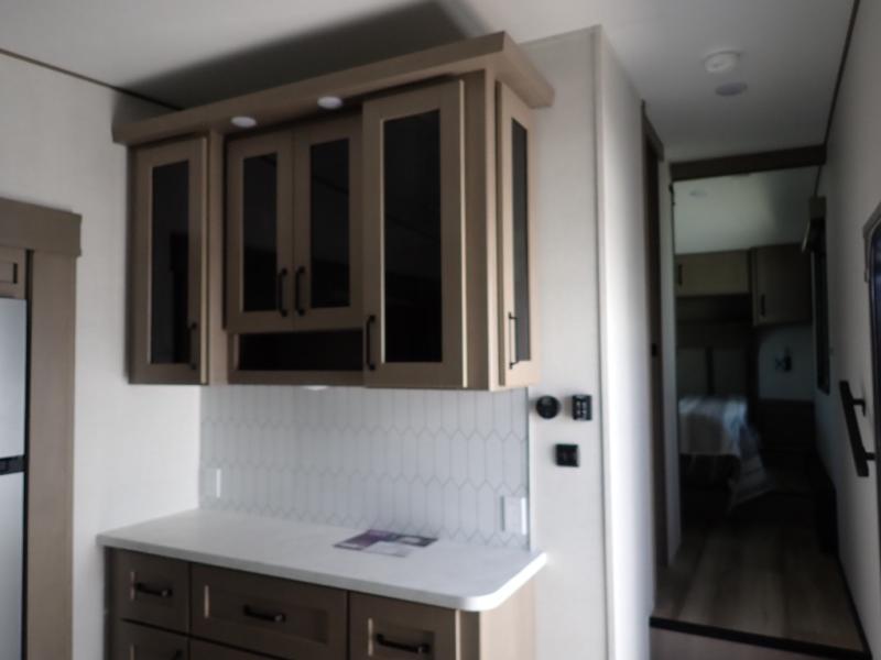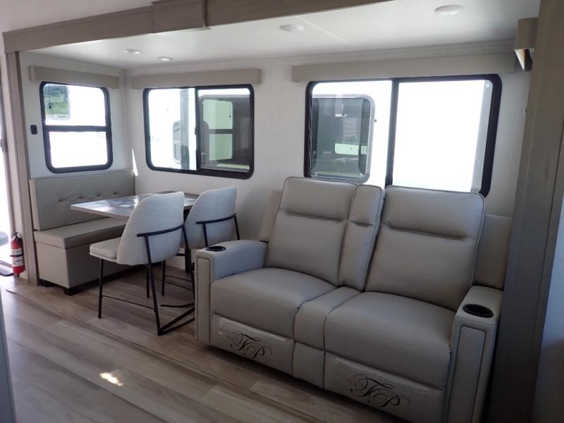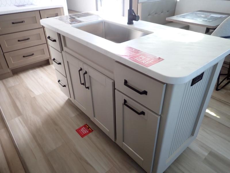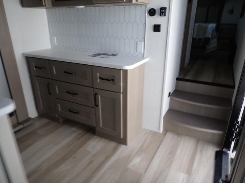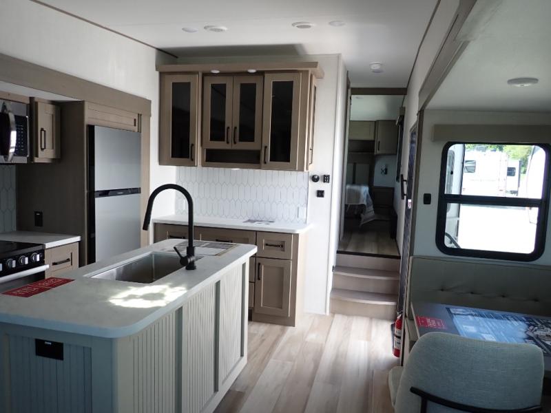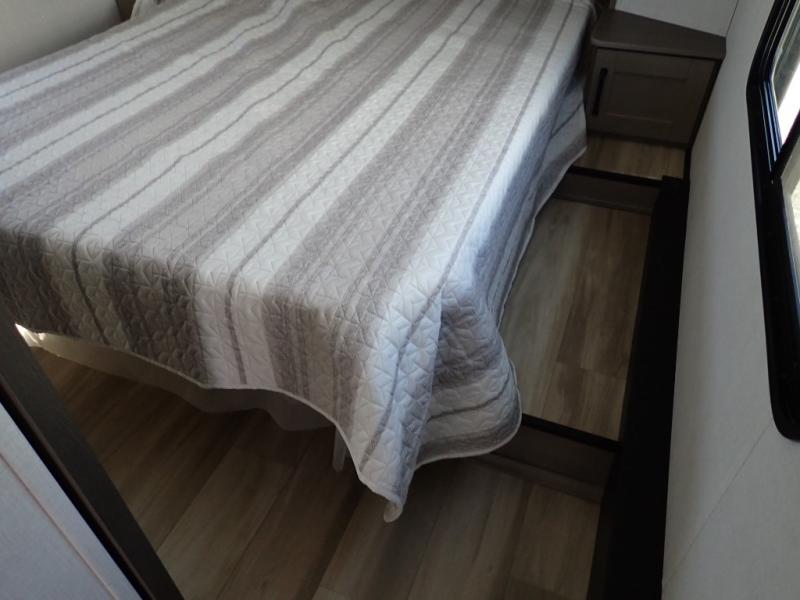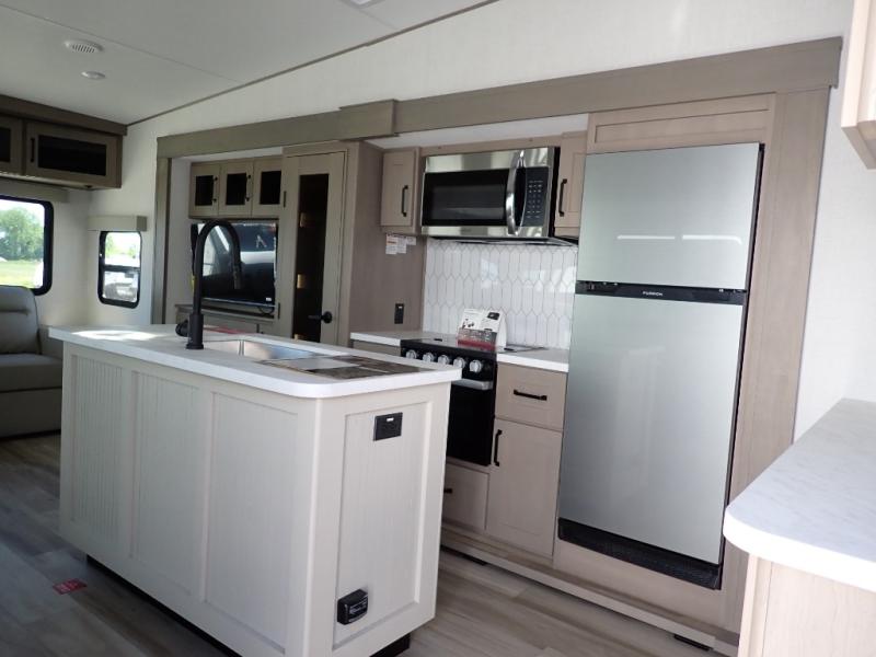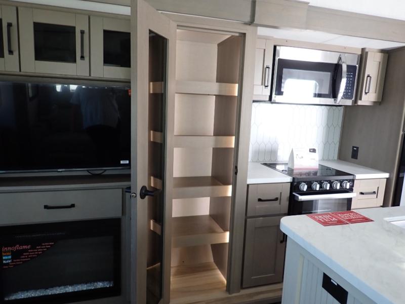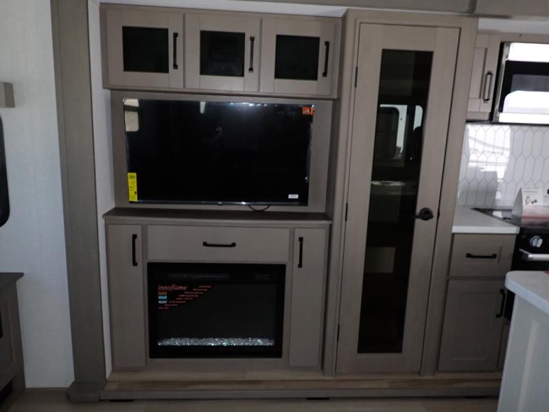 Get ready to enjoy everything the campgrounds and surrounding area has to offer when you are setup to camp in this fifth wheel! The two electric awnings offer protected areas creating outdoor living spaces, just grab your camping chairs from the unobstructed pass-through storage. And the interior offers a spacious living area and kitchen combination with two slide outs. You can sit on the tri-fold sofa or the booth dinette with an option for a swivel dinette. The hutch and kitchen island offer counter space to prepare and serve meals, and there is a large pantry for goodies. The 40" LED HDTV with fireplace below provides entertainment before bedtime or on a rainy day. And the front bedroom offers privacy, a walk-around queen bed, storage, and it is next to the full bathroom which is just a few steps down the hallway.