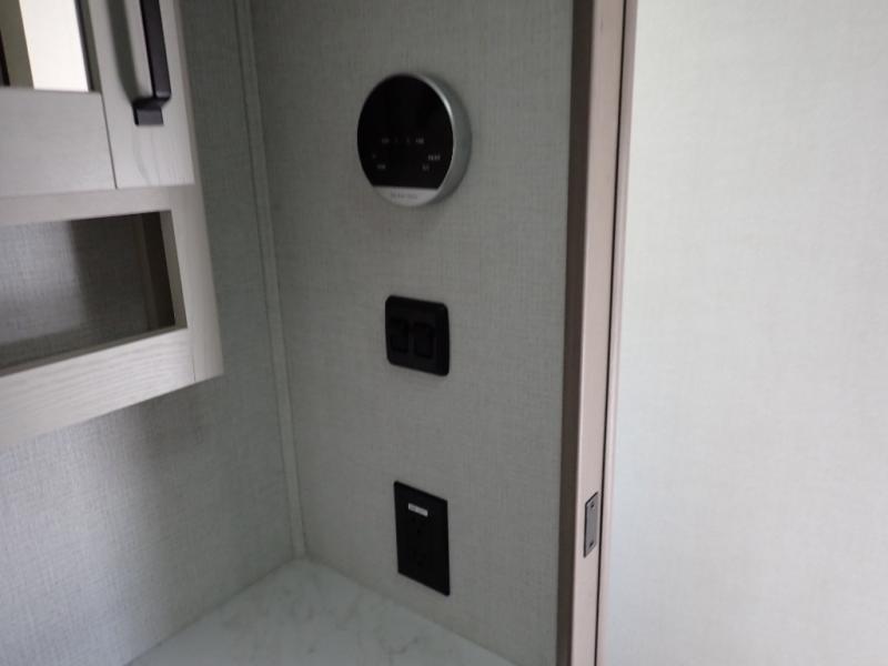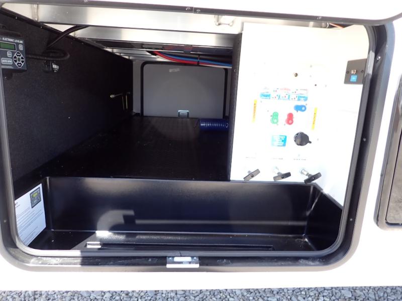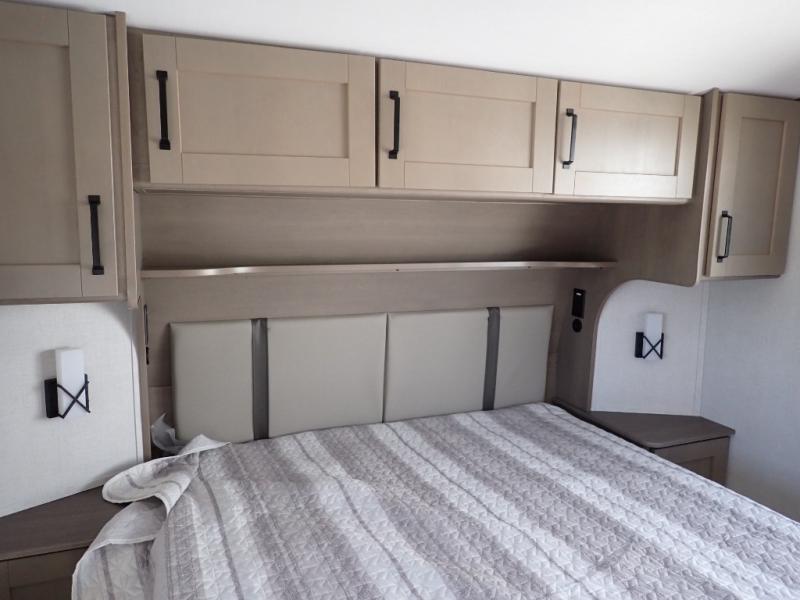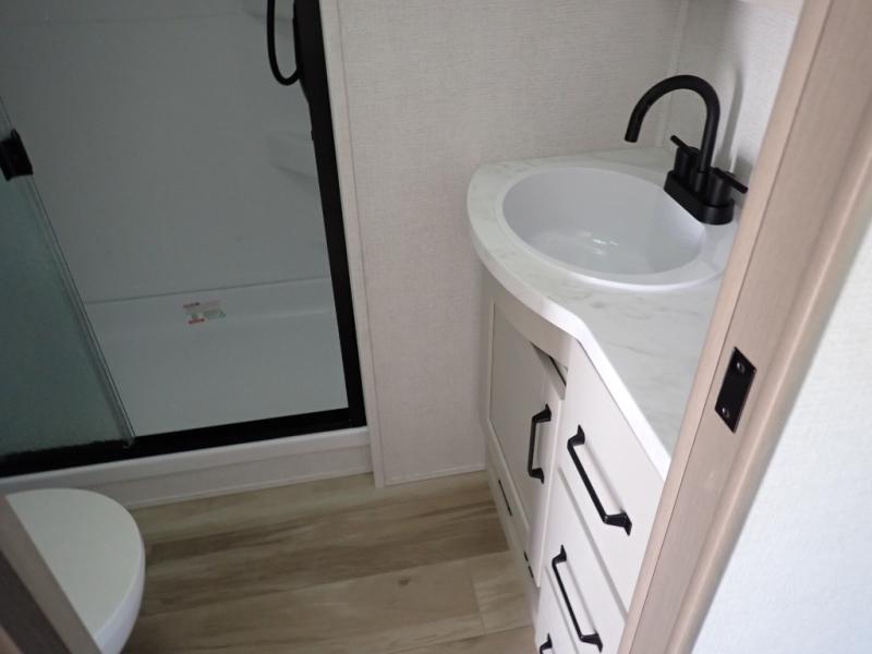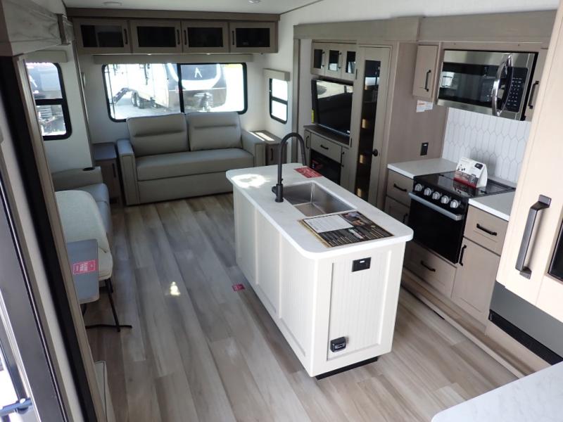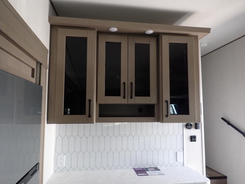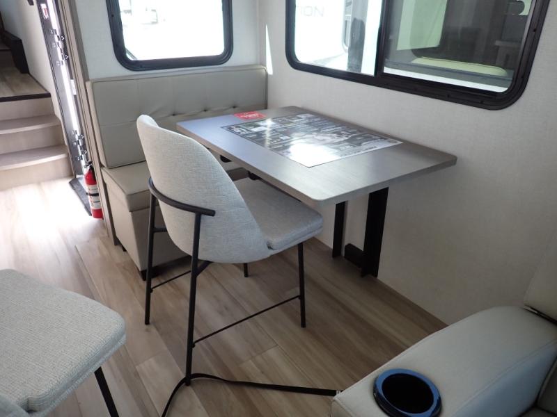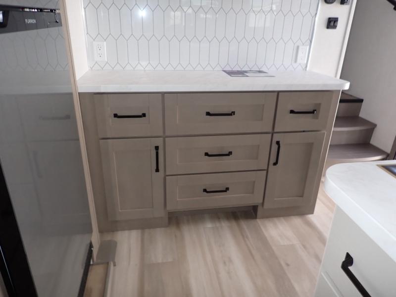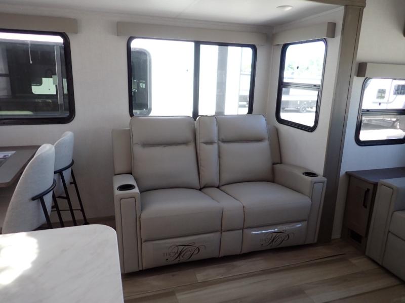 Get ready to enjoy everything the campgrounds and surrounding area has to offer when you are setup to camp in this fifth wheel! The two electric awnings offer protected areas creating outdoor living spaces, just grab your camping chairs from the unobstructed pass-through storage. And the interior offers a spacious living area and kitchen combination with two slide outs. You can sit on the tri-fold sofa or the booth dinette with an option for a swivel dinette. The hutch and kitchen island offer counter space to prepare and serve meals, and there is a large pantry for goodies. The 40" LED HDTV with fireplace below provides entertainment before bedtime or on a rainy day. And the front bedroom offers privacy, a walk-around queen bed, storage, and it is next to the full bathroom which is just a few steps down the hallway.