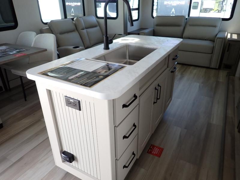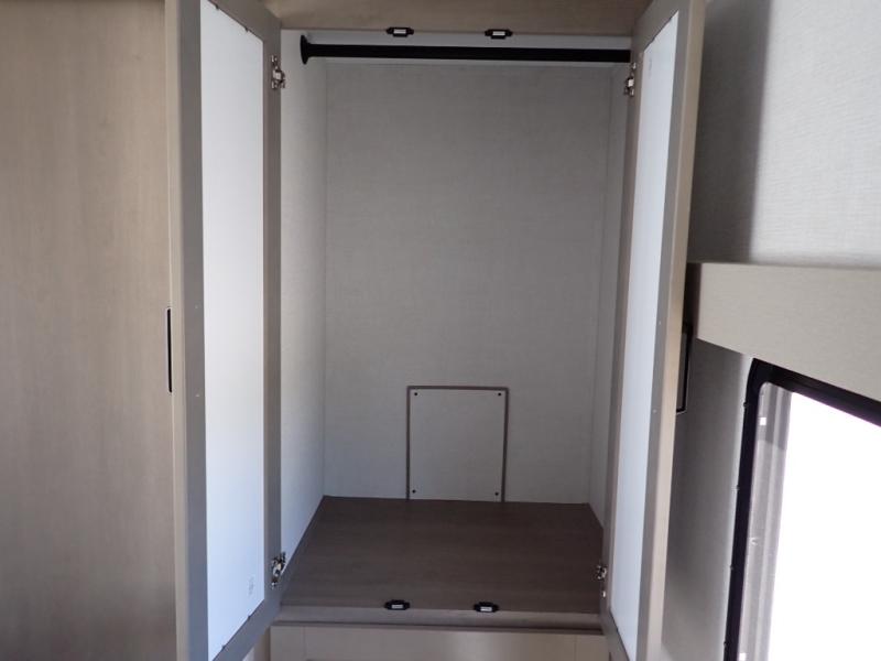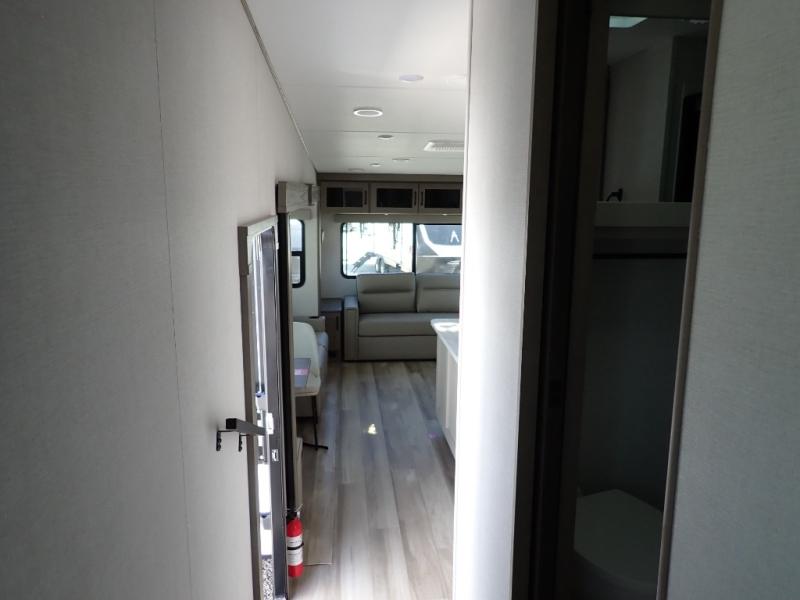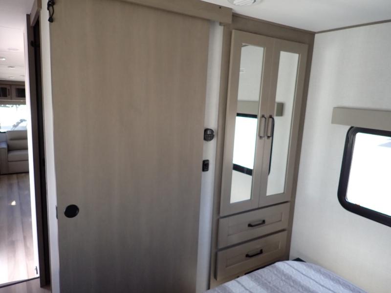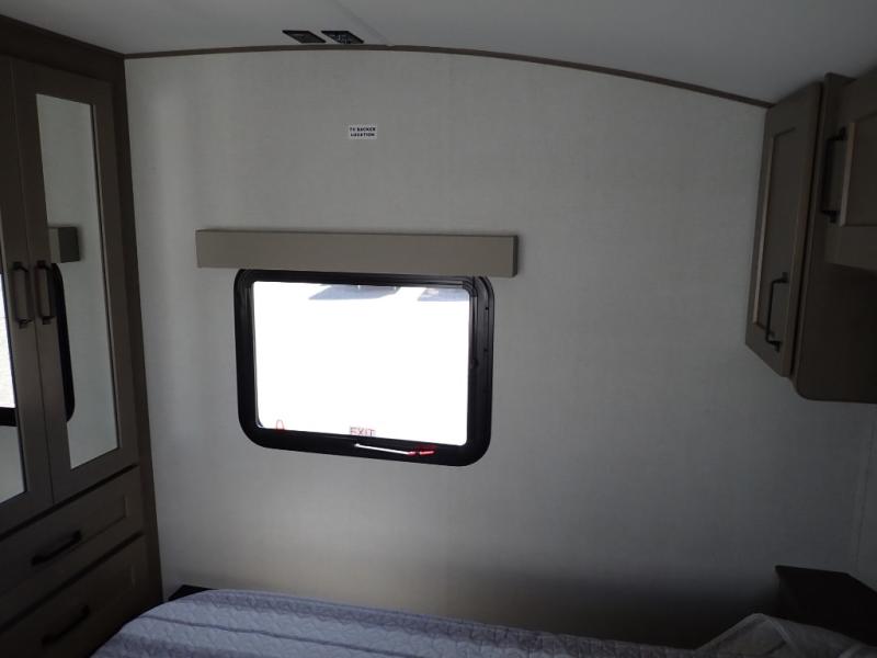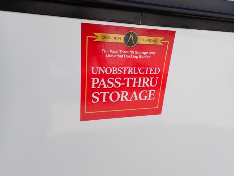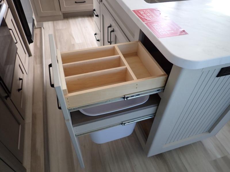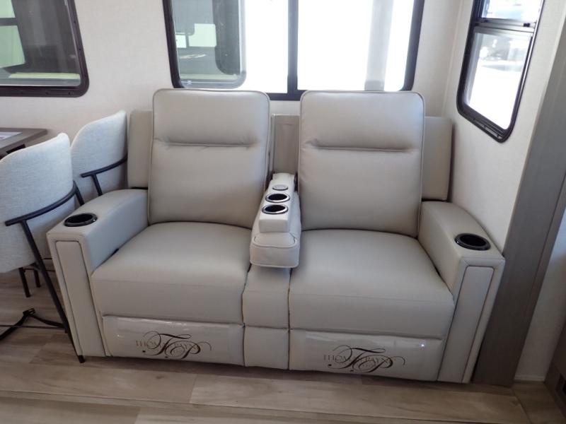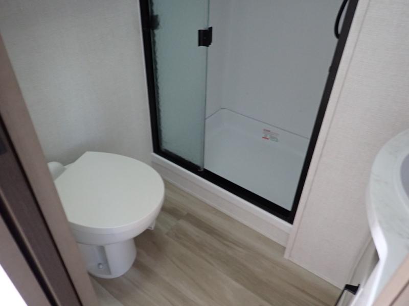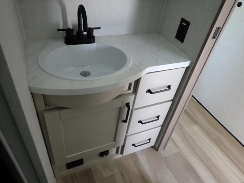 Get ready to enjoy everything the campgrounds and surrounding area has to offer when you are setup to camp in this fifth wheel! The two electric awnings offer protected areas creating outdoor living spaces, just grab your camping chairs from the unobstructed pass-through storage. And the interior offers a spacious living area and kitchen combination with two slide outs. You can sit on the tri-fold sofa or the booth dinette with an option for a swivel dinette. The hutch and kitchen island offer counter space to prepare and serve meals, and there is a large pantry for goodies. The 40" LED HDTV with fireplace below provides entertainment before bedtime or on a rainy day. And the front bedroom offers privacy, a walk-around queen bed, storage, and it is next to the full bathroom which is just a few steps down the hallway.