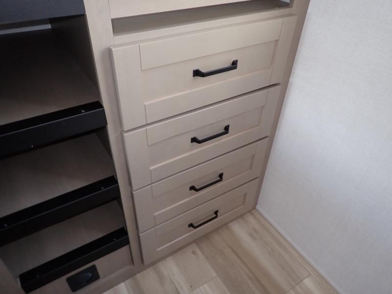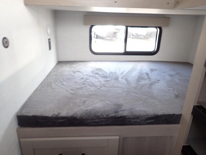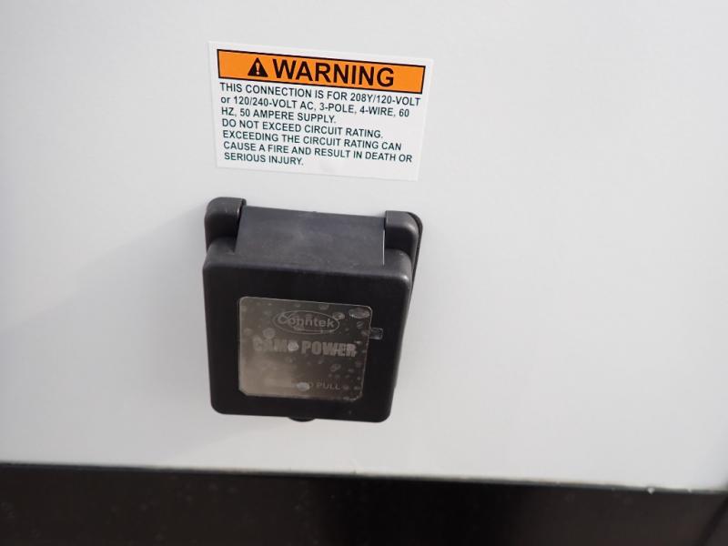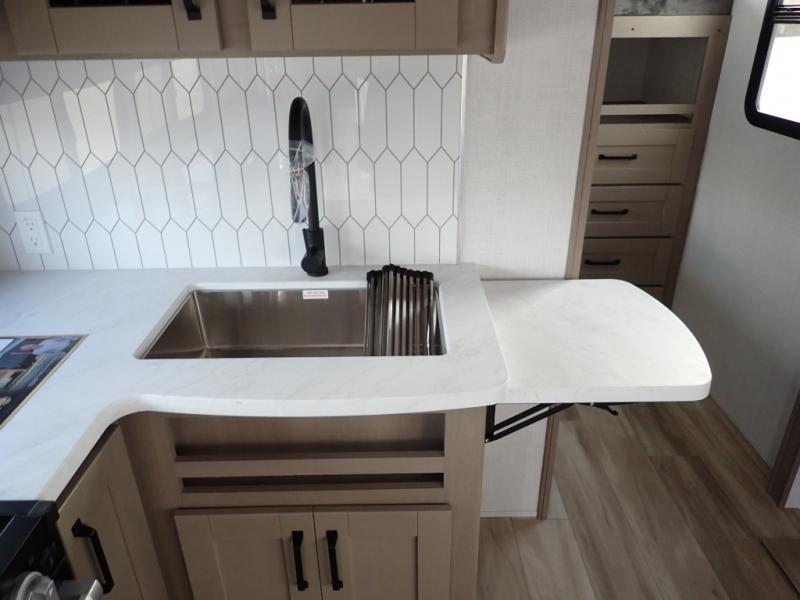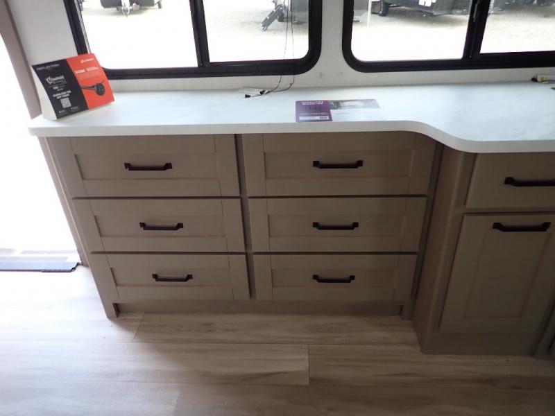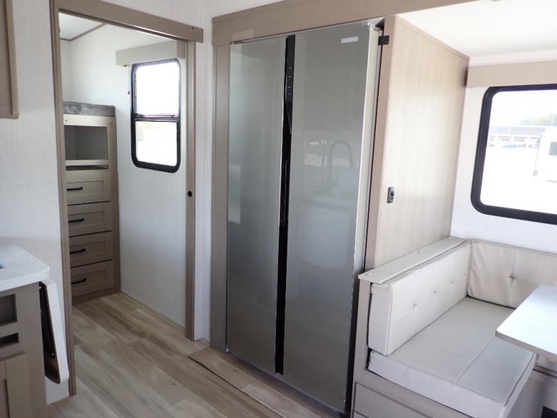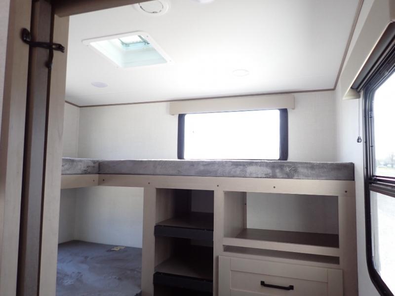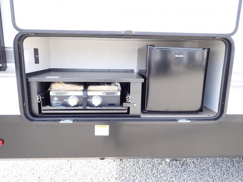 The whole family will enjoy camping in this fifth wheel! The kiddos will love having their own privacy with the rear private bunkhouse that has a 30" top bunk above a set of drawers, a 34" top bunk above a 48" lower bunk, and a TV prep area. You will enjoy having your own private retreat too with a front private bedroom that has a queen bed for a good night's rest and a wardrobe for your hang up clothes. You could even transform the U-shaped dinette and tri-fold sofa into extra sleeping spaces, and the dinette could be switched out for the optional 78" theater seating. The chef will have an easy time preparing their best dishes with the three burner cooktop and flip-up countertop or they can breathe in some fresh air while they cook at the outside kitchen with a griddle and 1.6 cu. ft. refrigerator for a cold beverage!