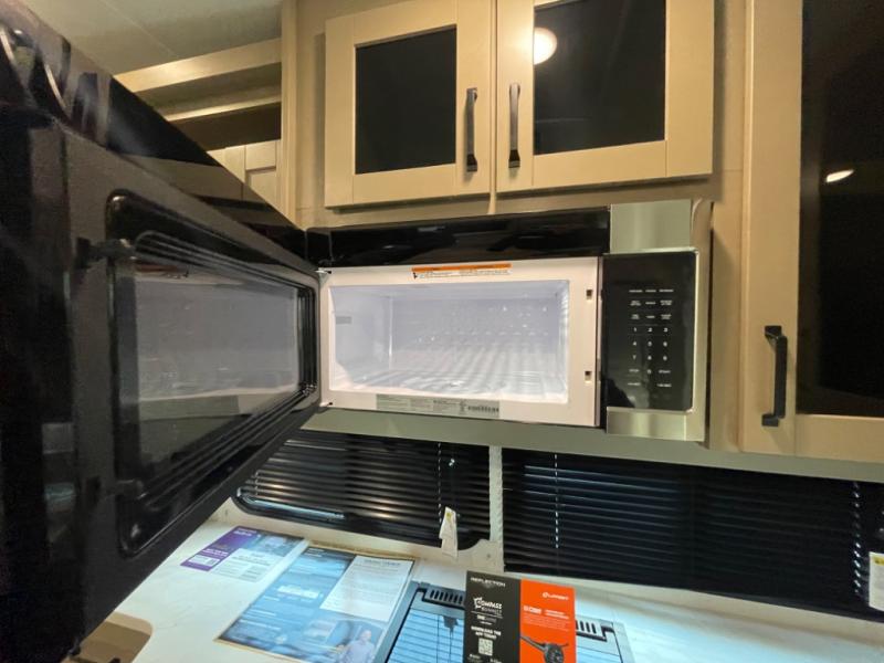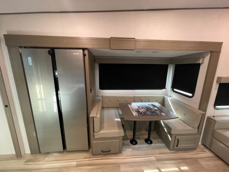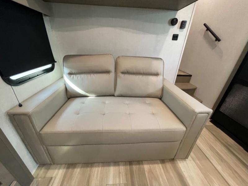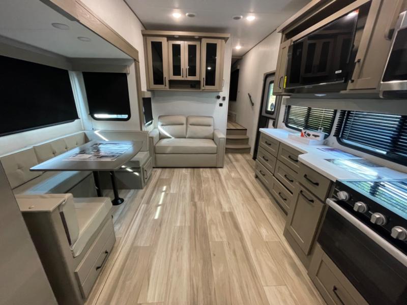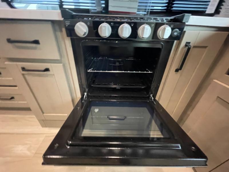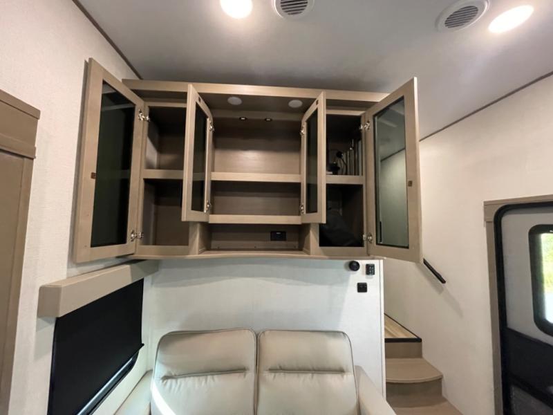 Built on Grand Design’s Reflection 150 Series platform, this fifth wheel offers increased payload capacity and compatibility with a wider range of half-ton trucks. The 90-degree turning radius eliminates the need for a slider hitch, making it short-bed friendly and easier to maneuver. The Ultimate Power Package comes standard, including one-touch automatic leveling, a detachable power cord with LED light, motion-sensor pass-through lighting, illuminated entry steps, and the Tire Linc TPMS for added confidence on the road.