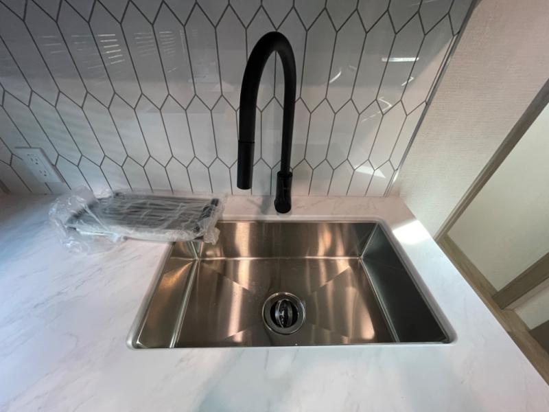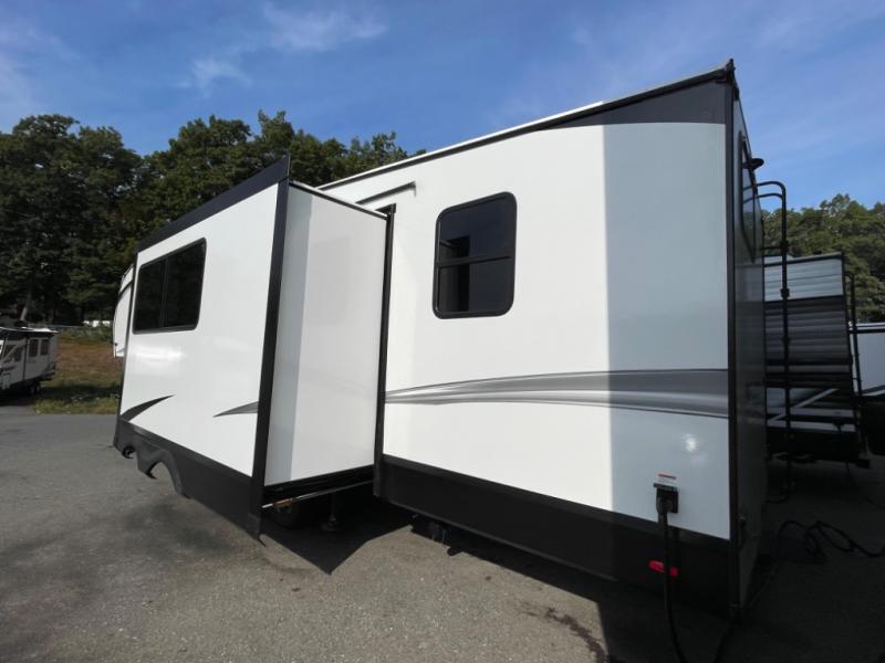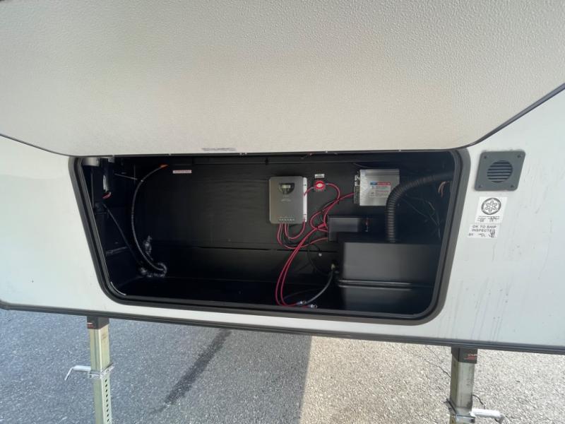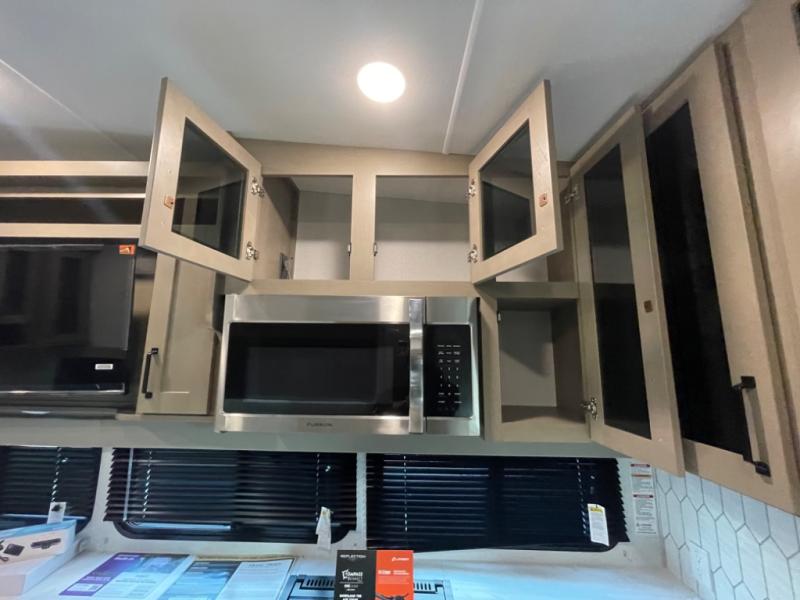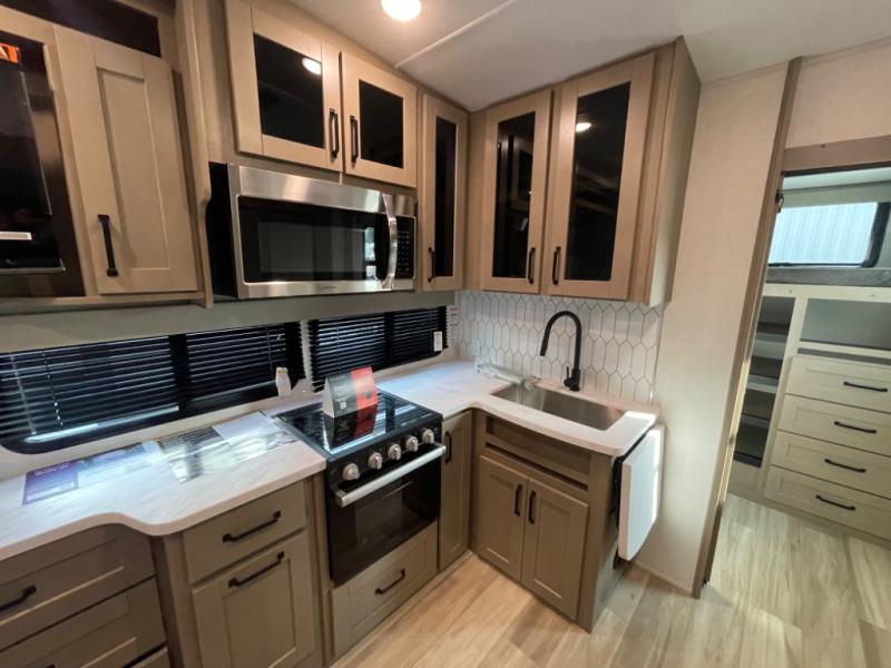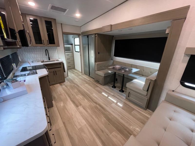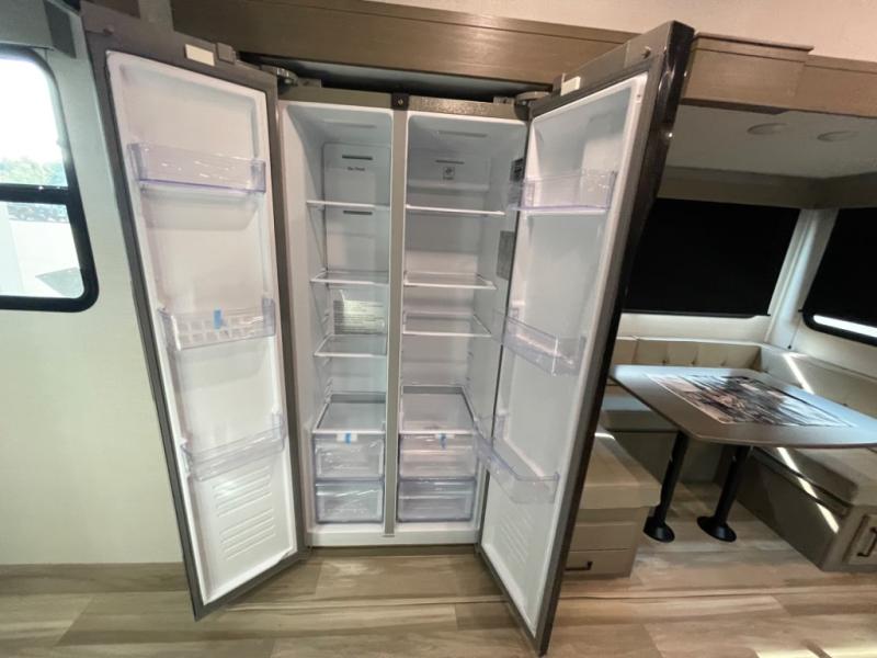 Built on Grand Design’s Reflection 150 Series platform, this fifth wheel offers increased payload capacity and compatibility with a wider range of half-ton trucks. The 90-degree turning radius eliminates the need for a slider hitch, making it short-bed friendly and easier to maneuver. The Ultimate Power Package comes standard, including one-touch automatic leveling, a detachable power cord with LED light, motion-sensor pass-through lighting, illuminated entry steps, and the Tire Linc TPMS for added confidence on the road.