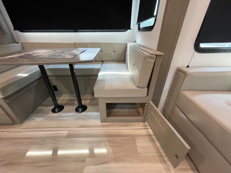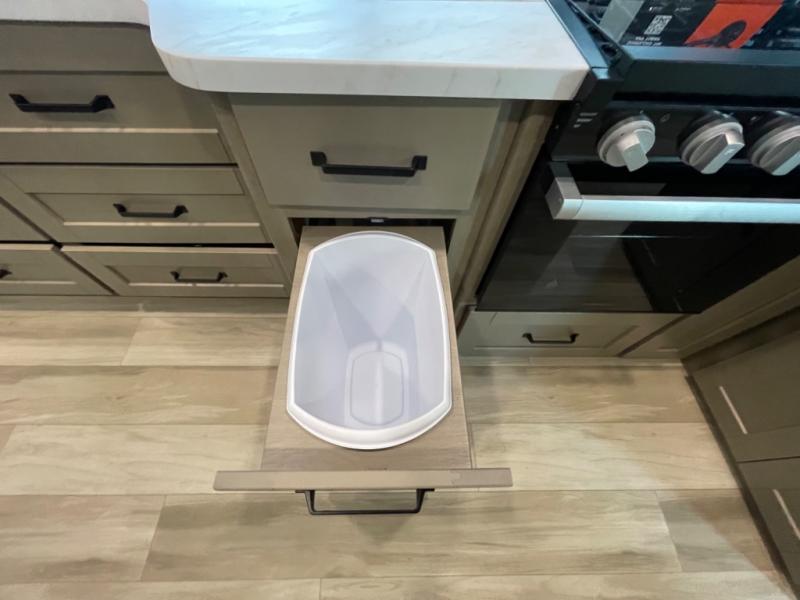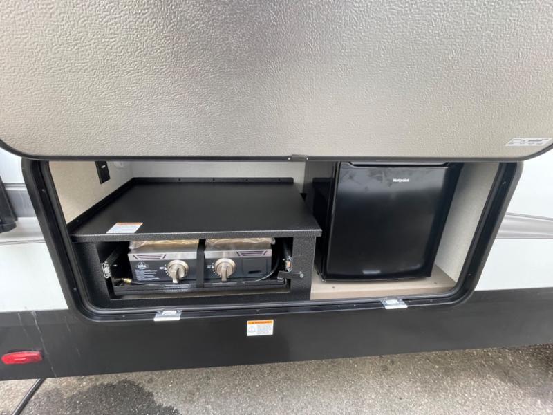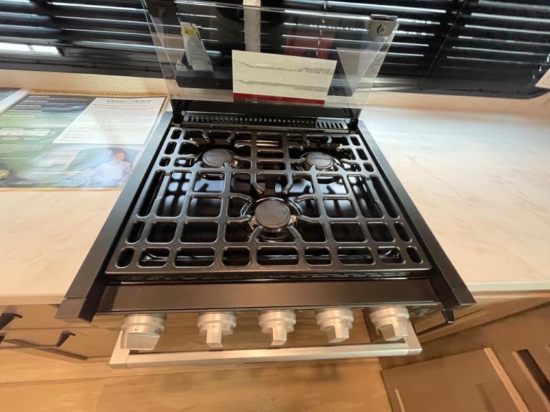 Cooking is simple and enjoyable whether you’re inside or out. The kitchen includes a three-burner cooktop, flip-up counter extension, and a 16 cu. ft. refrigerator to handle longer trips with ease. When the weather is right, take the meal prep outside using the exterior griddle and refrigerator, perfect for burgers, breakfast, or keeping drinks cold while you relax under the awning.