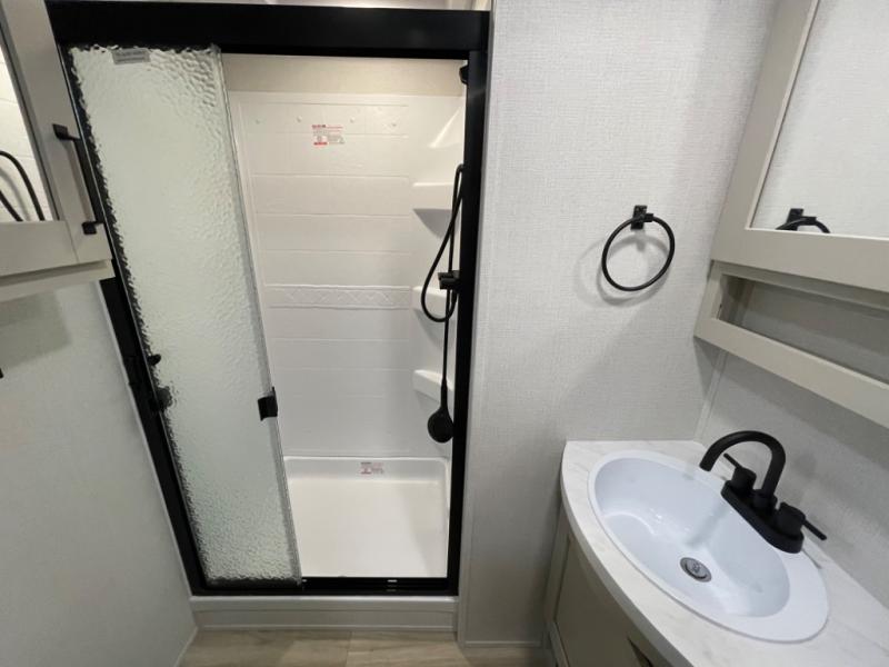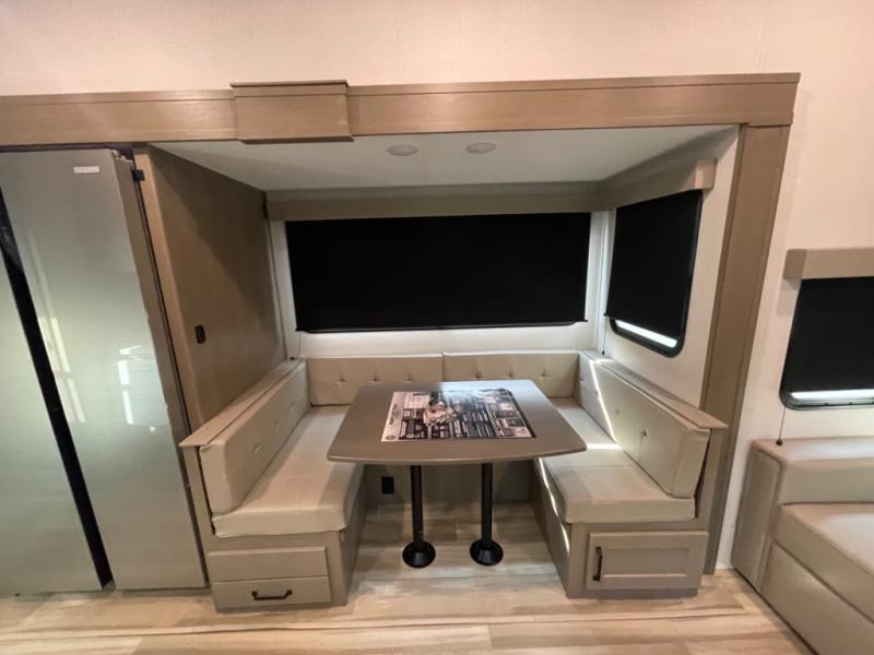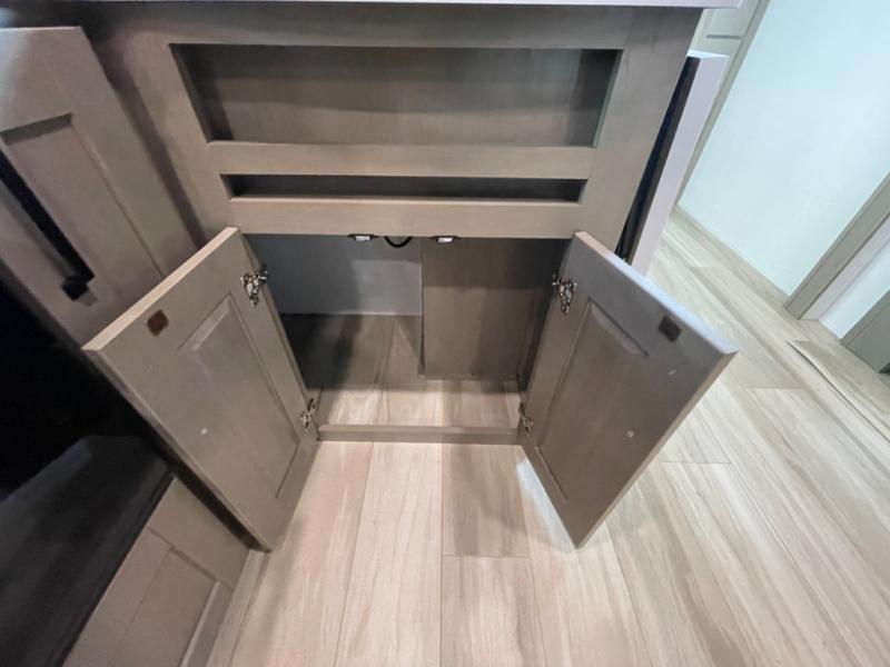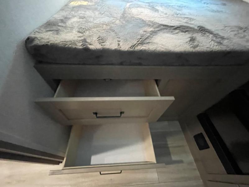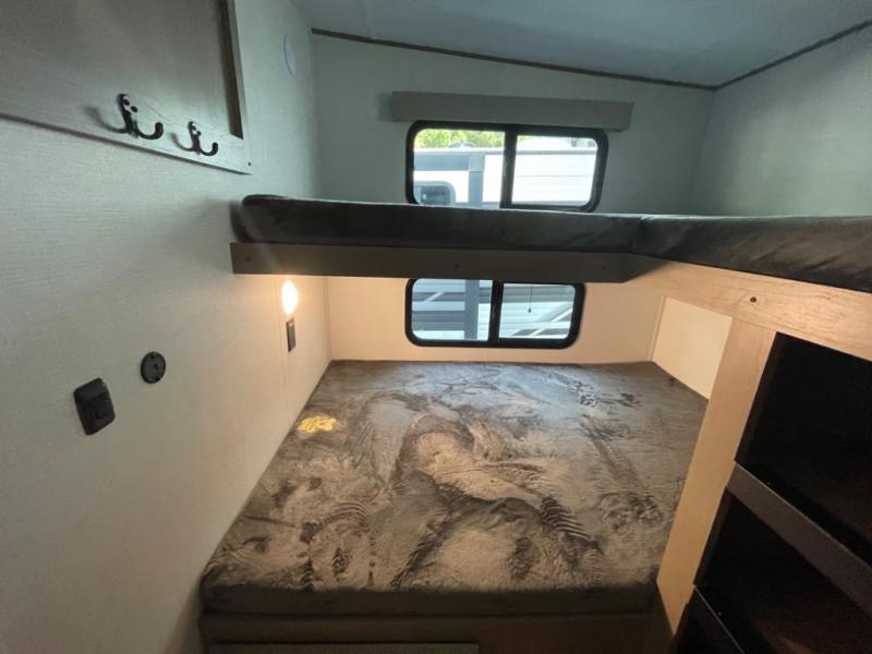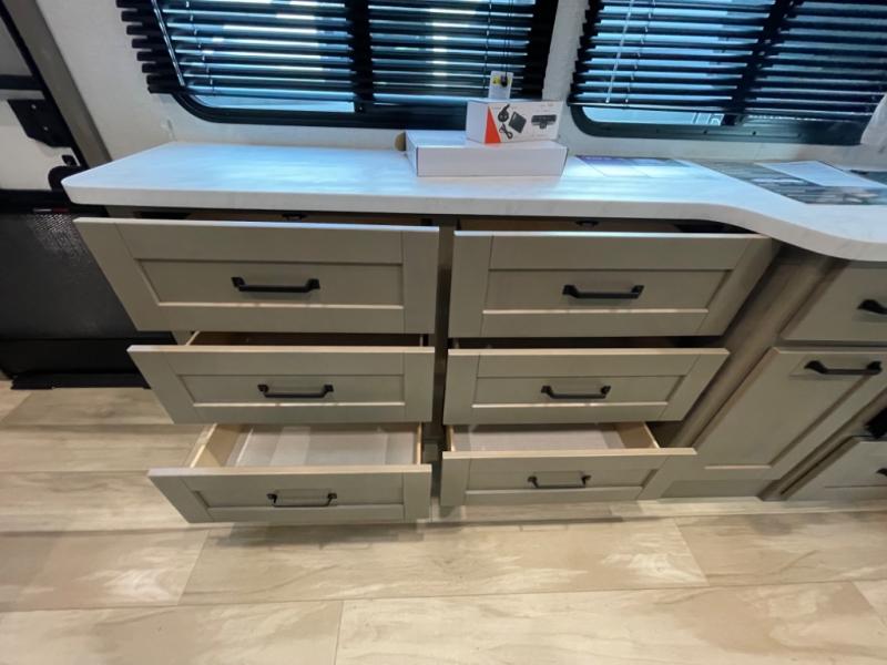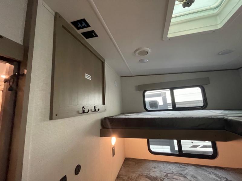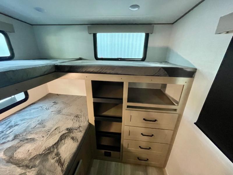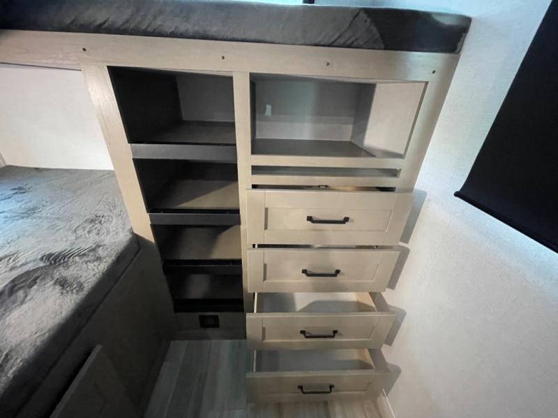The rear private bunkhouse gives kids or guests a space of their own, featuring multiple bunk configurations, built-in drawers for clothing or gear, and TV prep for movies or gaming nights. It’s a true bonus room that keeps the main living area calm and uncluttered.
