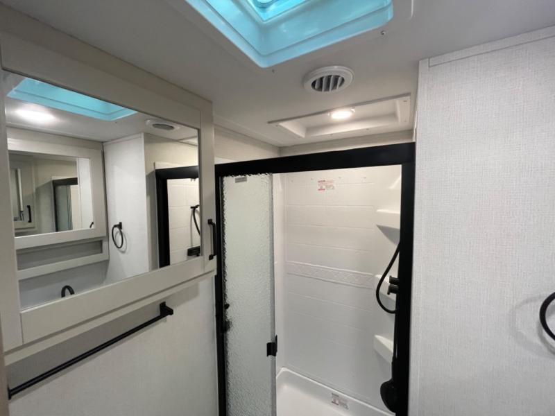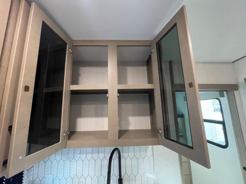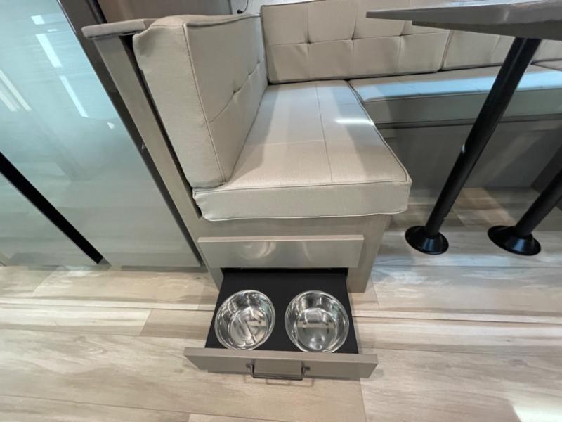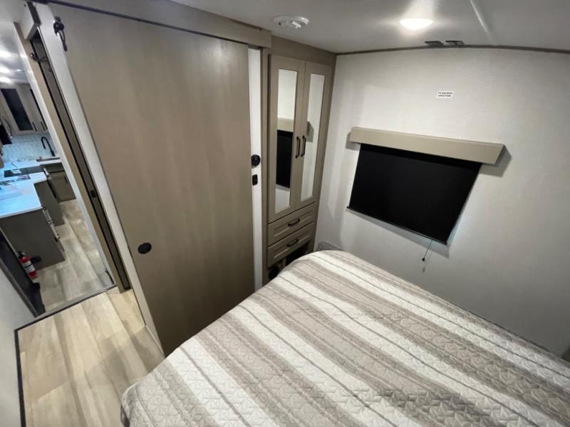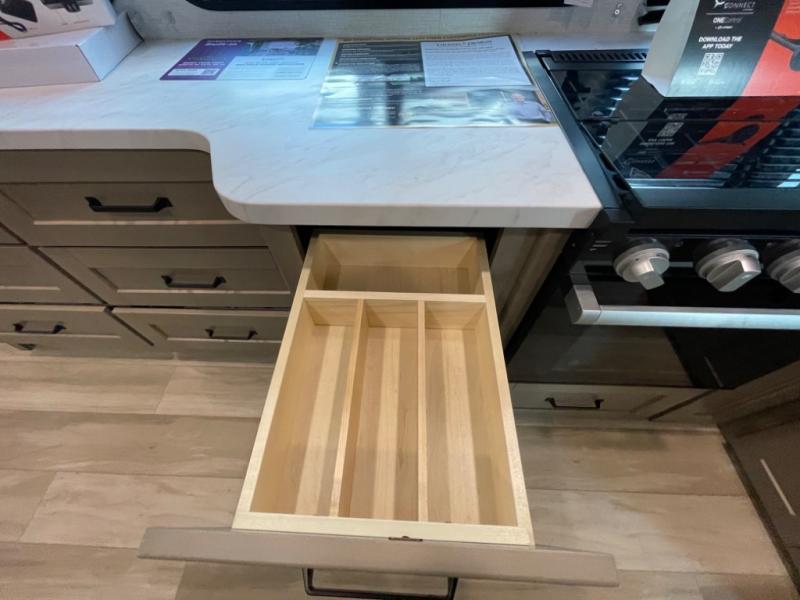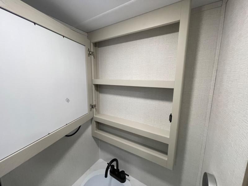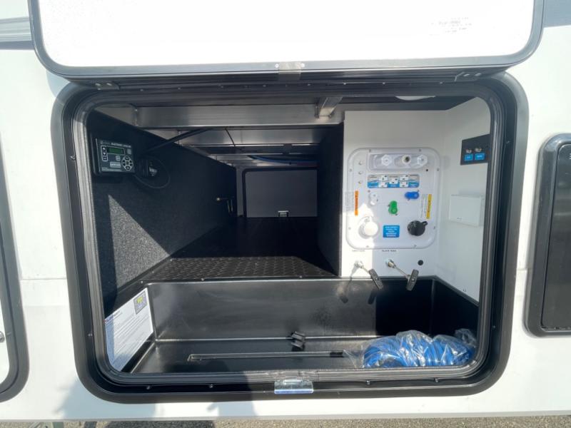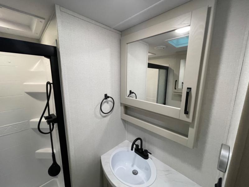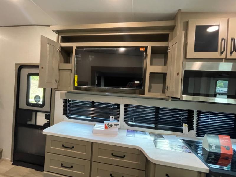 The rear private bunkhouse gives kids or guests a space of their own, featuring multiple bunk configurations, built-in drawers for clothing or gear, and TV prep for movies or gaming nights. It’s a true bonus room that keeps the main living area calm and uncluttered.