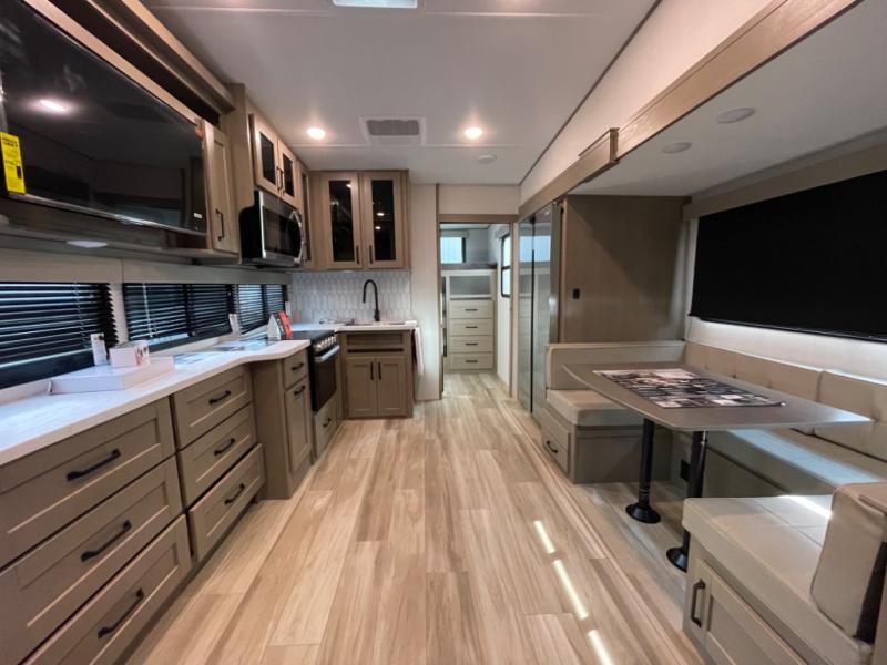 Inside, residential touches like premium Congoleum flooring, quality cabinetry, and refined window treatments elevate the overall feel, ensuring this coach feels like home wherever you camp.
