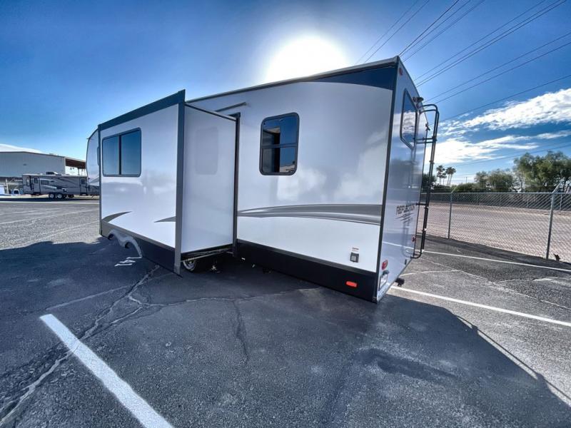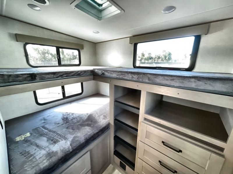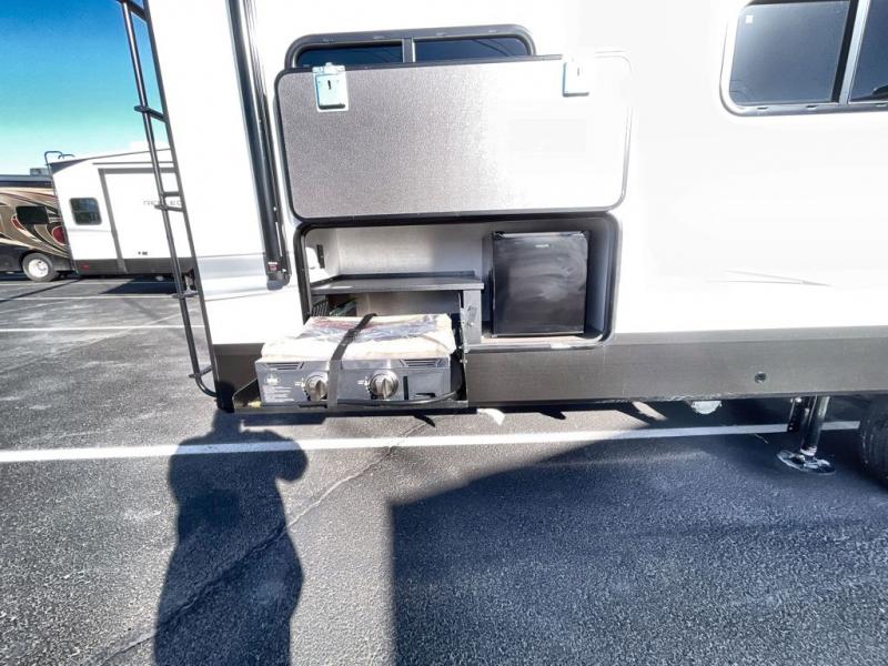The whole family will enjoy camping in this fifth wheel! The kiddos will love having their own privacy with the rear private bunkhouse that has a 30" top bunk above a set of drawers, a 34" top bunk above a 48" lower bunk, and a TV prep area. You will enjoy having your own private retreat too with a front private bedroom that has a queen bed for a good night's rest and a wardrobe for your hang up clothes. You could even transform the U-shaped dinette and tri-fold sofa into extra sleeping spaces, and the dinette could be switched out for the optional 78" theater seating. The chef will have an easy time preparing their best dishes with the three burner cooktop and flip-up countertop or they can breathe in some fresh air while they cook at the outside kitchen with a griddle and 1.6 cu. ft. refrigerator for a cold beverage!