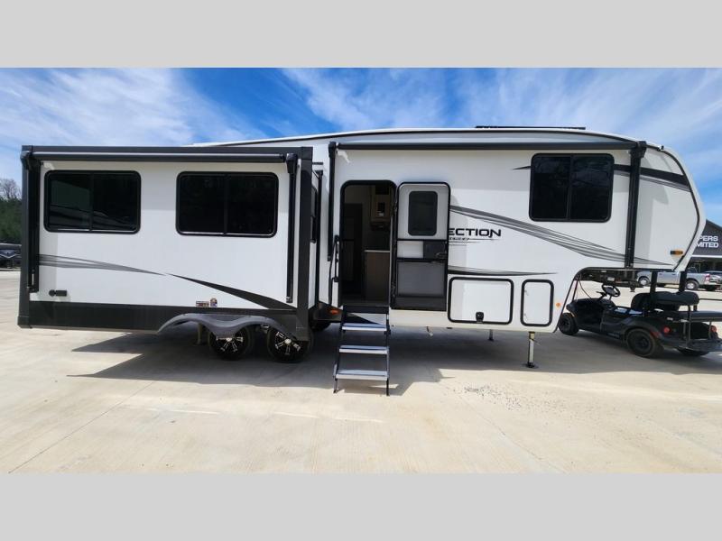 With any Reflection 150 Series fifth wheel by Grand Design, there is more available payload capacity and a broader range of half-ton trucks capable of towing this fifth wheel, and no slider hitch is needed thanks to the 90-degree turning radius which makes them short bed friendly and easier to tow. The mandatory Ultimate Power package provides a "One-Touch" automatic leveling system and a detachable power cord with LED light for easy setup, plus motion sensor pass-through lighting and entry lighting, and the Tire Linc TPMS will help you stay safe on the road. The interior offers residential luxury from the cabinetry and premium Congoleum flooring, to the booth dinette and residential-style window treatment. Make your refined decision today!